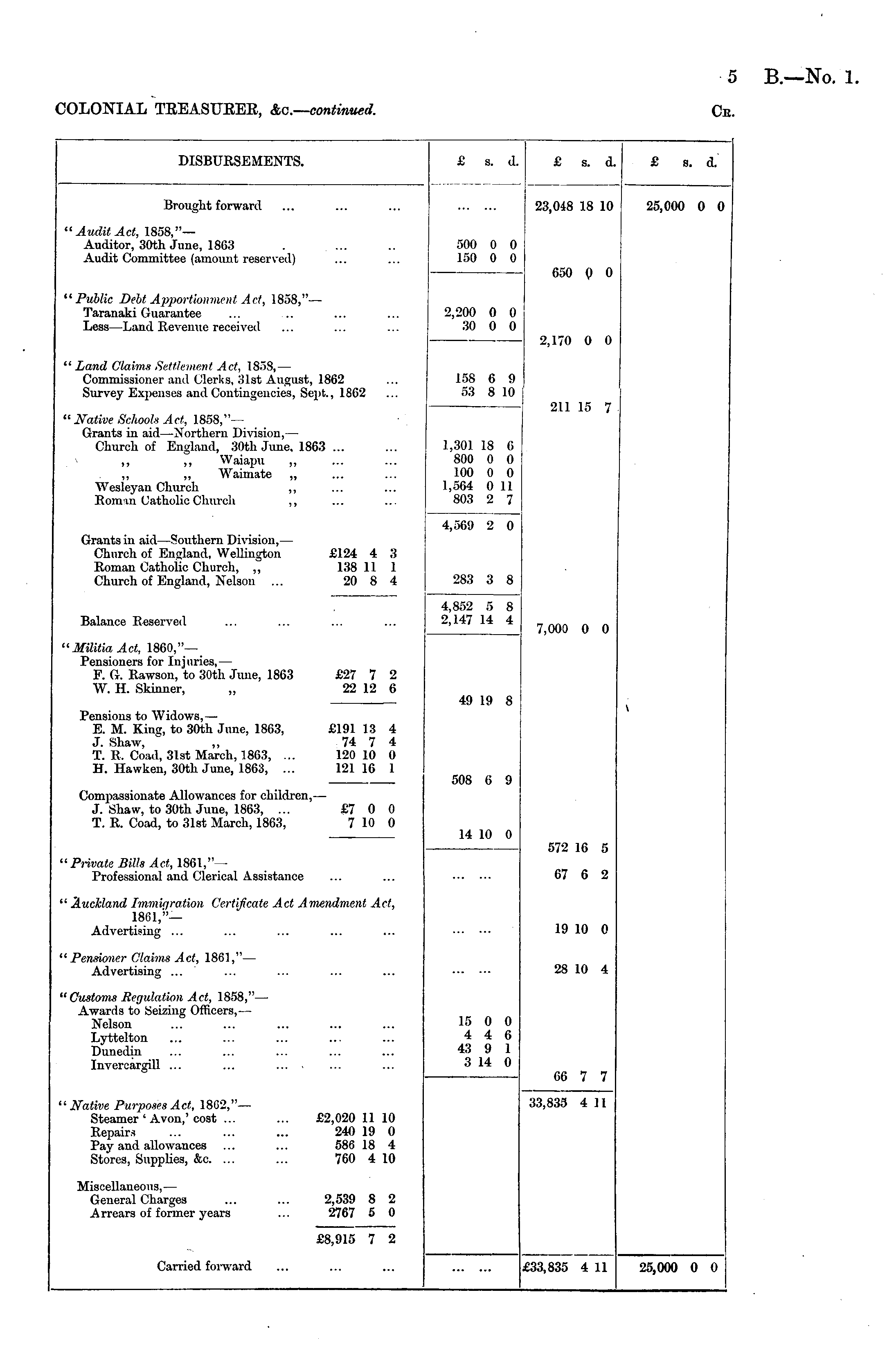 COLONIAL TKEASTJEEK, &c—continued. Ce, DISBURSEMENTS. £ s. d. £ s. d. £ s. d. Brought forward 23,048 18 10 25,000 0 0 "Audit Act, 1858,"— Auditor, 30th June, 1863 Audit Committee (amount reserved) 500 0 0 150 0 0 650 Q 0 "Public Debt Apportionment Act, 1858," — Taranaki Guarantee Less—Land Revenue received 2,200 0 0 30 0 0 2,170 0 0 " Land Claims Settlement Act, 1858,— Commissioner and Clerks, 31st August, 1862 Survey Expenses and Contingencies, Sept., 1862 158 6 9 53 8 10 | 211 15 7 " Native Schools Act, 1858,' — Grants in aid—Northern Division, — Church of England, 30th June, 1863 ... ,, ,, Waiapu ,, ,, „ Waimate „ Wesleyan Church ,, Roman Catholic Church ,, 1,301 18 6 800 0 0 100 0 0 1,564 0 11 803 2 7 Grants in aid—Southern Division, — Church of England, Wellington £124 4 3 Roman Catholic Church, ,, 138 11 1 Church of England, Kelson ... 20 8 4 4,569 2 0 283 3 8 Balance Reserved 4,852 5 8 2,147 14 4 7,000 0 0 "Militia Act, I860,"— Pensioners for Injuries,— F. G. Rawson, to 30th June, 1863 £27 7 2 W. H. Skinner, „ 22 12 6 Pensions to Widows, — E. M. King, to 30th June, 1863, £191 13 4 J. Shaw, "" ,, 74 7 4 T. R, Coad, 31st March, 1863, ... 120 10 0 H. Hawken, 30th June, 1863, ... 12116 1 49 19 8 508 6 9 Compassionate Allowances for children, — J. Shaw, to 30th June, 1863, ... £7 0 0 T. R. Coad, to 31st March, 1863, 7 10 0 14 10 0 "Private Bills Act, 1S61," — Professional and Clerical Assistance 572 16 5 67 6 2 " Auckland Immigration Certificate Act Amendment Act, 18(51,'"— Advertising ... 19 10 0 "Pensioner Claims Act, 1861," — Advertising ... 28 10 4 "Customs Regulation Act, 1858," — Awards to Seizing Officers, — Nelson Lyttelton Dunedin Invercargill ... ... 15 0 0 4 4 6 43 9 1 3 14 0 66 7 7 "Native Purposes Act, 1802," — Steamer'Avon,'cost ... ... £2,020 1110 Repairs ... ... ... 240 19 0 Pay and allowances ... ... 586 18 4 Stores, Supplies, &c. ... ... 760 4 10 33,835 4 11 Miscellaneous, — General Charges ... ... 2,539 S 2 A rrears of former years ... 2767 5 0 £8,915 7 2 Carried forward £33,835 4 11 25,000 0 0