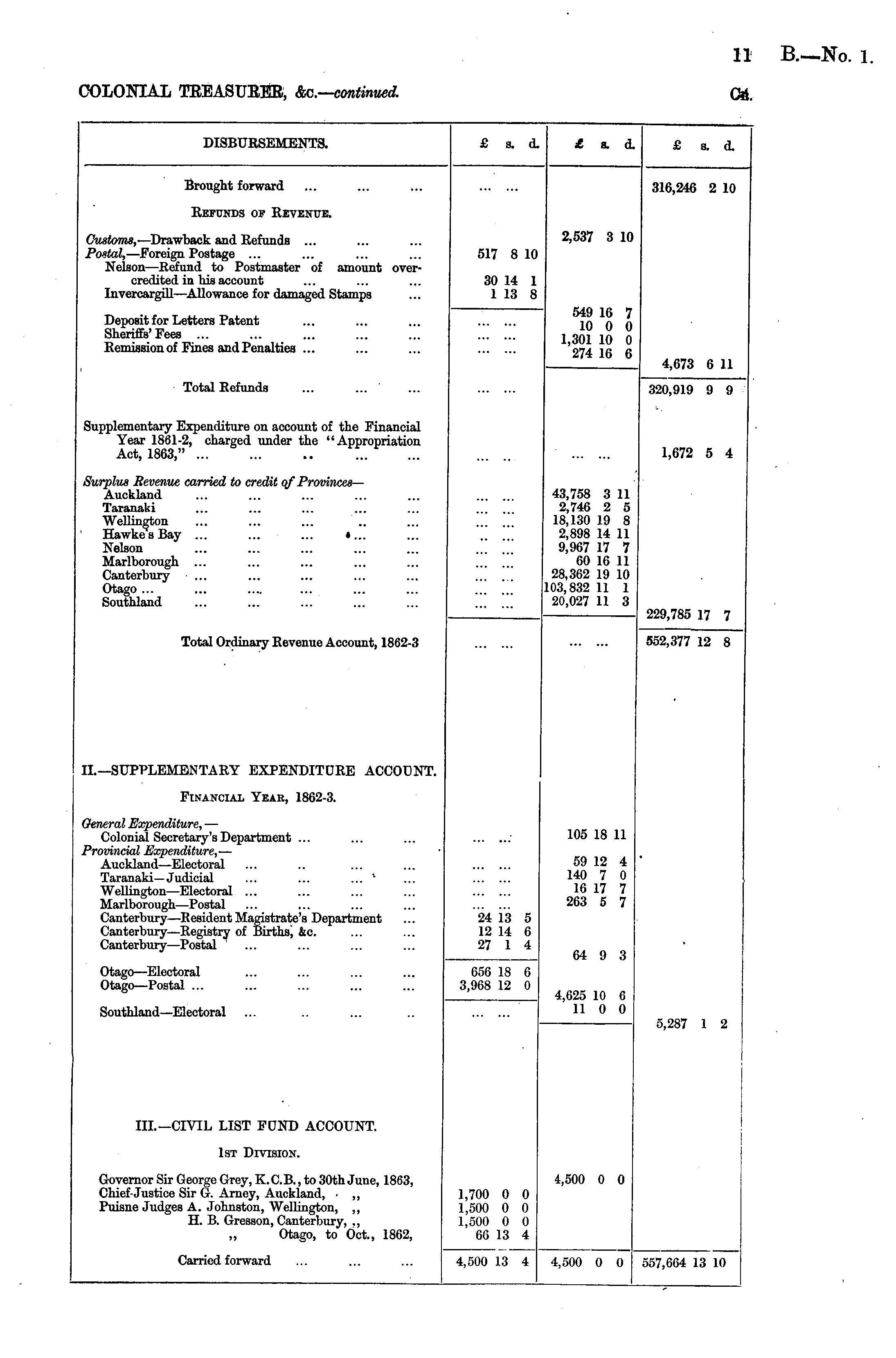 COLONIAL TREASUEEE, &a—continued. DISBURSEMENTS. £ s. d. £ x d. £ s. d. Brought forward 316,246 2 10 Refunds of Revenue. Customs, —Drawback and Refunds ... Postal, —Foreign Postage ... Neison—Refund to Postmaster of amount overcredited in his account Invercargill —Allowance for damaged Stamps 517 8 10 2,537 3 10 30 14 1 1 13 8 549 16 7 10 0 0 1,301 10 0 274 16 6 Deposit for Letters Patent Sheriffs'Fees Remission of Fines and Penalties ... 4,673 6 11 Total Refunds 320,919 9 9 Supplementary Expenditure on account of the Financial Year 1861-2, charged under the "Appropriation Act, 1863," 1,672 5 4 Surplus Revenue carried to credit of Provinces — Auckland Taranaki Wellington Hawke's Bay ... ... ... «... Nelson Marlborough ... Canterbury Otago ... Southland 43,758 3 11 2,746 2 5 18,130 19 8 2,898 14 11 9,967 17 7 60 16 11 28,362 19 10 103,832 11 1 20,027 11 3 229,785 17 7 Total Ordinary Revenue Account, 1862-3 552,377 12 8 IL—SUPPLEMENTARY EXPENDITURE ACCOUNT. Financial Year, 1862-3. General Expenditure, — Colonial Secretary's Department ... Provincial Expenditure, — Auckland—Electoral Taranaki—Judicial ... ... ... l Wellington—Electoral ... Marlborough—Postal Canterbury—Resident Magistrate's Department Canterbury—Registry of Births j &c. Canterbury —Postal 105 18 11 59 12 4 140 7 0 16 17 7 263 5 7 24 13 5 12 14 6 27 1 4 64 9 3 Otago —Electoral Otago—Postal ... 656 18 6 3,968 12 0 4,625 10 6 11 0 0 Southland—Electoral 5,287 1 2 \ III.—CIVIL LIST FUND ACCOUNT. 1st Division. Governor Sir George Grey, K. C. B., to 30th June, 1863, Chief-Justice Sir G. Arney, Auckland, ■ „ Puisne Judges A. Johnston, Wellington, ,, H. B. Gresson, Canterbury, ., ,, Otago, to Oct., 1862, 1,700 0 0 1,500 0 0 1,500 0 0 66 13 4 4,500 0 0 Carried forward 4,500 13 4 4,500 0 0 557,664 13 10