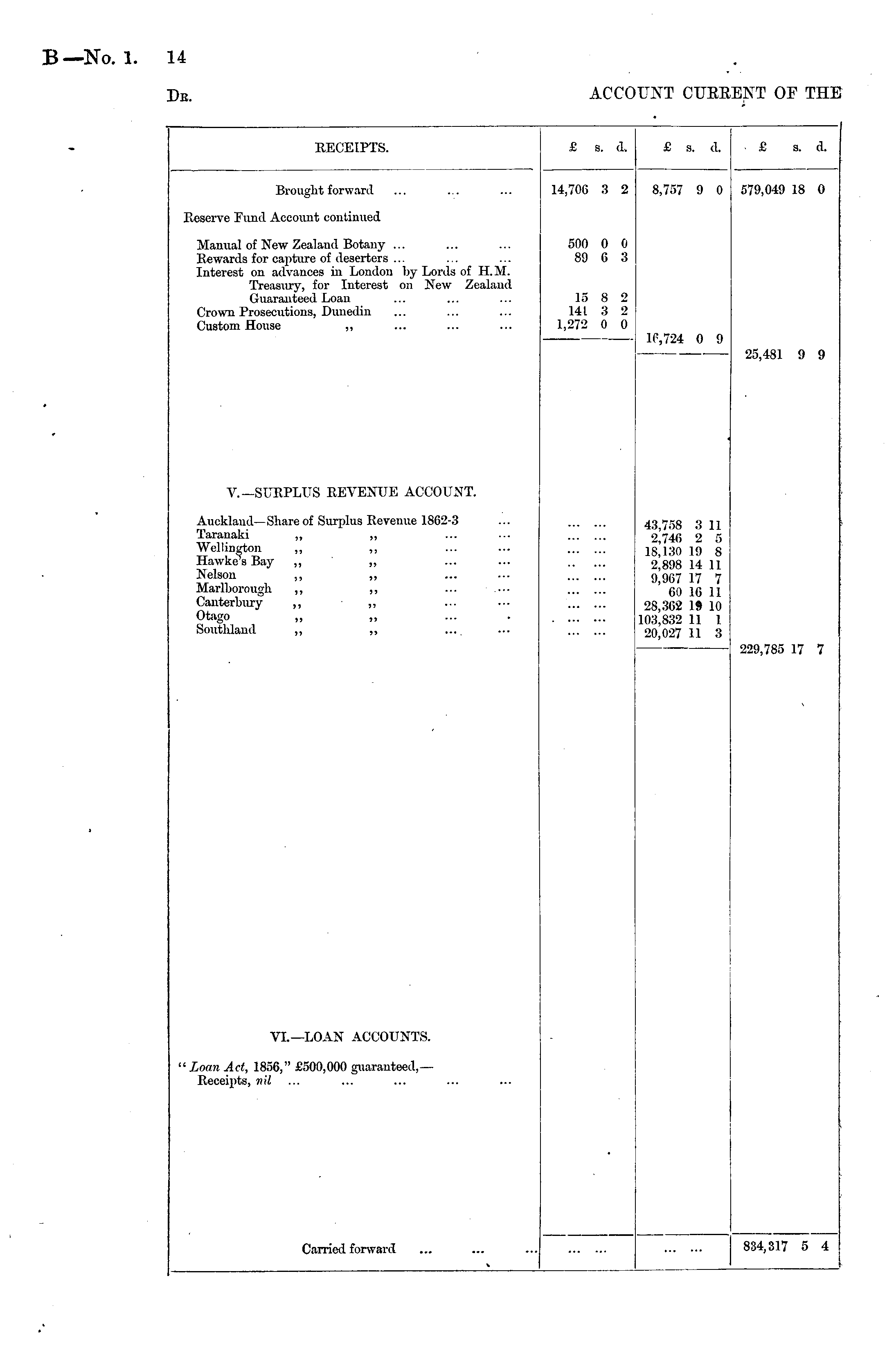 IB. ACCOUNT CUE _ENT OF TH: RECEIPTS. £ s. d. £ s. d. ■ £ s. d. Brought forward 14,700 3 2 8,757 9 0 579,049 18 0 Reserve Fund Account continued Manual of New Zealand Botany ... Rewards for capture of deserters ... Interest on advances in London by Lords of H.M. Treasury, for Interest on New Zealand Guaranteed Loan Crown Prosecutions, Dunedin Custom House ,, 500 0 0 89 6 3 15 8 2 141 3 2 1,272 0 0 16,724 0 9 25,481 9 9 V.—SURPLUS REVENUE ACCOUNT. Auckland—Share of Surplus Revenue 1862-3 Taranaki ,, „ Wellington „ ,, Hawke's Bay ,, „ Nelson ,, ,, Marlborough ,, ,, ... ■ .••• Canterbury ,, ,, Otago ,, ,, Southland ,, „ 43,758 3 11. 2,746 2 5 18,130 19 8 2,898 14 11 9,907 17 7 60 16 11 28,362 19 10 103,832 11 1 20,027 11 3 229,785 17 7 VI.—LOAN ACCOUNTS. " Loan Act, 1S56," £500,000 guaranteed,— Receipts, nil Carried forward I 834,317 5 4