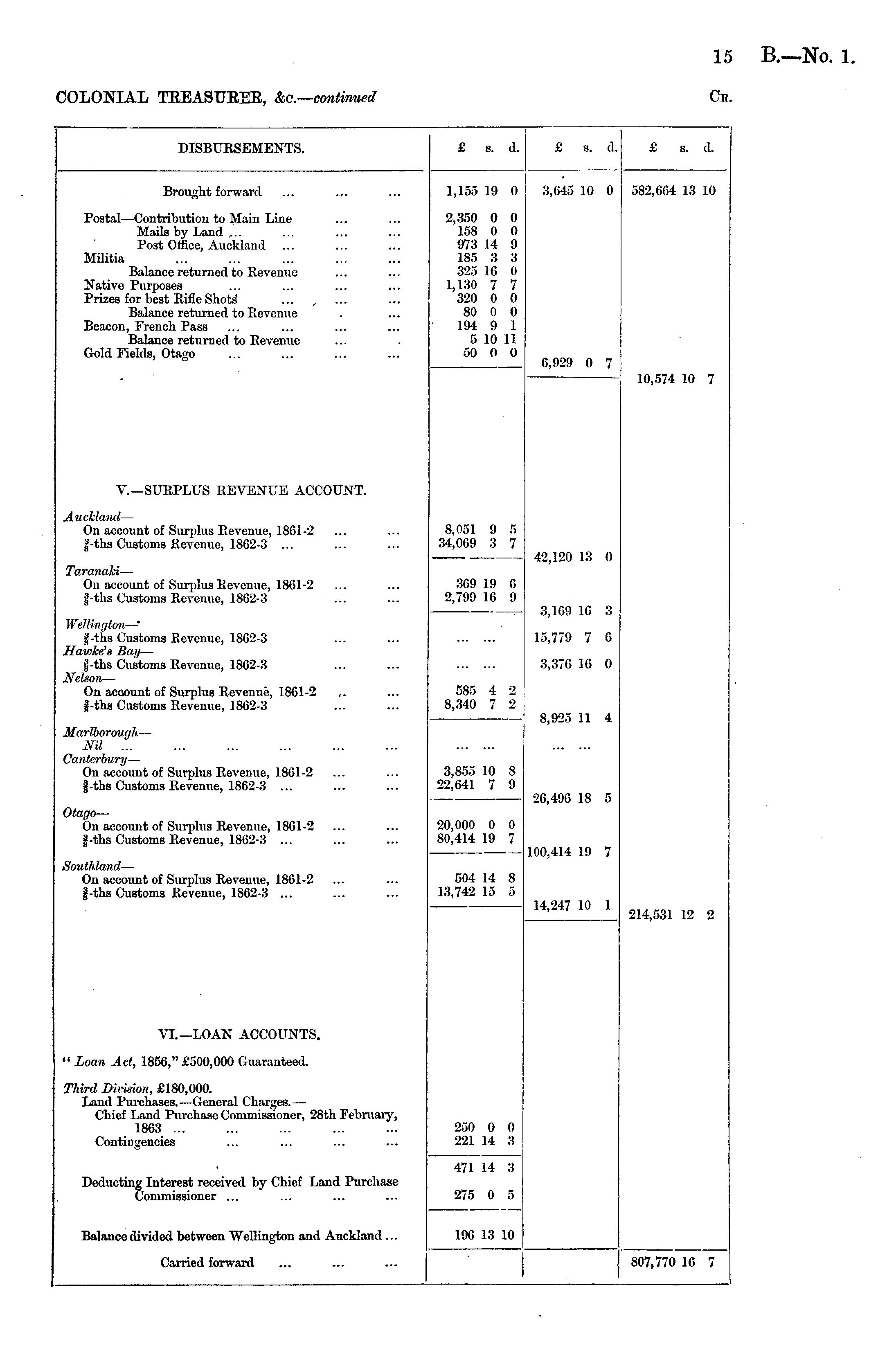 COLONIAL TEEASUEEE, &c—continued Ch. DISBURSEMENTS. £ s. d. £ s. d. £ s. d. Brought forward 1,155 19 0 3,645 10 0 582,604 13 10 Postal—Contribution to Main Line Mails by Land ... Post Office, Auckland 2,350 0 0 158 0 0 973 14 9 185 3 3 325 16 0 1,130 7 7 320 0 0 80 0 0 194 9 1 5 10 11 50 0 0 Militia Balance returned to Revenue Native Purposes Prizes for best Rifle Shots' ... . Balance returned to Revenue Beacon, French Pass Balance returned to Revenue Gold Fields, Otago 6,929 0 7 10,574 10 7 V.—SURPLUS REVENUE ACCOUNT. Auckland — On account of Surplus Revenue, 1861 -2 f-ths Customs Revenue, 1862-3 ... 8,051 9 5 34,069 3 7 Taranaki — On account of Surplus Revenue, 1861-2 f-ths Customs Revenue, 1862-3 42,120 13 0 369 19 6 2,799 16 9 3,109 16 3 Wellington —* jj-ths Customs Revenue, 1S62-3 Havre's Bay — f-ths Customs Revenue, 1862-3 Nelson — On account of Surplus Revenue, 1861-2 f-ths Customs Revenue, 1862-3 15,779 7 6 3,376 16 0 585 4 2 8,340 7 2 S,925 11 4 Marlborough — Ml Canterbury — On account of Surplus Revenue, 1861-2 f-ths Customs Revenue, 1862-3 3,855 10 S 22,641 7 9 20,496 IS 5 Otago — On account of Surplus Revenue, 1861-2 f-ths Customs Revenue, 1862-3 ... 20,000 0 0 80,414 19 7 100,414 19 7 Southland — On account of Surplus Revenue, 1861-2 f-ths Customs Revenue, 1862-3 ... 504 14 8 13,742 15 5 14,247 10 1 214,531 12 2 VI.—LOAN ACCOUNTS. " Loan Act, 1856," £500,000 Guaranteed. Third Division, £1SO,000. Laud Purchases.—General Charges.— Chief Land Purchase Commissioner, 28th February, 1863 Contingencies 250 0 0 221 14 3 471 14 3 Deducting Interest received by Chief Land Purchase Commissioner ... 275 0 8 Balance divided between Wellington and Auckland ... 196 13 10 Carried forward 807,770 16 7