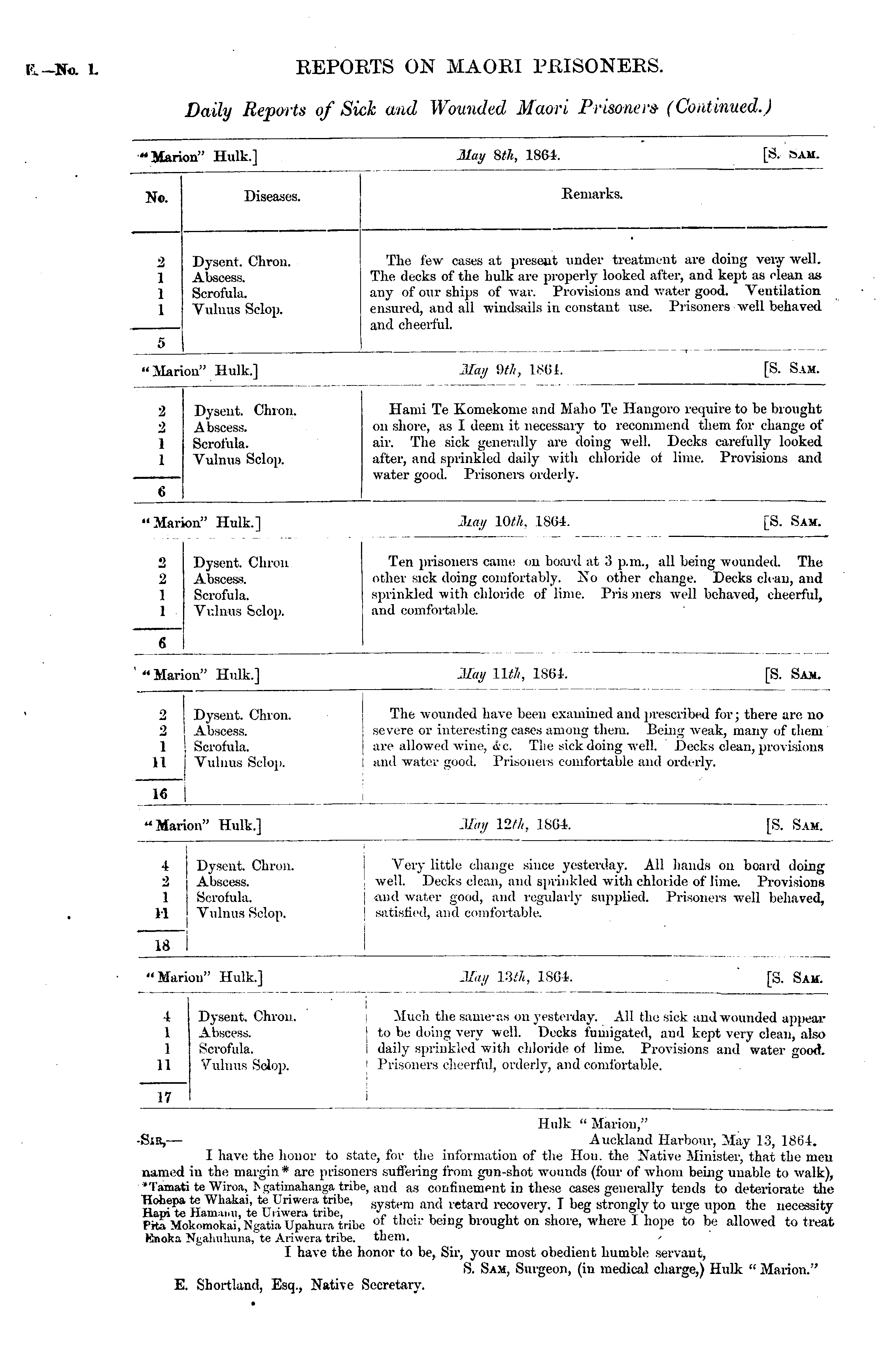 Daily Reports of Sick and Wounded Mauri Prisoners- (Continued.) "Mai ion" Hulk.] May m, 1864. [S. ftAM. No. Diseases. Remarks. 2 1 ! 1 Dysent. Chron. Abscess. Scrofula. Vuluus Sclop. The few cases at present under treatment are doing very well. The decks of the hulk are properly looked after, and kept as dean as any of our ships of war. Provisions and water good. Ventilation ensured, and all windsails in constant use. Prisoners well behaved and cheerful. "Mai ion" Hulk.] J/ai/ 9th, ISO!. [S. Sam. [S. Sam. ■» ■> I 1 Dysent. Chron, A bscess. Scrofula. Vulnus Sclop. Hami Te Komekome and Maho Te Haugoro require to be brought on shore, as I deem it necessary to recommend them for change of air. The sick generally are doing well. Decks carefully looked after, and sprinkled daily with chloride of lime. Provisions and water good. Prisoners orderly. " Mari Mai irioa," Hulk.] .n" Hulk.] May 10th. 1864. [S. Sam. [S. Sam. •2 2 1 1 •2 2 1 1 Dysent. Chron Abscess. Scrofula. Vulnus &clop. Dysent. Chron Abscess. Scrofula. Vr.lnus feclop. Ten prisoners came on board at 3 p.m., all being wounded. The other sick doing comfortably. Xo other change. Decks clean, and sprinkled with chloride of lime. Prisoners well behaved, cheerful, and comfortable. 6_ " Mari Mai trion" Hulk.] ion" Hulk.] May lltli, 1864. [S. Sam. [S. Saj*. 2 2 1 H 1G Dysent. Chron. ! Abscess. i Scrofula. j Vulnus Sclop. 1 The wounded have been examined and prescribed for; there are, no severe or interesting cases among them. Being weak, many of them are allowed wine, &c. The sick doing well. Decks clean, provisions and water good. Prisoners comfortable and orderly. - "Marion" Hulk.] May 12/7,, 1S64. [S. Sam. 4 a 1 11 Dysent. Chron. Abscess. Scrofula. Vulnus Sclop. Very little change since yesterday. All bands on board doing well. Decks clean, and sprinkled with chloride of lime. Provisions ■and water good, and regularly supplied. Prisoners well behaved, satisfied, and comfortable. 18 " Mari ion" Hulk.] m" Hulk.] May IZth, 1864. . [S. Sam. May T&ih, 1864. 4 1 ! ■A Dysent. Chron. Abscess. Scrofula. Vuhuis Solop. Much the Bame-as on yesterday. All the sick and wounded appear to be doing very well. Docks fumigated, and kept very clean, also daily sprinkled with chloride of lime. Provisions and water good. Prisoners cheerful, orderly, and comfortable. 17 Hulk "Marion," •S;a, — Auckland Harbour, May 13, LStJi. I have the honor to state, for the information of the Hon. the Native .Minister, that the men named iu the margin * arc prisoners suffering from gun-shot wounds (four of whom being unable to walk), 'Tamati te Wirori, tribe, aiul as confinement in these cases generally tends to deteriorate the Hohepa te Whakai, te Uriwera tribe, systt , nl aw i letar( ] recovel y. I beg strongly to urge upon the necessity Ham te Haniiu.H, te Uriwera tribe, J» .•/ . , . v ,. , ° , j. i n i Pita Mokomokai.N-atiaUpahura tribe of t!l0;:" be)ng brought on shore, where I hope to be allowed to treat >£noka Ngalmluina, te Ariwera tribe. them. ' I have the honor to be, Sir, your most obedient humble servant, S. Sam, Surgeon, (in medical charge,) Hulk " Marion.'' E. Shortland, Esq., Native Secretary.