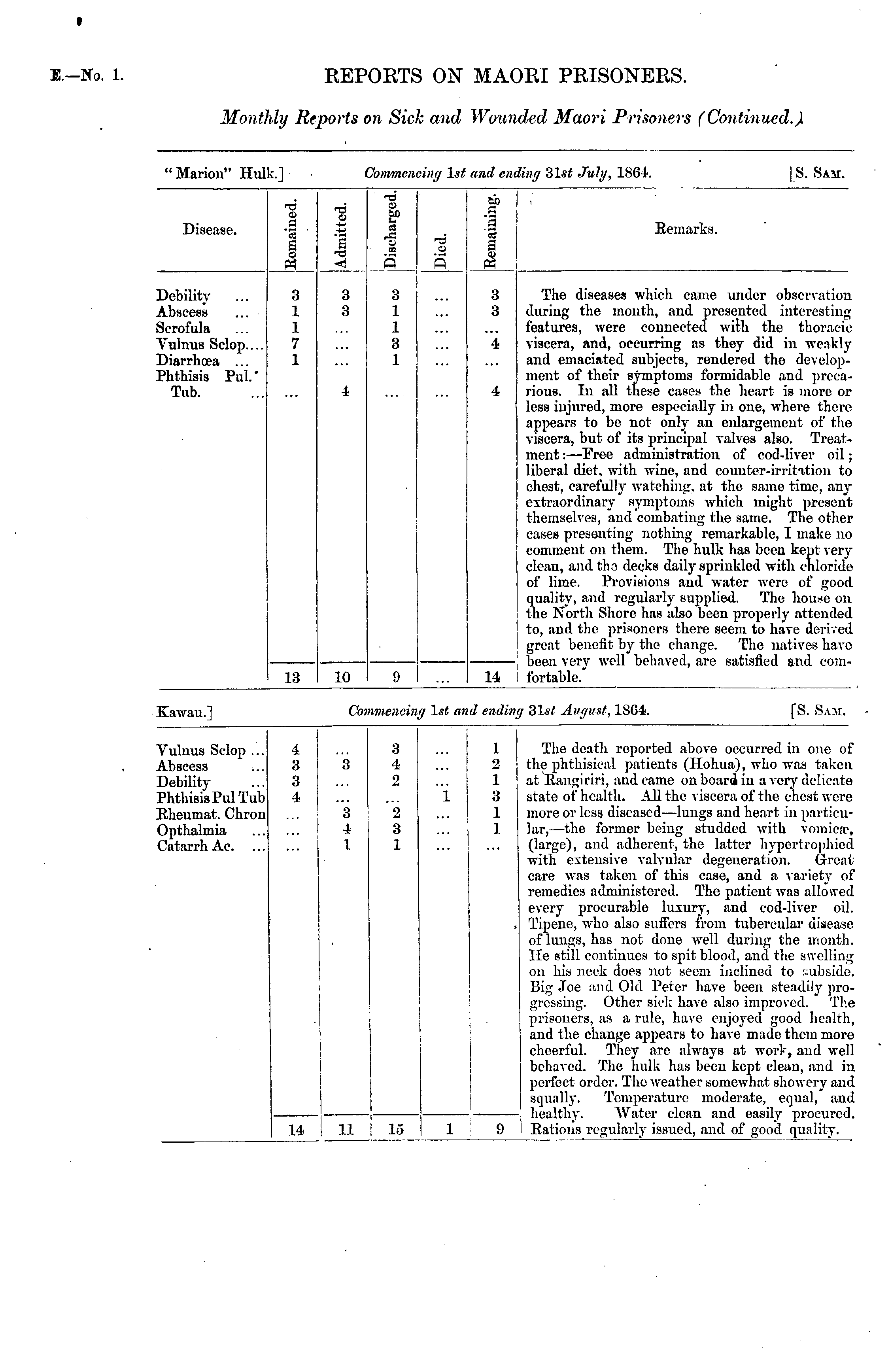 Monthly Reports on Sick and Wounded Maori Prisoners (Continued.). "Marion" Hull k.]fommeiu ing 1st and em \mg 31s/ July, 1864. 18. 8am. Disease. t "5 a I 1 -6 9 | 3 IT. 5 sir, I Eemarks. 5 Debility ... Abscess Scrofula Yulnus Sclop.... Diarrhoea ... Phthisis Pul.' Tub. 8 1 1 7 1 3 4 3 1 1 8 1 3 3 4 4 The diseases which came under observation during the month, and presented interesting features, were connected with the thoracic viscera, and, occurring as they did in weakly and emaciated subjects, rendered the development of their symptoms formidable and precarious. In all these cases the heart is more or less injured, more especially in one, where there appears to be not only an enlargement of the viscera, but of its principal valves also. Treatment : —IVee administration of cod-liver oil; liberal diet, with wine, and counter-irritation to chest, carefully watching, at the same time, any extraordinary symptoms which might present themselves, and combating the same. The other cases presenting nothing remarkable, I make no comment on them. The hulk has been kept very clean, and tho decks daily sprinkled with chloride of lime. Provisions and water were of good quality, and regularly supplied. The house on the North Shore lias also been properly attended to, and the prisoners there seem to have derived great benefit by the change. The natives have been very well behaved, are satisfied and comfortable. 18 10 \\ Kawau.] On wienein 1st an \d ending 3Is/ Auffutt, 1SG4. [S. Sam. Vuluus Sclop ... Abscess Debility Phthisis Pul Tub Eheumat. Chron Opthalmia Catarrh Ac. 4 3 3 4 3 3 4 •2 i 1 2 1 3 1 1 The death reported above occurred in one of the phthisical patients (Hohua), who was taken at Kangiriri, and came on board in a very delicate stato of health. All the viscera of the chest were more or less diseased —lungs and heart in particular, —the former being studded with vomicce, (large), and adherent, the latter hypertrophieil with extensive valvular degeneration. Great care was taken of this case, and a variety of remedies administered. The patient was allowed every procurable luxury, and cod-liver oil. Tipenc, who also sutlers from tubercular disease of lungs, has not done well during the month. He still continues to spit blood, and the swelling on his neck does not seem inclined to subside. Big .Toe and Old Peter have been steadily progressing. Other rick have also improved. The prisoners, as a rule, have enjoyed good health, and the change appears to have made them more cheerful. They are always at work, and well behaved. The hulk has been kept clean, and in perfect order. The weather somewhat showery and Bqually. Temperature moderate, equal, and healthy. Water clean and easily procured. Rations regularly issued, and of good quality. 3 4 1 '2 :s 1 14 11 15