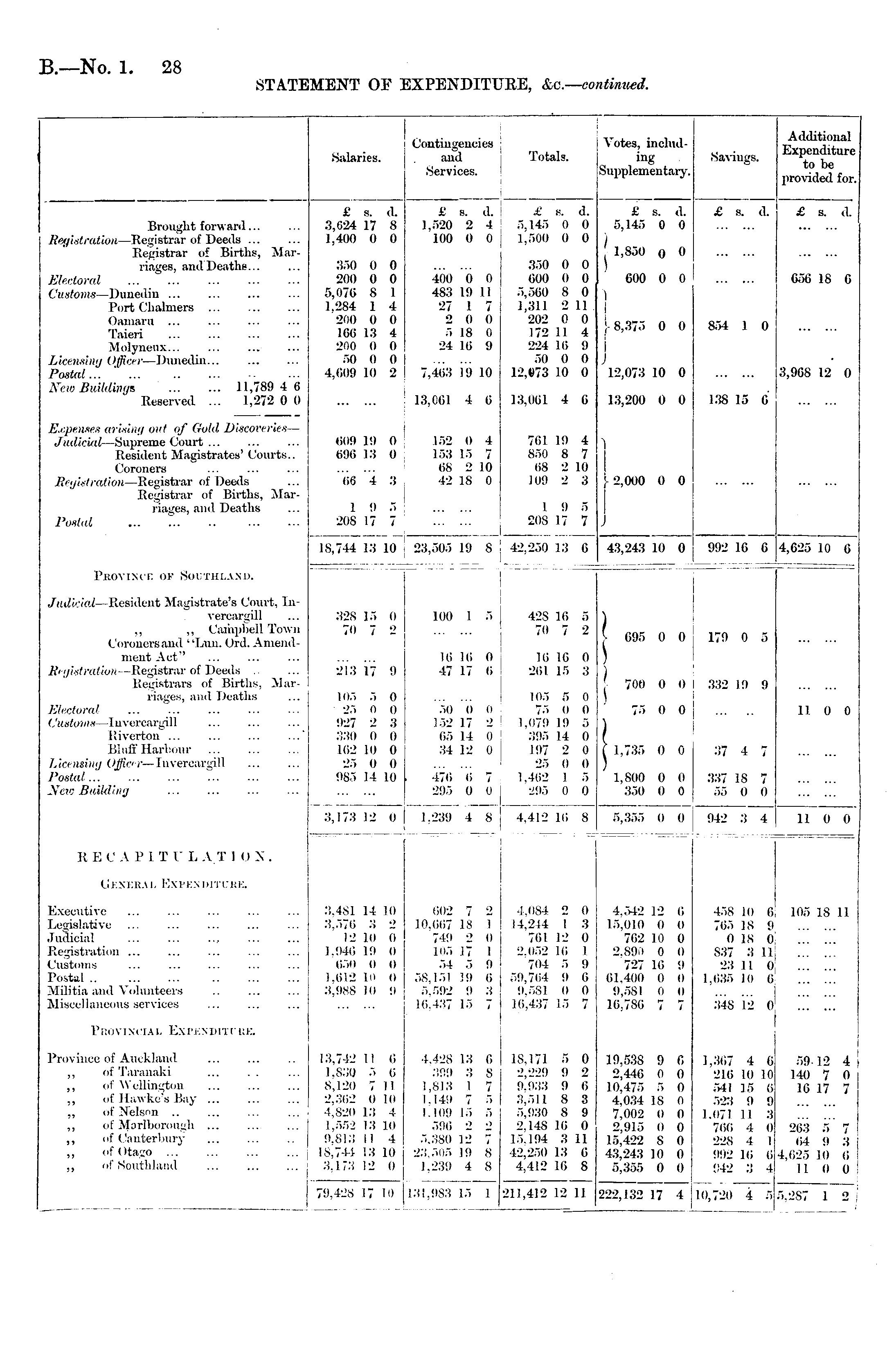 STAT 1MENT OF EXPENDITURE, &c—continued. Salaries. Contingencies and Services. Totals. Votes, including Supplementary. Savings. Additional Expenditure to be provided for. Brought forward... Registration —Registrar of Deeds ... Registrar of Births, Marriages, and Deaths... £ s. d. 3,624 17 8 1,400 0 0 £ s. d. 1,520 2 4 100 0 0 £ s. d. 5,145 0 0 1,500 0 0 £ s. d. 5,145 0 0 £ s. d. £ s. d. 1,850 0 0 Electoral Customs —Dunedin Port Chalmers Oamaru ... Taieri Molyneux... Licensing Officer —Dunedin... Postal... New Buildings 11,789 4 6 Reserved ... 1,272 0 0 350 0 0 200 0 0 5,076 8 1 1.284 1 4 200 0 0 I CO 13 4 200 0 0 50 0 0 4,609 10 2 400 0 0 483 19 11 27 1 7 2 0 0 5 18 0 24 10 9 350 0 0 600 0 0 5,500 8 0 1,311 2 11 202 0 0 172 11 4 224 16 9 50 0 0 12,073 10 0 600 0 0 . j- 8,375 0 0 i J 12,073 10 0 854 1 0 656 18 6 7,463 19 10 3,968 12 0 13,061 4 6 13,061 4 6 13,200 0 0 138 15 0 Expenses arising out if Gold. Discoveries Judicial —Supreme Court ... Resident Magistrates' Courts.. Coroners Rigi.-tration —Registrar of Deeds Registrar of Births, Marriages, and Deaths 609 111 0 696 13 0 152 0 4 153 15 7 68 2 10 42 18 0 761 19 4 850 8 7 08 2 10 109 2 3 j 2,000 0 0 J 68 4 3 1 0 5 208 17 7 1 9 5 208 17 7 Postal 1S.744 13 10 23,505 19 8 j Provim i: OF Sol Tin.and. 42,250 13 6 43,243 10 0 ! 992 16 6 4,625 10 6 Judicial —Resident Magistrate's Court. Invercargill „ ,, Campbell Town Coroners and "Lun. Ord. Amendment Act'' Registration Registrar of Deeds Registrars of Births. Marriages, and Deaths 328 15 0 70 7 2 100 1 5 10 10 0 47 17 0 42S 16 5 70 7 2 k; 10 0 261 15 3 ) > 695 0 0 179 0 5 213 17 0 700 0 0 332 19 9 Electorcd Customs —Invercargill Riverton ... ... ... ...' Bluff Harbour Licensing Officer —Invercargill Postal... New Building lo.", 5 0 25 0 0 927 2 3 330 0 0 102 10 0 25 0 0 985 14 10 .",<) 0 0 152 17 2 05 14 0 34 12 0 105 5 0 75 0 0 1,070 1!) 5 305 14 0 197 2 0 25 0 0 1,402 1 5 295 0 0 75 0 0 f 1.735 0 0 37 4 7 11 0 0 476 6 7 205 0 0 1,800 0 0 350 0 0 337 IS 7 r>r, 0 0 3,173 12 (I 1,230 4 8 4,412 16 8 5,355 0 0 042 3 4 11 0 0 R EC A P i T I" LA TION. ERAi Expenditure. Executive Legislative Judicial Registration ... Customs Postal Militia and Volunteers Miscellaneous services 3,481 14 10 3,576 3 2 12 10 0 1.040 10 0 650 (I 0 1,612 10 0 3,988 10 0 002 7 2 10,067 18 1 740 2 0 105 17 1 54 5 •> 58,15) 19 6 5,592 9 3 H;.4:'7 15 7 4,084 2 0 14,244 1 3 761 12 0 2.1152 10 1 704 5 !) 50,704 II 0 9,581 0 0 16,437 15 7 4.542 12 (i 15,010 0 0 762 10 0 2.890 0 0 727 16 9 01.400 0 0 9,581 0 11 16,780 7 7 458 10 6 705 IS 9 0 IS 0 837 3 ll! 2,'i 11 a 1,636 10 0 105 18 11 348 12 0 Provincial Es-Penditi re. Province of Auckland ,, of Taranaki ... . . ,, of Wellington ,, of Hawke's Bay ... „ of Kelson .. ,, of Marlborough ... ,, of Canterbury ,, of Otago ,, of Southland 13,742 11 (i 1,830 5 6 8,120 7 11 2,362 0 10 I 13 4 1,552 13 10 0.813 11 4 13 10 3,173 12 0 70,428 17 10 4.428 13 6 ,",!l!l 3 8 1,813 1 7 1,140 7 5 1.109 15 5 596 2 2 5,380 12 7 23,505 19 8 1.230 4 8 18,171 5 0 2,220 9 2 0.033 9 6 3.511 8 3 5,030 8 9 2,148 16 0 15.104 3 11 42,250 13 6 4,412 16 8 19,538 9 6 2,446 0 0 10.475 5 0 4,034 18 0 7,002 0 0 2,915 0 0 15,422 8 0 43,243 10 0 5,355 0 0 1,367 4 6 216 10 10 541 15 6 523 9 9 1.071 II 3 70(i 4 0 22S 4 1 992 Ki (> 942 3 4 5912 4 140 7 0 16 17 7 263 5 7 64 9 3 4,<i25 10 6 110 0 131,083 15 1 211,412 12 11 10,720 4 5 222,132 17 4 5,2S7 1 2