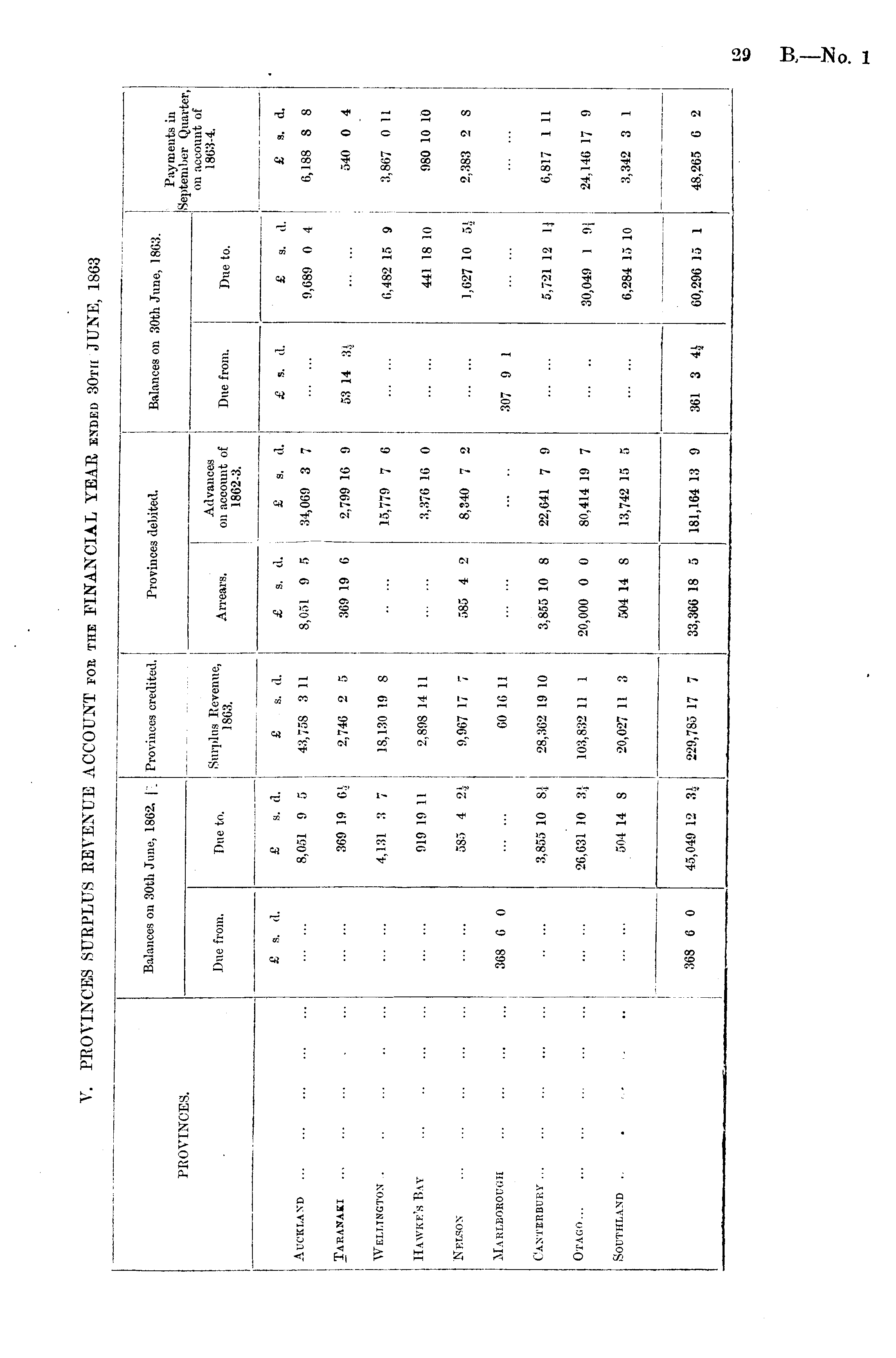 Balances on 30th June, 1862, | '■_ Provinces credited. Provinces debited. Balances on 30th June, 1863. PROVINCES. Due from. Due to. Surplus Revenue, 1803, Arrears. Advances on account of 1862-3. Payments in .September Quarter, on account of 1863-4. Due from. Due to. £ s. d. £ s. d. £ s. d. 9,689 0 4 6,188 S 8 Due from. £ s. d. £ s. d. £ s. d. £ s. d. £ s. d. £ s. d. Auckland 8,051 9 5 43,758 3 11 8,051 9 5 34,069 3 7 Taranaki 369 19 61 2,746 2 5 369 19 6 2,799 16 9 53 14 34 53 14 3,i 540 0 4 Wellington .. 4,131 3 7 18,130 19 S 15,779 7 6 6,482 15 9 .'S,S67 0 11 Hawke's Bay 919 19 11 2,898 14 11 •V176 16 0 441 18 10 980 10 10 Nfxson 585 4 2i 9,967 17 7 585 4 2 8,340 7 2 1,627 10 5i 2,383 2 S Marleorough 368 6 0 60 10 11 307 9 1 307 9 1 Canterbury ... 3,855 10 Sj 28,362 19 10 3,855 10 8 22,641 7 9 5,721 12 Ij 6.S17 I 11 Otago 26,631 10 3j 103,832 11 1 20,000 0 0 80,414 19 7 30,049 1 9] ' 24,146 17 9 Southland .. 504 14 S 20,027 11 3 504 14 8 13,742 15 5 6,284 15 10 3,342 3 1 368 6 0 45,049 12 3J 229,785 17 7 33,366 18 5 181,164 13 9 361 3 4.J 60,296 15 1 48,265 6 2 361 3 4.J 60,296 15 1