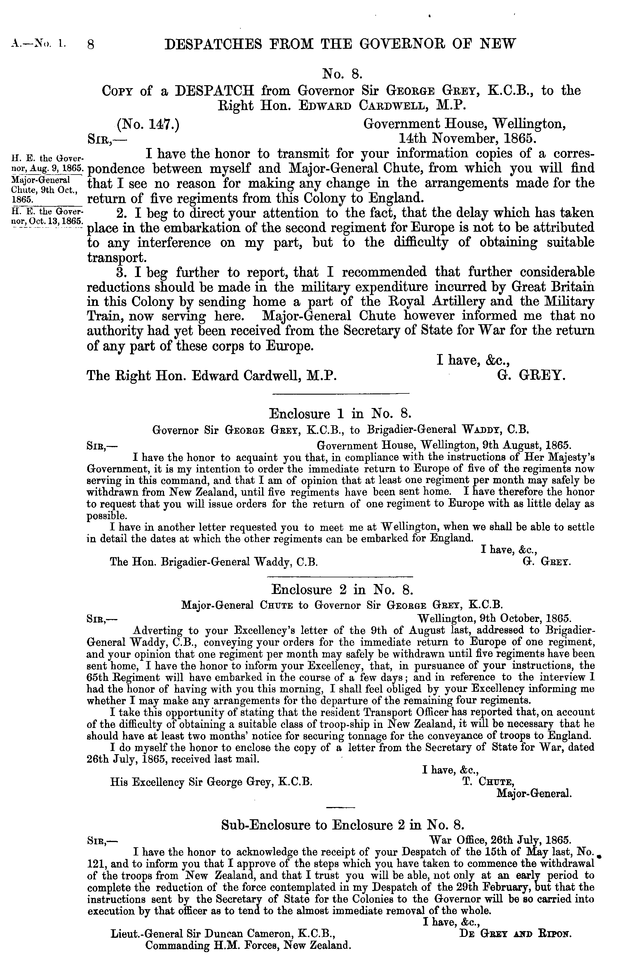 No. 8. Copy of a DESPATCH from Governor Sir George Grey, X.C.8., to the Right Hon. Edward Cardwell, M.P. (No. 147.) Government House, Wellington, Sir, — 14th November, 1865. I have the honor to transmit for your information copies of a correspondence between myself and Major-General Chute, from which you will find that I see no reason for making any change in the arrangements made for the return of five regiments from this Colony to England. 2. I beg to direct your attention to the fact, that the delay which has taken place in the embarkation of the second regiment for Europe is not to be attributed to any interference on my part, but to the difficulty of obtaining suitable transport. 3. I beg further to report, that I recommended that further considerable reductions should be made in the military expenditure incurred by Great Britain in this Colony by sending home a part of the Royal Artillery and the Military Train, now serving here. Major-General Chute however informed me that no authority had yet been received from the Secretary of State for War for the return of any part of these corps to Europe. I have, &c, The Right Hon. Edward CardweU, M.P. G. GREY.