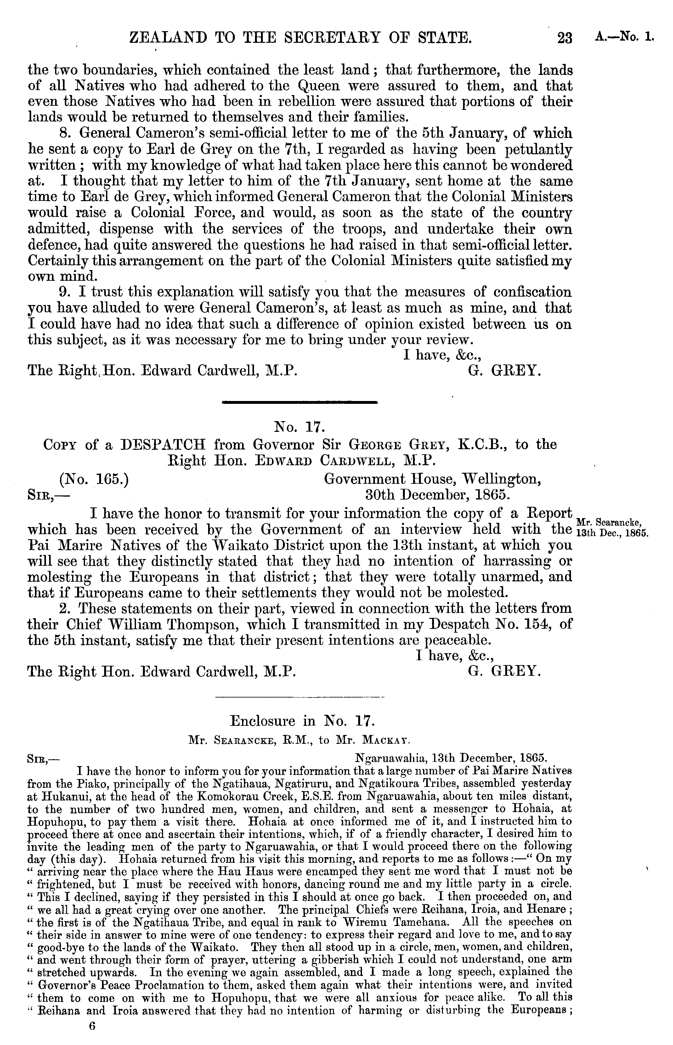 No. 17. Copy of a DESPATCH from Governor Sir George Grey, X.C.8., to the Right Hon. Edward Cardwell, M.P. (No. 165.) Government House, Wellington, Sir, — 30th December, 1865. I have the honor to transmit for your information the copy of a Report which has been received by the Government of an interview held with the Pai Marire Natives of the Waikato District upon the 13th instant, at which you will see that they distinctly stated that they had no intention of harrassing or molesting the Europeans in that district; that they were totally unarmed, and that if Europeans came to then* settlements they would not be molested. 2. These statements on their part, viewed in connection with the letters from their Chief William Thompson, which I transmitted in my Despatch No. 154, of the sth instant, satisfy me that their present intentions are peaceable. I have, &c, The Right Hon. Edward Cardwell, M.P. G. GREY.