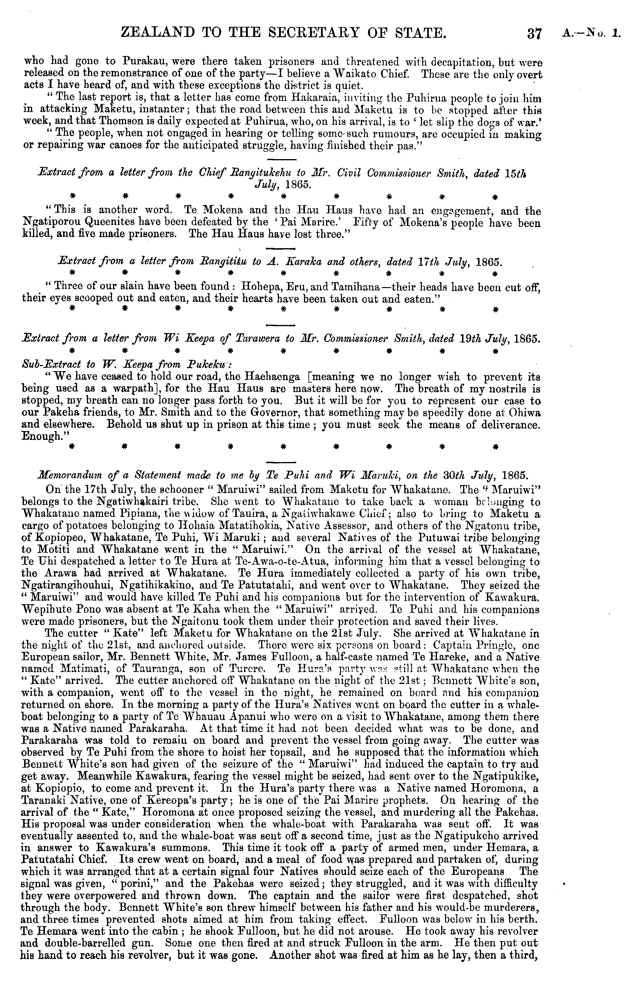 who had gone to Purakau, were there taken prisoners and threatened with decapitation, but were released on the remonstrance of one of the party —I believe a AYaikato Chief. These are the only overt acts I have heard of, and with these exceptions the district is quiet. " The last report is, that a letter has come from Hakaraia, inviting the Puhirua people to join him in attacking Maketu, instanter; that the road between this and Maketu is to be stopped after this week, and that Thomson is daily expected at Puhirua, who, on his arrival, is to ' let slip the dogs of war.' " The people, when not engaged in hearing or telling some such rumours, arc occupied in making or repairing war canoes for the anticipated struggle, having finished their pas." Extract from a letter from the Chief Rangitukehu to Mr. Civil Commissioner Smith, dated 15th July, 1865. ********* " This is another word. Te Mokena and tho Hau Haus have had an engagement, and the Ngatiporou Queenites have been defeated by the ' Pai Marire.' Fifty of Mokena's people have been killed, and five made prisoners. The Hau Haus have lost three." Extract from a letter from Rangititu to A. Karaka and others, dated 17th July, 1865. ********* " Three of our slain have been found : Hohepa, Eru, and Tamihana—their heads have been cut off, their eyes scooped out and eaten, and their hearts have been taken out and eaten." ********* Extract from a letter from Wi Keepa of Tarawera to Mr. Commissioner Smith, dated 19th July, 1565. ********* Sub-Extract to W. Keepa from Pukeku : "We have ceased to hold our road, the Haehaenga [meaning we no longer wish to prevent its being used as a warpath], for the Hau Haus are masters here now. The breath of my nostrils is stopped, my breath can no longer pass forth to you. But it will be for you to represent our case to our Pakeha friends, to Mr. Smith and to the Governor, that something maybe speedily done at Ohiwa and elsewhere. Behold us shut up in prison at this time ; you must seek the means of deliverance. Enough." ********* Memorandum of a Statement made to me by Te Puhi and Wi Maruki, on the %Oth July, 1865. On the 17th July, the schooner " Maruiwi" sailed from Maketu for AVhakatane. The '' Maruiwi" belongs to the Ngatiwhakairi tribe. She went to Whakatane to take back a woman belonging to AVhakatane named Pipiana, the widow of Tauira, a Ngatiwhakawe Chief; also to bring to Maketu a cargo of potatoes belonging to Hohaia Matatihokia, Native Assessor, and others of the Ngatonu tribe, of Kopiopeo, AVhakatane, Te Puhi, AVi Maruki; and several Natives of the Putuwai tribe belonging to Motiti and AA'hakatane went in the " Maruiwi." On the arrival of the vessel at Whakatane, Te Uhi despatched a letter to Te Hura at Te-Awa-o-te-Atua, informing him that a vessel belonging to the Arawa had arrived at AVhakatane. Te Hura immediately collected a party of his own tribe, Ngatirangihouhui, Ngatihikakino, and Te Patutatahi, and went over to AVhakatane. They seized the " Maruiwi" and would have killed Te Puhi and his companions but for tho intervention of Kawakura. Wepihute Pono was absent at Te Kaha when the " Maruiwi" arrived. Te Puhi and his companions were made prisoners, but the Ngaitonu took them under their protection and saved their lives. The cutter " Kate" left Maketu for Whakatane on the 21st July. She arrived at AA Thakatane in the night of the 21st, and anchored outside. There were six persons on board: Captain Pringle, one European sailor, Mr. Bennett White, Mr. James Fulloon, a half-caste named Te Hareke, and a Native named Matimati, of Tauranga, son of Turere. Te Hura's party was still at AVhakatane when the " Kate" arrived. The cutter auchored off AVhakatane on the night of the 21st; Bennett AVhite's son, with a companion, went off to the vessel in tho night, he remained on board and his companion returned on shore. In the morning a party of tho Hura's Natives went on board the cutter in a whaleboat belonging to a party of Te AVhauau Apanui who were on a visit to AVhakatane, among them there was a Native named Parakaraha. At that time it had not been decided what was to be done, and Parakaraha was told to remain on board and prevent the vessel from going away. The cutter was observed by Te Puhi from the shore to hoist her topsail, and he supposed that the information which Bennett AVhite's son had given of the seizure of the " Maruiwi" had induced the captain to try and get away. Meanwhile Kawakura, fearing the vessel might be seized, had sent over to the Ngatipukike, at Kopiopio, to come and prevent it. In the Hura's party there was a Native named Horomona, a Taranaki Native, one of Kereopa's party; he is one of the Pai Marire prophets. On hearing of the arrival of the " Kate," Horomona at once proposed seizing the vessel, and murdering all the Pakehas. His proposal was under consideration when the whale-boat with Parakaraha was sent off. It was eventually assented to, and the whale-boat was sent off a second time, just as the Ngatipukeho arrived in answer to Kawakura's summons. This time it took off a party of armed men, under Hemara, a Patutatahi Chief. Its crew went on board, and a meal of food was prepared and partaken of, during which it was arranged that at a certain signal four Natives should seize each of the Europeans The signal was given, " porini," and the Pakehas were seized; they struggled, and it was with difficulty they were overpowered and thrown down. The captain and the sailor were first despatched, shot through the body. Bennett AVhite's son threw himself between his father and his would-be murderers, and three times prevented shots aimed at him from taking effect. Fulloon was below in his berth. Te Hemara went into the cabin ; he shook Fulloon, but he did not arouse. He took away his revolver and double-barrelled gun. Some one then fired at and struck Fulloon in the arm. He then put out his hand to reach his revolver, but it was gone. Another shot was fired at him as he lay, then 