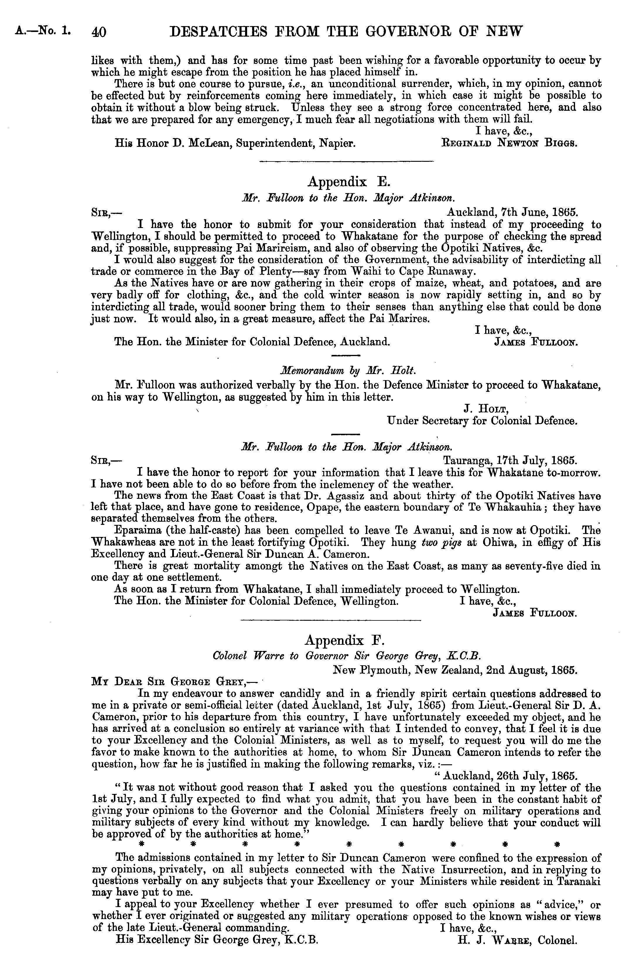 Appendix E. Mr. Fulloon to the Hon. Major Atkinson. Sir, — Auckland, 7th June, 1865. I have the honor to submit for your consideration that instead of my proceeding to Wellington, I should be permitted to proceed to Whakatane for the purpose of checking the spread and, if possible, suppressing Pai Marireism, and also of observing the Opotiki Natives, &c. I would also suggest for the consideration of the Government, the advisability of interdicting all trade or commerce in the Bay of Plenty—say from AVaihi to Cape Eunaway. As the Natives have or are now gathering in their crops of maize, wheat, and potatoes, and are very badly off for clothing, &c, and the cold winter season is now rapidly setting in, and so by interdicting all trade, would sooner bring them to their senses than anything else that could be done just now. It would also, in a great measure, affect the Pai Marircs. I have, &c, The Hon. the Minister for Colonial Defence, Auckland. James Fulloon. Memorandum by Mr. Holt. Mr. Fulloon was authorized verbally by the Hon. the Defence Minister to proceed to Whakatane, on his way to AVellington, as suggested by him in this letter. J. Holt, Hnder Secretary for Colonial Defence. Mr. Fulloon to the Hon. Major Atkinson. Sir, — Tauranga, 17th July, 1865. I have the honor to report for your information that I leave this for AVhakatane to-morrow. I have not been able to do so before from the inclemency of the weather. The news from the East Coast is that Dr. Agassiz and about thirty of the Opotiki Natives have left that place, and have gone to residence, Opape, the eastern boundary of Te AVhakauhia ; they have separated themselves from the others. Eparaima (the half-caste) has been compelled to leave Te Awanui, and is now at Opotiki. The Whakawheas are not in the least fortifying Opotiki. They hung two pigs at Ohiwa, in effigy of His Excellency and Lieut.-General Sir Duncan A. Cameron. There is great mortality amongt the Natives on the East Coast, as many as seventy-five died in one day at one settlement. As soon as I return from Whakatane, I shall immediately proceed to AVellington. The Hon. the Minister for Colonial Defence, Wellington. I have, &c, James Fulloon.