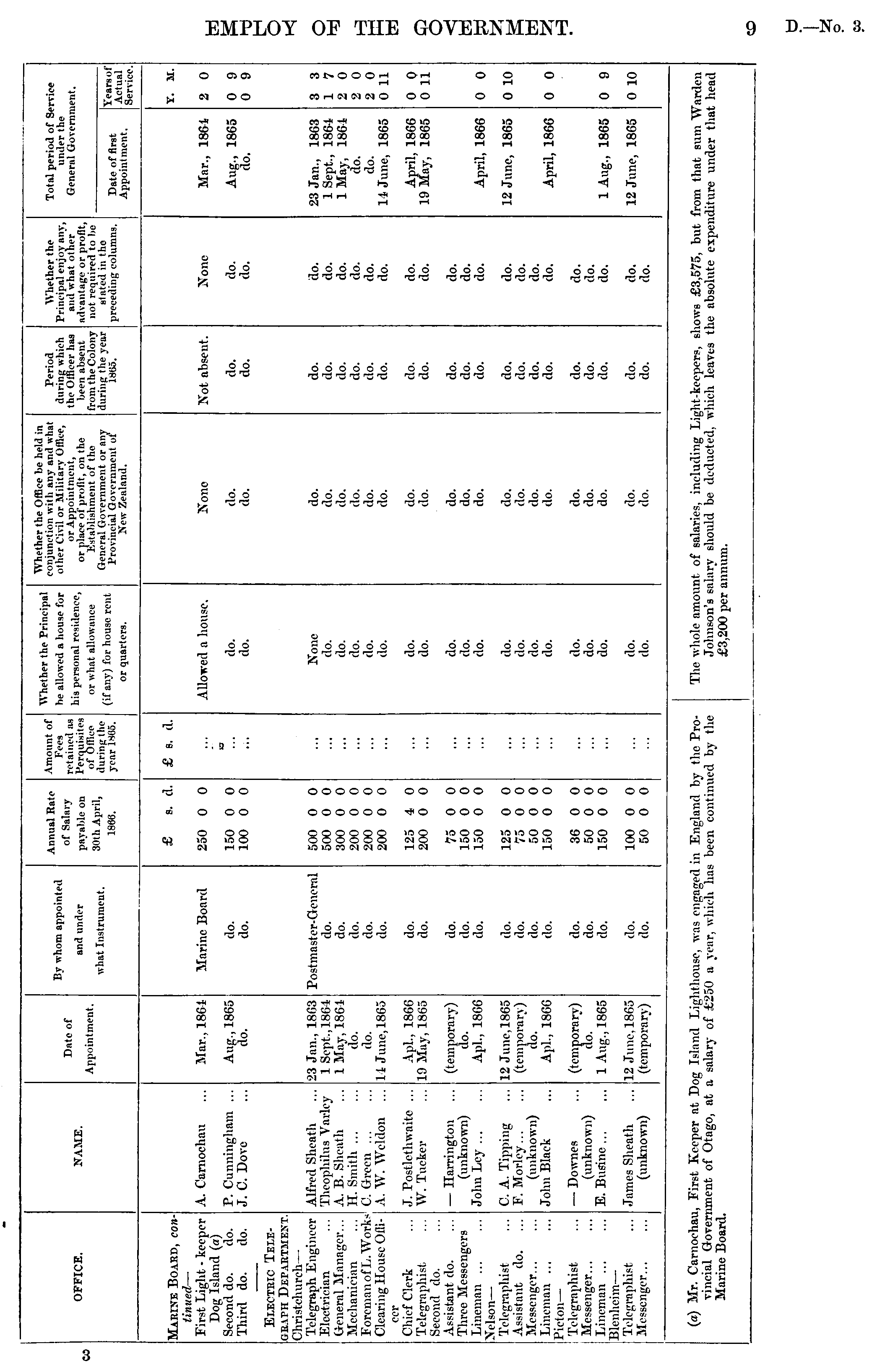 Annual Rate Amount of "Whether the Principal Whether the Office be held in conjunction with any and what Period Whether the Total period of Service By whom appointed of Salary Fees be allowed a house for other Civil or Military Office, during which the Officer has Principal enjov any, and what other under the Date of retained as his personal residence, or Appointment, General Government. OFFICE. NAME. and under payable on Perquisites of Office during the year 1805. or place of profit, on the INIiiblishment of the General Government or any Provincial Government ot been absent advantage or profit, Appointment. what Instrument. 30th April, 1866. or what allowance (if any) for house rent from the Colony daring the year 1SU5. not required to lie stated in the preceding columns. Date of first Years of Actual Service. or quarters. New Zealand. Appointment. Marine Board, con- £ s. d. £ s. d. X. M. tinued — First Light - keeper A. Carnochau Mar., 1861 Marine Board 250 0 0 Allowed a house. None Not absent. None Mar., 1861 2 0 Dog Island (a) a Second do. do. P. Cunningham ... Aug., 1865 do. 150 0 0 do. do. do. do. Aug., 1865 0 9 Third do. do. J. C. Dove do. do. 100 0 0 ... do. do. do. do. do. 0 9 Electric Telegraph Department. Christchurch — Telegraph Engineer Alfred Sheath 23 Jan., 1863 Postmaster-General 500 0 0 ... None do. do. do. 23 Jan., 1863 3 3 Electrician Theophilns Varley 1 Sept., 1864 do. 500 0 0 ... do. do. do. do. lSept, 1861 1 7 General Manager... A. B. Sheath 1 May, 1861 do. 300 0 0 do. do. do. do. IMay, 1861 2 0 Mechanician H. Smith do. do. 200 0 0 ... do. do. do. do. do. 2 0 Foreman of Ij. Works C. Green ... do. do. 200 0 0 do. do. do. do. do. 2 0 Clearing House OfliA. W. Wcldon ... 11 June, 1865 do. 200 0 0 ... do. do. do. do. 14 June, 1865 0 11 Chief Clerk J. Postlethwaito ... Apl., 1866 do. 125 4 0 do. do. do. do. April, 1866 0 0 Telegraphist Second do. Assistant do. W. Tucker 19 May, 1865 do. 200 0 0 do. do. do. do. 19 May, 1865 0 11 — Harrington (temporary) do. 75 0 0 do. do. do. do. Three Messengers (unknown) do. do. 150 0 0 do. do. do. do. Lineman ... John Ley ... Apl., 1866 do. 150 0 0 do. do. do. do. April, 1866 0 0 Telegraphist C. A. Tipping 12 June, 1865 do. 125 0 0 do. do. do. do. 12 Juno, 1865 0 10 Assistant do. F. Morley (temporary) do. 75 0 0 do. do. do. do. Messenger... (unknown) do. do. 50 0 0 do. do. do. do. Lineman ... Pieton — John Black Apl., 1866 do. 150 0 0 do. do. do. do. April, 1866 0 0 Telegraphist — Downes (temporary) do. 36 0 0 do. do. do. do. Messenger... (unknown) do. * do. 50 0 0 do. do. do. do. Lineman ... E. Busine 1 Aug., 1865 do. 150 0 0 ... do. do. do. do. lAug., 1865 0 9 Blenheim — Telegraphist James Sheath 12 June, 1865 do. 100 0 0 do. do. do. do. 12 June, 1865 0 10 Messenger... (unknown) (temporary) do. 50 0 0 do. . do. do. do. (a) Mr. Carnoehau, First Keeper at D jg Island Lig' ithouse, was engaged in England b y the ProThe whole amount of salaries, including Light-keepers, shows £3,575, but from that sum Warden vincial Government of Otago, at i t salary of £2 50 a year, which has been contim ed by the Johnson's salary should be deducted, v inch leaves the absolute expenditure under that head Marine Board. £3,200 per annum.