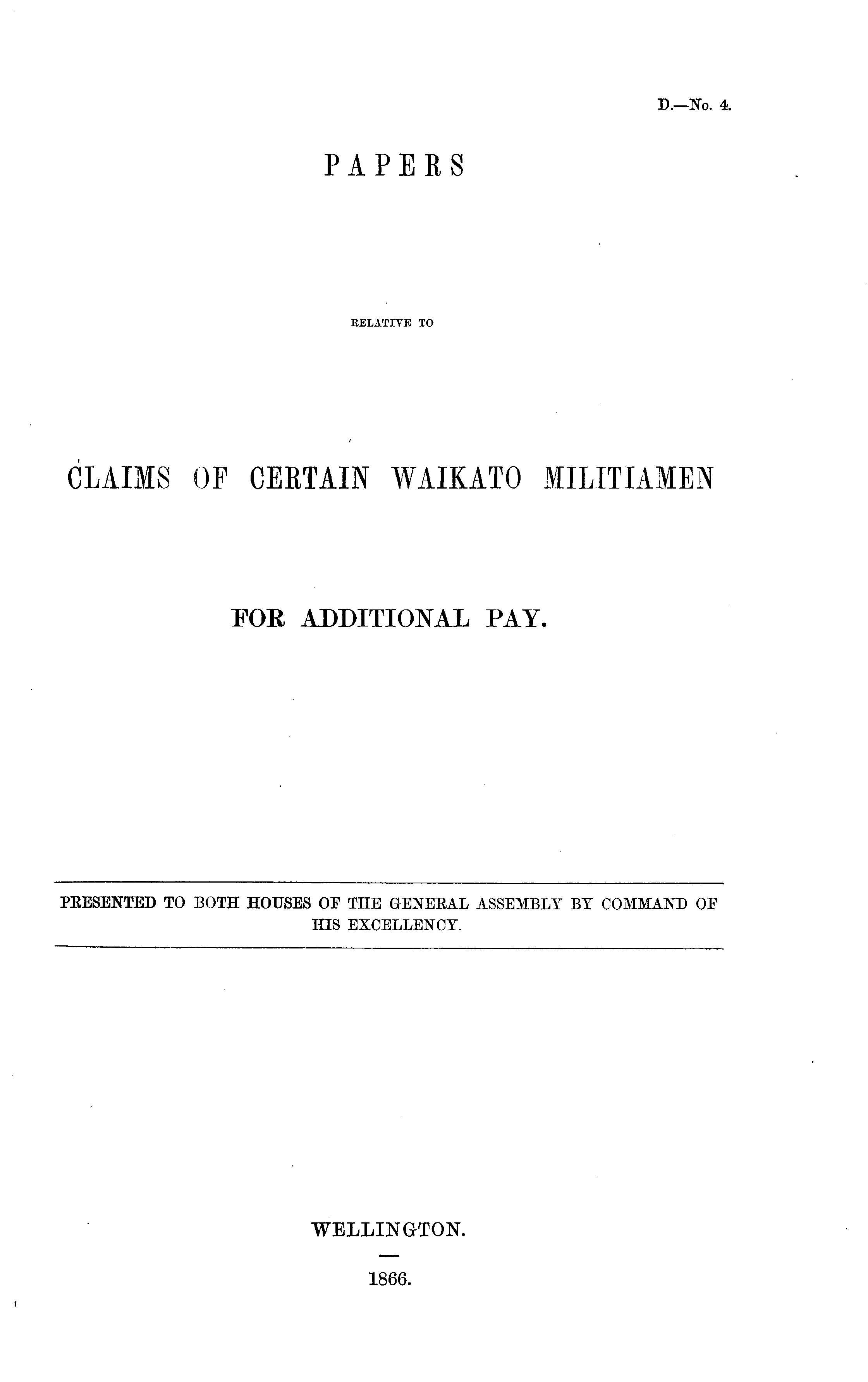 PAPERS RELATIVE TO CLAIMS OF CERTAIN WAIKATO MILITIAMEN FOR ADDITIONAL PAY.