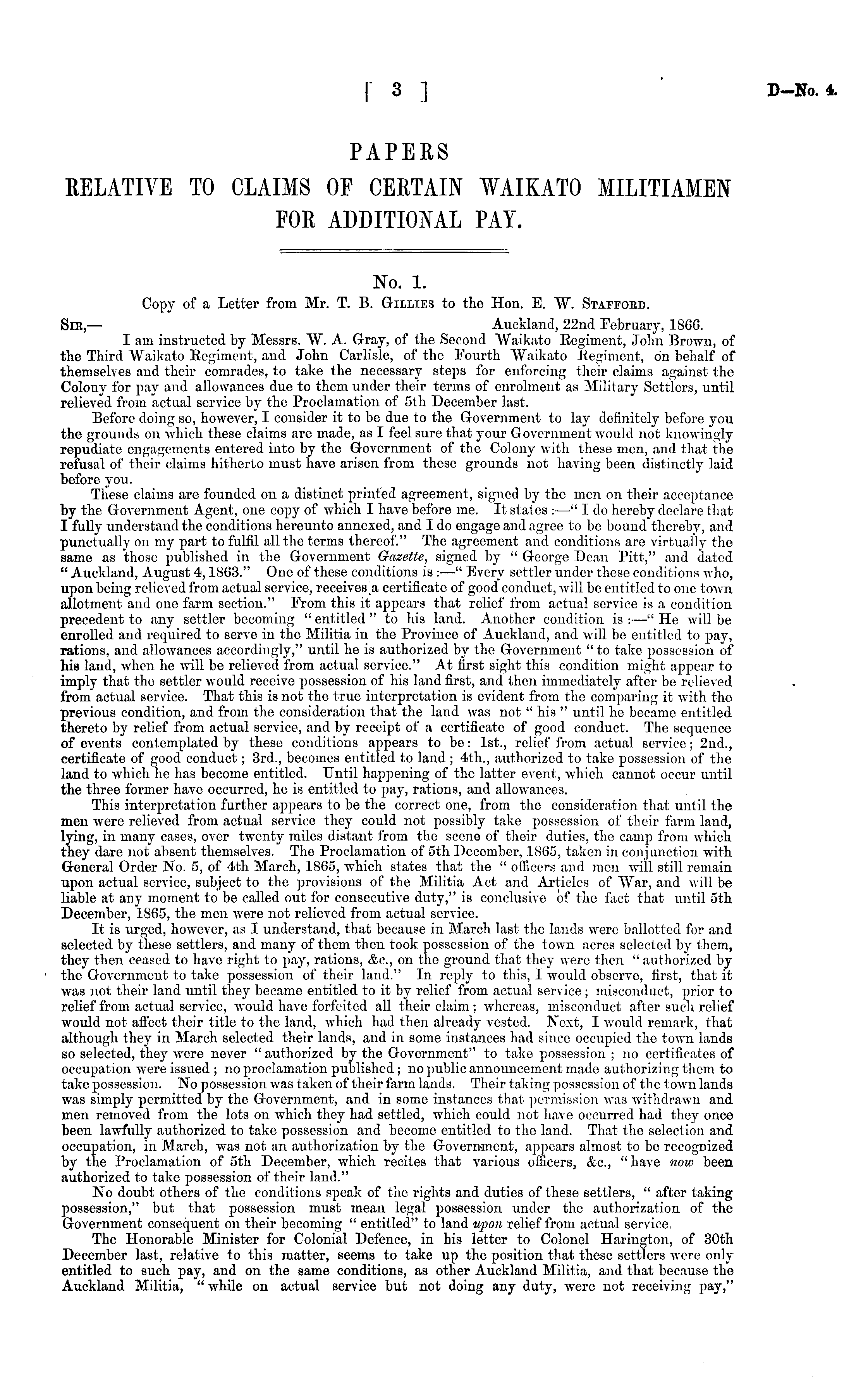 No. 1. Copy of a Letter from Mr. T. B. Gillies to the Hon. E. W. Staffobd. Sic,— Auckland, 22nd February, 1866. I am instructed by Messrs. W. A. Gray, of the Second Waikato Eegiment, John Brown, of the Third Waikato Eegiment, and John Carlisle, of the Fourth Waikato Eegiment, on behalf of themselves and their comrades, to take the necessary steps for enforcing their claims against the Colony for pay and allowances due to them under their terms of enrolment as Military- Settlers, until relieved from actual service by the Proclamation of Sth December last. Before doing so, however, I consider it to be due to the Government to lay definitely before you the grounds on which these claims are made, as I feel sure that y-our Government would not knowingly repudiate engagements entered into by the Government of the Colony with these men, and that the refusal of their claims hitherto must have arisen from these grounds not having been distinctly laid before you. These claims are founded on a distinct printed agreement, signed by the men on their acceptance by the Government Agent, one copy of which I have before me. It states : —" Ido hereby declare that I fully understand the conditions hereunto annexed, and I do engage and agree to be bound thereby, and punctually on my part to fulfil all the terms thereof." The agreement and conditions are virtually the same as those published in the Government Gazette, signed by " George Dean Pitt," and dated " Auckland, August 4,1863." One of these conditions is :• —" Every settler under these conditions who, upon being relieved from actual service, receives a certificate of good conduct, will be entitled to one town allotment and one farm section." From this it appears that relief from actual service is a condition precedent to any settler becoming " entitled "to his land. Another condition is : —" He will be enrolled and required to serve in tho Militia in the Province of Auckland, and will be entitled to pay, rations, and allowances accordingly," until he is authorized by the Government " to take possession of his land, when he will be relieved from actual service." At first sight this condition might appear to imply that the settler would receive possession of his land first, and then immediately after be relieved from actual service. That this is not the true interpretation is evident from the comparing it with the previous condition, and from the consideration that the land was not " his " until he became entitled thereto by relief from actual service, and by receipt of a certificate of good conduct. The sequence of events contemplated by these conditions appears to be: Ist., relief from actual service; 2nd., certificate of good conduct; 3rd., becomes entitled to land ; 4th., authorized to take possession of the land to which ho has become entitled. Until happening of the latter event, which cannot occur until the three former have occurred, ho is entitled to pay, rations, and allowances. This interpretation further appears to be the correct one, from the consideration that until the men were relieved from actual service they could not possibly take possession of their farm land, lying, in many cases, over twenty miles distant from the scene of their duties, the camp from which they dare not absent themselves. The Proclamation of sth December, 1865, taken in conjunction with General Order No. 5, of 4th March, 1865, which states that the " officers and men will still remain upon actual service, subject to the provisions of the Militia Act and Articles of War, and will be liable at any moment to be called out for consecutive duty," is conclusive of the fact that until Sth December, 1865, the men were not relieved from actual service. It is urged, however, as I understand, that because in March last the lands were ballotted for and selected by these settlers, and many of them then took possession of the town acres selected by them, they then ceased to have right to pay, rations, &c, on the ground that they were then " authorized by the Government to take possession of their land." In reply to this, I would observe, first, that it was not their land until they became entitled to it by relief from actual service; misconduct, prior to relief from actual service, would have forfeited all their claim; whereas, misconduct after such relief would not affect their title to the land, which had then already vested. Next, I would remark, that although they in March selected their lands, and in some instances had since occupied the town lands so selected, they were never " authorized by the Government" to take possession ; no certificates of occupation were issued ; no proclamation published; no public announcement made authorizing them to take possession. No possession was taken of their farm lands. Their taking possession of the town lands was simply permitted by the Government, and in some instances that permission was withdrawn and men removed from the lots on which they had settled, which could not have occurred had they once been lawfully authorized to take possession and become entitled to the land. That the selection and occupation, in March, was not an authorization by the Government, appears almost to bo recognized by the Proclamation of Sth December, which recites that various officers, &c., "have now been authorized to take possession of their land." No doubt others of the conditions speak of the rights and duties of these settlers, " after taking possession," but that possession must mean legal possession under the authorization of the Government consequent on their becoming " entitled" to land upon relief from actual service, The Honorable Minister for Colonial Defence, in his letter to Colonel Harington, of 30th December last, relative to this matter, seems to take up the position that these settlers were only entitled to such pay, and on the same conditions, as other Auckland Militia, and that because the Auckland Militia, " while on actual 