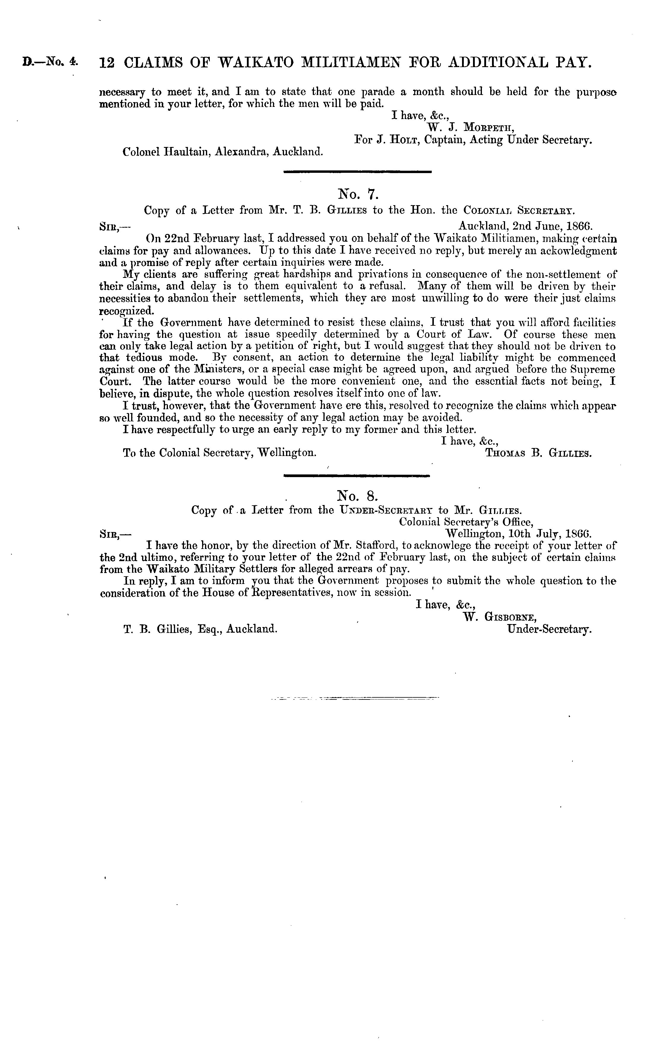 necessary to meet it, and I am to state that one parade a month should be held for the purpose mentioned iv your letter, for which the men will be paid. I have, &c, W. J. Morpeth, For J. Holt, Captain, Acting Under Secretary. Colonel Haultain, Alexandra, Auckland. No. 7. Copy of a Letter from Mr. T. B. Gillies to the Hon. the Colonial Seceetaey. Sir,— Auckland, 2nd June, 186 G. On 22nd February last, I addressed you on behalf of the AVaikato Militiamen, making certain claims for pay and allowances. Up to this date I have received no reply, but merely an ackowledgment and a promise of reply after certain inquiries were made. My clients are suffering great hardships and privations in consequence of the non-settlement of their claims, and delay is to them equivalent to a refusal. Many of them will be driven by their necessities to abandon their settlements, which they are most unwilling to do were their just claims recognized. If tho Government have determined to resist these claims, I trust that you will afford facilities for having the question at issue speedily determined by a Court of Law. Of course these men can only take legal action by a petition of right, but I would suggest that they should not be driven to that tedious mode. By consent, an action to determine the legal liability might be commenced against one of the Ministers, or a special case might be agreed upon, and argued before the Supremo Court. The latter course would be the more convenient one, and the essential facts not being, I believe, in dispute, the whole question resolves itself into one of law. I trust, however, that the Government have ere this, resolved to recognize the claims which appear so well founded, and so the necessity of any legal action may be avoided. I have respectfully to urge an early reply to my former and this letter. I have, &c, To the Colonial Secretary, Wellington. Thomas B. Gillies. No. 8. Copy of a Letter from the Undee-Seceetaey to Mr. Gillies. Colonial Secretary's Office, Sib,— Wellington, 10th July, 1866. I have tho honor, by the direction of Mr. Stafford, to acknowlege the receipt of your letter of the 2nd ultimo, referring to your letter of the 22nd of February last, on the subject of certain claims from the AVaikato Military Settlers for alleged arrears of pay. In reply, I am to inform you that the Government proposes to submit the whole question to the consideration of the House of Representatives, now in session. I have, &c., W. Gisboene, T. B. Gillies, Esq., Auckland. Under-Secretary.