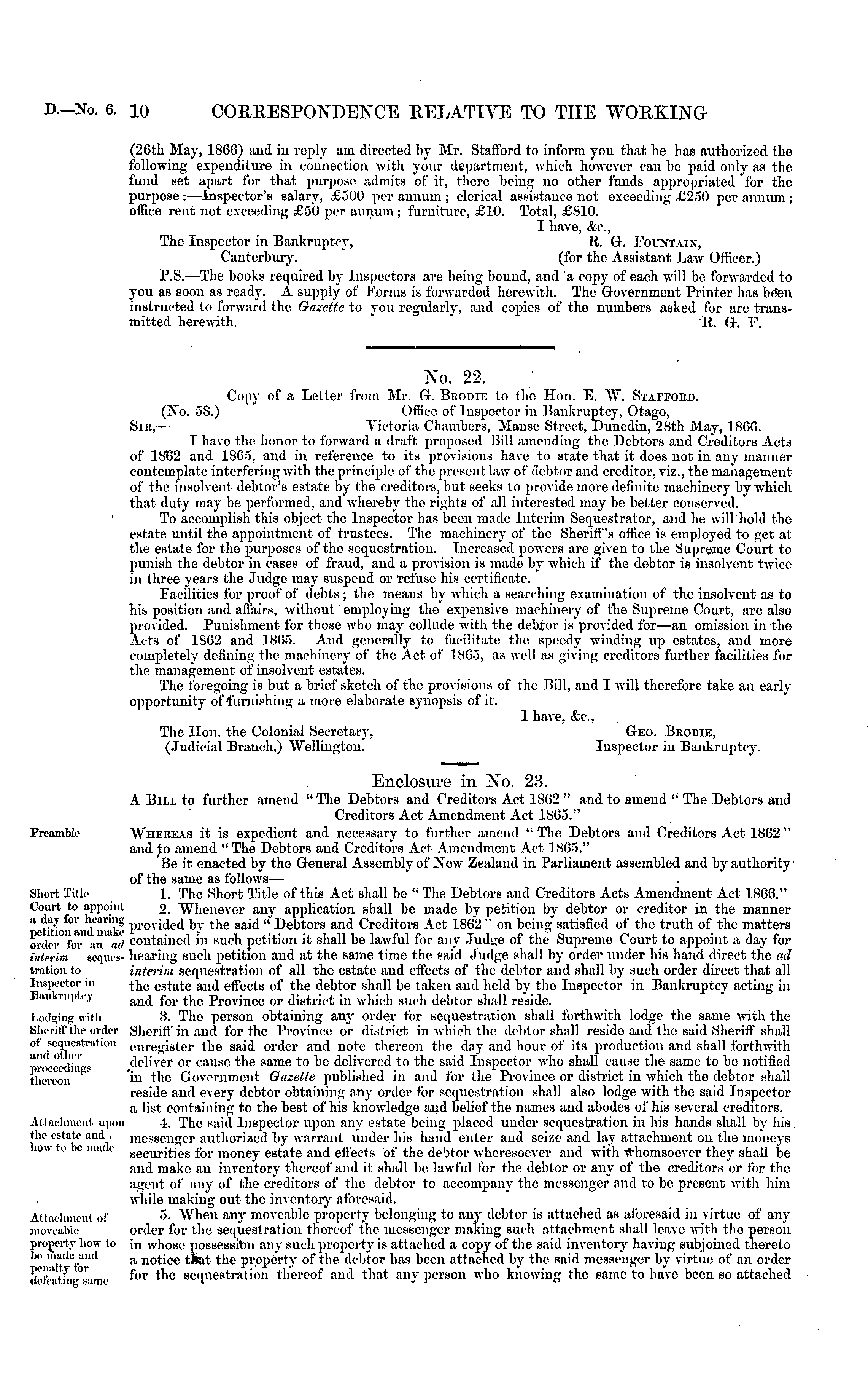 (26th May, 1866) and in reply am directed by Mr. Stafford to inform you that he has authorized the following expenditure in connection with your department, which however can be paid only as the fund set apart for that purpose admits of it, there being no other funds appropriated for the purpose: —Inspector's salary, £500 per annum ; clerical assistance not exceeding £250 per annum; office rent not exceeding £50 per annum ; furniture, £10. Total, £810. I have, &c, The Inspector in Bankruptcy, E. G. Fountain, Canterbury. (for the Assistant Law Officer.) P.S. —The books required by Inspectors are being bound, and a copy of each will be forwarded to you as soon as ready. A supply of Forms is forwarded herewith. The Government Printer has been instructed to forward the Gazette to you regularly, and copies of the numbers asked for fire transmitted herewith. E. G. F. No. 22. Copy of a Letter from Mr. G. Beodie to the Hon. E. AY. Staffoeu. (So. 55.) Office of Inspector in Bankruptcy, Otago, Sir, — Victoria Chambers, Manse Street, Dunedin, 28th May, 1860. I have the honor to forward a draft proposed Bill amending the Debtors and Creditors Acts of 1862 and 1565, and in reference to its provisions have to state that it does not in any manner contemplate interfering with the principle of the present law of debtor and creditor, viz., the management of the insolvent debtors estate by the creditors, but seeks to provide more definite machinery by which that duty may be performed, and whereby the rights of all interested may be better conserved. To accomplish this object the Inspector has been made Interim Sequestrator, and he will hold the estate until the appointment of trustees. The machinery- of tho Sheriff's office is employed to get al the estate for the purposes of the sequestration. Increased powers are tjiven to the Supreme Court to punish the debtor in cases of fraud, and a provision is made by which if the debtor is insolvent twice in three years the Judge may suspend or refuse his certificate. Facilities for proof of debts ; the means by which a searching examination of the insolvent as to his position and affairs, without employing the expensive machinery of the Supreme Court, are also provided. Punishment for those who may collude with the debtor is provided for —an omission in tho Acts of 1562 and 1865. And generally to facilitate the speedy winding up estates, and more completely defining the machinery of the Act of 1865, as well as giving creditors further facilities for the management of insolvent estates. The foregoing is but a brief sketch of the provisions of the Bill, and I will therefore take an early opportunity of furnishing a more elaborate synopsis of it. I have, &c, The Hon. the Colonial Secretary, Geo. Brobie, (Judicial Branch,) AVellington. Inspector in Bankruptcy. Enclosure in No. 23. A Bill to further amend " The Debtors and Creditors Act 1862 " and to amend " The Debtors and Creditors Act Amendment Act 1865." AViiereas it is expedient and necessary to further amend " The Debtors and Creditors Act 1862 " and to amend " The Debtors and Creditors Act Amendment Ad L 865." Be it enacted by the General Assembly of New Zealand in Parliament assembled and by authority of the same as follows — 1. The Short Title of this Act shall be "The Debtors and Creditors Acts Amendment Act 1866." 2. Whenever any application shall be made by petition by debtor or creditor in the manner provided by the said" Debtors and Creditors Act 1862" on being satisfied of the truth of the matters contained in such petition it shall be lawful for any Judge of the Supreme Court to appoint a. day for hearing such petition and at the same time the said Judge shall by order under his hand direct the ad interim sequestration of all the estate and effects of the debtor and shall by such order direct that all the estate and effects of the debtor shall be taken and held by the inspector in Bankruptcy acting in and for the Province or district in which such debtor shall reside. 3. The person obtaining any order for sequestration shall forthwith lodge the same with the Sheriff in and for the Province or district in which the debtor shall reside and the said Sheriff shall enregister tho said order and note thereon the day and hour of its production and shall forthwith deliver or cause the same to be delivered to the said Inspector who shall cause the same to be notified 'in the Government Gazette published in and for the Province or district in which the debtor shall reside and every debtor obtaining any order for sequestration shall also lodge with the said Inspector a list containing to the best of his knowledge and belief the names and abodes of his several creditors. 4. The said Inspector upon any estate being placed under sequestration in his hands shall by his messenger authorized by warrant under his hand enter and seize and lay attachment on the moneys securities for money estate and effects of the debtor wheresoever and with whomsoever they shall be and make an inventory thereof and it shall be lawful for the debtor or any of the creditors or for the agent of any- of the creditors of the debtor to accompany the messenger and to be present with him while making out the inventory aforesaid. 5. AVhen any moveable property belonging to any debtor is attached as aforesaid in virtue of any order for the sequestration thereof the messenger making such attachment shall leave with the person in whose possession any such property is attached a copy of the said inventory having subjoined thereto a notice thai tho property of the debtor has been attached by the said messenger by virtue of an order for the sequestration thereof and that any person who knowing the same to have been so attached