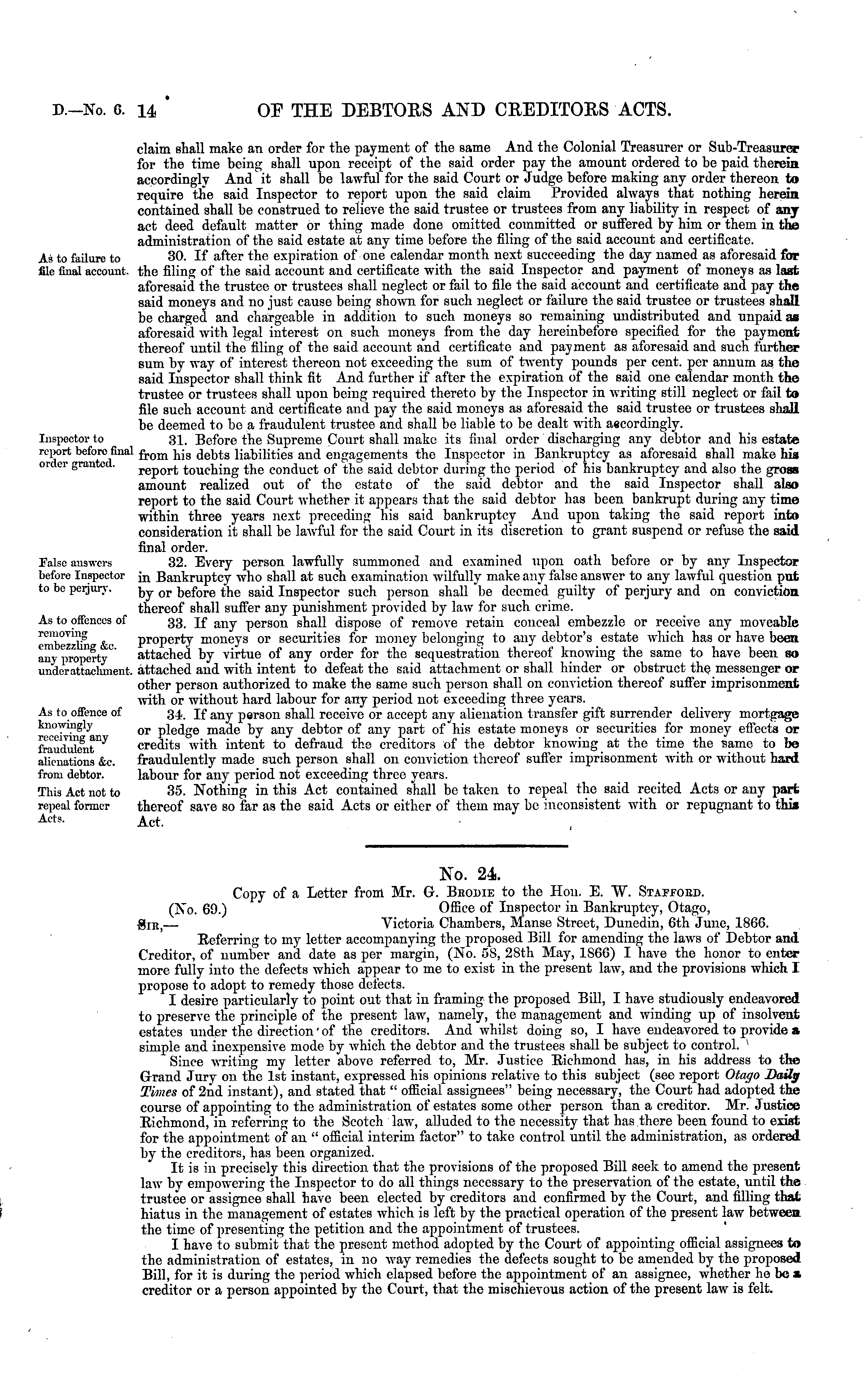 claim shall make an order for the payment of the same And tho Colonial Treasurer or Sub-Treasurer for the time being shall upon receipt of the said order pay the amount ordered to be paid therein accordingly And it shall be lawful for the said Court or Judge before making any order thereon to require the said Inspector to report upon the said claim Provided always that nothing herein contained shall be construed to relieve the said trustee or trustees from any liability in respect of any act deed default matter or thing made done omitted committed or suffered by him or them in the administration of tho said estate at any time before the filing of the said account and certificate. 30. If after the expiration of one calendar month next succeeding the day named as aforesaid for the filing of the said account and certificate with the said Inspector and payment of moneys as last aforesaid the trustee or trustees shall neglect or fail to file the said account and certificate and pay the said moneys and no just cause being shown for such neglect or failure the said trustee or trustees shall be charged and chargeable in addition to such moneys so remaining undistributed and unpaid as aforesaid with legal interest on such moneys from the day hereinbefore specified for tho payment thereof until the filing of the said account and certificate and payment as aforesaid and such further sum by Way of interest thereon not exceeding the sum of twenty pounds per cent, per annum as the said Inspector shall think fit And further if after the expiration of the said one calendar month the trustee or trustees shall upon being required thereto by the Inspector in writing still neglect or fail to file such account and certificate and pay the said moneys as aforesaid the said trustee or trustees shall be deemed to bo a fraudulent trustee and shall be liable to be dealt with accordingly. 31. Before the Supreme Court shall make its final order discharging any debtor and his estate ' from his debts liabilities and engagements the Inspector in Bankruptcy as aforesaid shall make his report touching the conduct of the said debtor during the period of his bankruptcy and also the grow amount realized out of the estate of the said debtor and the said Inspector shall also report to the said Court whether it appears that the said debtor has been bankrupt during any time within three years next preceding his said bankruptcy And upon taking the said report into consideration it shall be lawful for the said Court in its discretion to grant suspend or refuse the said final order. 32. Every person lawfully summoned and examined upon oath before or by any Inspector in Bankruptcy who shall at such examination wilfully make any false answer to any lawful question put by or before the said Inspector such person shall be deemed guilty of perjury and on conviction thereof shall suffer any punishment provided by law for such crime. 33. If any person shall dispose of remove retain conceal embezzle or receive any moveable property moneys or securities for money belonging to any debtor's estate which has or have been attached by virtue of any order for the sequestration thereof knowing the same to have been so attached and with intent to defeat the said attachment or shall hinder or obstruct the messenger or other person authorized to make the same such person shall on conviction thereof suffer imprisonment with or without hard labour for any period not exceeding three years. 34. If any person shall receive or accept any alienation transfer gift surrender delivery mortgage or pledge made by any debtor of any part of his estate moneys or securities for money effects or credits with intent to defraud the creditors of the debtor knowing at the time the same to be fraudulently made such person shall on conviction thereof suffer imprisonment with or without hard labour for any period not exceeding three years. 35. Nothing in this Act contained shall be taken to repeal the said recited Acts or any part thereof save so far as the said Acts or either of them may be inconsistent with or repugnant to this Act. , No. 24. Copy of a Letter from Mr. G. Brodie to the Hon. E. "W. Stafford. (So. 69.) Office of Inspector iv Bankruptcy, Otago, gn> U) — Victoria Chambers, Manse Street, Dunedin, 6th June, 1866. Eeferring to my letter accompanying the proposed Bill for amending the laws of Debtor and Creditor, of number and date as per margin, (No. 58, 28th May, 1566) I have the honor to enter more fully into the defects which appear to me to exist in the present law, and the provisions which I propose to adopt to remedy those defects. I desire particularly to point out that in framing the proposed Bill, I have studiously endeavored to preserve the principle of the present law, namely, the management and winding up of insolvent estates under the direction' of the creditors. And whilst doing so, I have endeavored to provide a simple and inexpensive mode by which the debtor and the trustees shall be subject to control. ' Since writing my letter above referred to, Mr. Justice Eichmond has, in his address to the Grand Jury on the Ist instant, expressed his opinions relative to this subject (see report Otago Bailg Times of 2nd instant), and stated that " official assignees" being necessary, the Court had adopted the course of appointing to the administration of estates some other person than a creditor. Mr. Justice Eichmond, in referring to the Scotch law-, alluded to the necessity that has there been found to exist for the appointment of an " official interim factor" to take control until the administration, as ordered by the creditors, has been organized. It is in precisely this direction that the provisions of the proposed Bill seek to amend the present law by empowering the Inspector to do all things necessary to the preservation of the estate, until the trustee or assignee shall have been elected by creditors and confirmed by the Court, and filling that hiat
