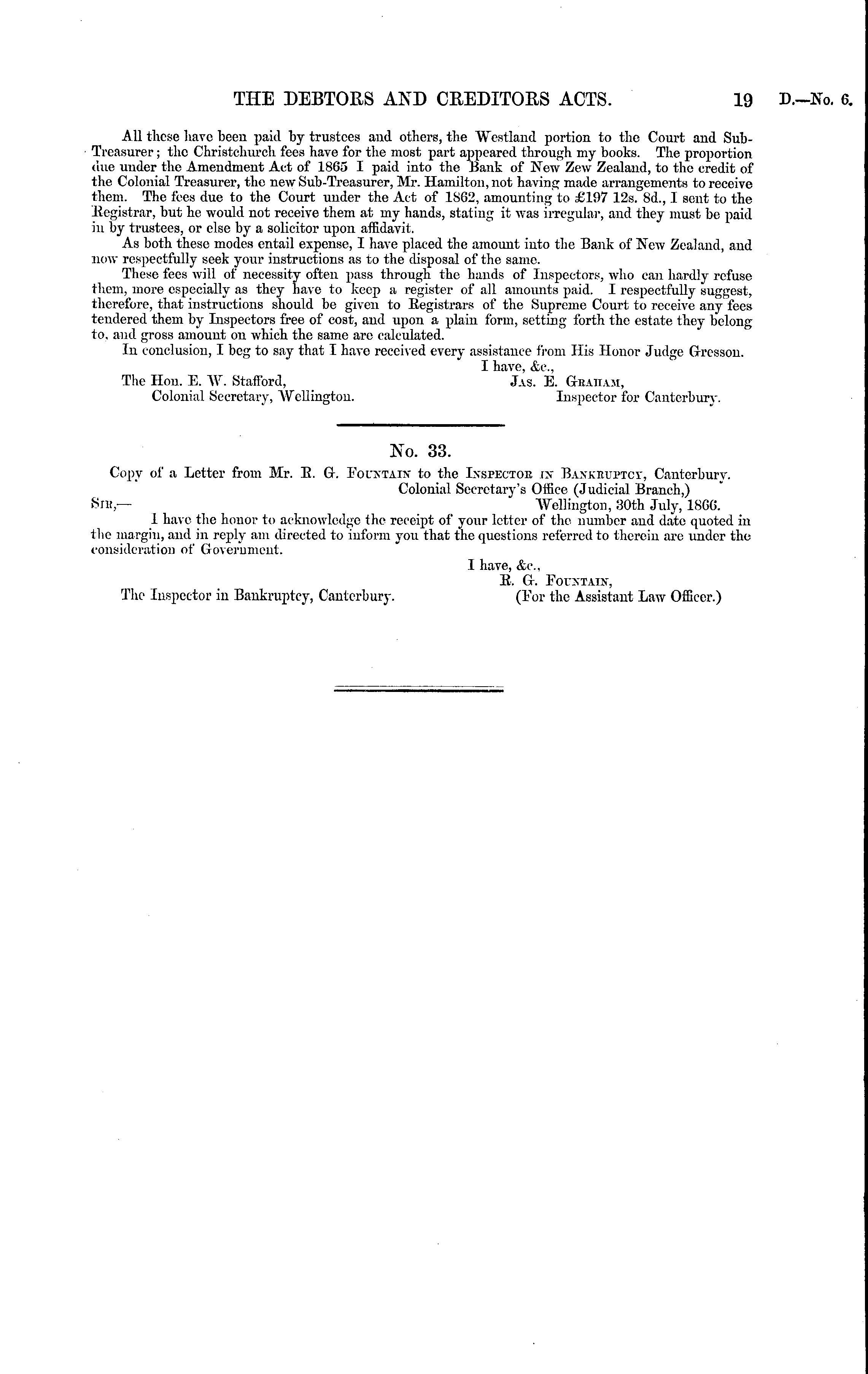 All these have been paid by trustees and others, the "Westland portion to the Court and SubTreasurer ; the Christchurch fees have for the most part appeared through my books. The proportion due under the Amendment Act of 1865 I paid into the Bank of New Zew Zealand, to tho credit of the Colonial Treasurer, the new Sub-Treasurer, Mr. Hamilton, not having made arrangements to receive them. The fees due to the Court under the Act of 1862, amounting to £197 12s. Bd., I sent to the Eegistrar, but he would not receive them at my hands, stating it was irregular, aud they must be paid iv by trustees, or else by a solicitor upon affidavit. As both these modes entail expense, I have placed the amount into the Bank of New Zealand, and now respectfully seek your instructions as to the disposal of the same. These fees will of necessity often pass through the hands of Inspectors, who can hardly refuse them, more especially as they have to keep a register of all amounts paid. I respectfully suggest, therefore, that instructions should be given to Eegistrars of the Supreme Court to receive any fees tendered them by Inspectors free of cost, and upon a plain form, setting forth the estate they belong to, and gross amount on which the same are calculated. In conclusion, I beg to say that I have received every assistance from His Honor Judge Grcsson. I have, &c., The Hon. E. W. Stafford, Jas. E. Graham, Colonial Secretary, Wellington. Inspector for Canterbury. No. 33. Copy of a Letter from Mr. E. G. Fountain to the Inspector in Bankruptcy, Canterbury. Colonial Secretary's Office (Judicial Branch,) Bnt,— "Wellington, 30th July, 1866. I have the honor to acknowledge the receipt of your letter of the number aud date quoted in the margin, and in reply am directed to inform you that the questions referred to therein are under the consideration of Government. I have, &c, E. G. Fountain, The Inspector in Bankruptcy, Canterbury. (For the Assistant Law Officer.)