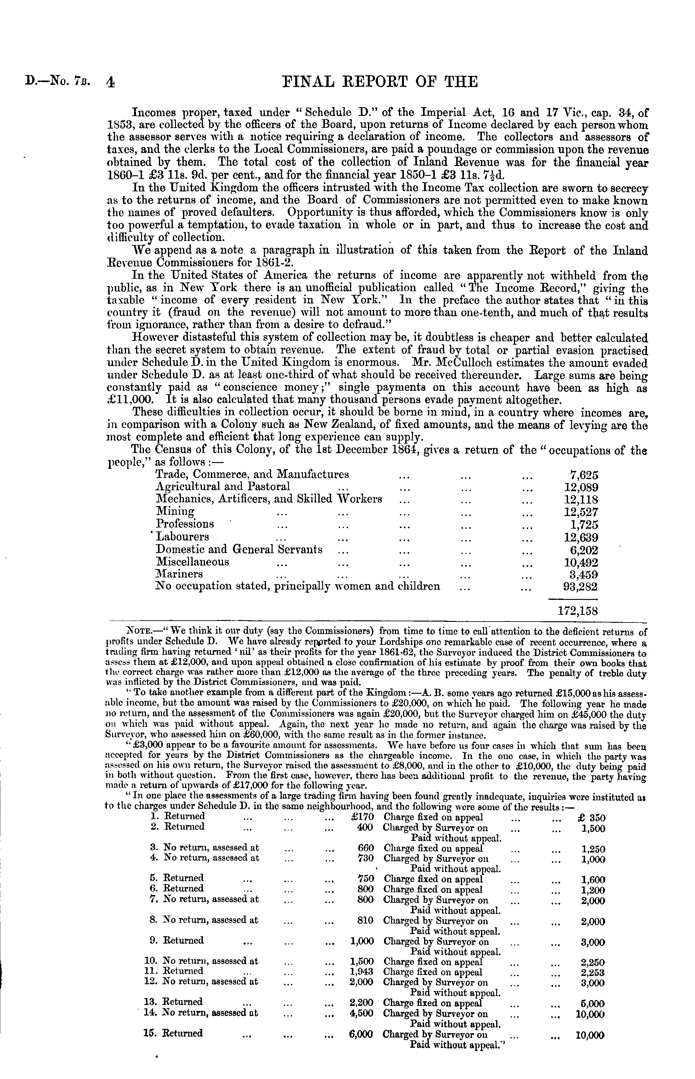 Incomes proper, taxed under " Schedule D." of the Imperial Act, 16 and 17 Vie, cap. 34, of 1553, are collected by the officers of the Board, upon returns of Income declared by each person whom the assessor serves with a notice requiring a declaration of income. The collectors and assessors of taxes, and the clerks to the Local Commissioners, are paid a poundage or commission upon the revenue obtained by them. The total cost of the collection of Inland Kevenue was for the financial year ISGO-1 £3 11s. 9d. per cent., and for the financial year ISSO-1 £3 11s. 7-J-d. In the United Kingdom the officers intrusted with the Income Tax collection are sworn to secrecy as to the returns of income, and the Board of Commissioners are not permitted even to make known the names of proved defaulters. Opportunity is thus afforded, which the Commissioners know is only too powerful a temptation, to evade taxation in whole or in part, and thus to increase the cost and difficulty of collection. We append as a note a paragraph in illustration of this taken from the Report of the Inland Eevenue Commissioners for 1861-2. In the United States of America the returns of income are apparently not withheld from the public, as in New York there is an unofficial publication called " The Income Record," giving the taxable " income of every resident in New York." In the preface the author states that "in this country it (fraud on the revenue) will not amount to more than one-tenth, and much of that results from ignorance, rather than from a desire to defraud." However distasteful this system of collection may be, it doubtless is cheaper and better calculated than the secret system to obtain revenue. The extent of fraud by total or partial evasion practised under Schedule D. in the United Kingdom is enormous. Mr. McCulloch estimates the amount evaded under Schedule D. as at least one-third of what should be received thereunder. Large sums are being constantly paid as " conscience money;" single payments on this account have been as high as £11,000. It is also calculated that many thousand persons evade payment altogether. These difficulties in collection occur, it should be borne in mind, in a country where incomes are, in comparison with a Colony such as New Zealand, of fixed amounts, and the means of levying are the most complete and efficient that long experience can supply. The Census of this Colony, of the Ist December 1864, gives a return of the " occupations of the people," as follows : — Trade, Commerce, and Manufactures ... ... ... 7,625 Agricultural and Pastoral ... ... ... ... 12,089 Mechanics, Artificers, and Skilled Workers ... ... ... 12,118 Mining ... ... ... ... ... 12,527 Professions ... ... ... ... ... 1,725 "Labourers ... ... ... ... ... 12,639 Domestic and General Servants ... ... ... ... 6,202 Miscellaneous ... ... ... ... ... 10,492 Mariners ... ... ... ... ... 3,459 No occupation stated, principally women and children ... ... 93,282 172,158 >"ote. —" We think it our duty (say the Commissioners) from time to time to call attention to the deficient returns of profits under Schedule D. We have already repprted to your Lordships one remarkable case of recent occurrence, where a trading firm having returned : nil' as their profits for the year 1861-62, the Surveyor induced the District Commissioners to assess them at £12,000, and upon appeal obtained a close confirmation of his estimate by proof from their own books that the correct charge was rather more ihan £12,000 as the average of the three preceding years. The penalty of treble duty m inflicted by the District Commissioners, and was paid. '■ To take anot her example from a different part of the Kingdom:—A. B. some years ago returned £15,000 as his assessable income, but the amount was raised by the Commissioners to £20,000, on which'ho paid. The following year he made no return, and the assessment of the Commissioners was again £20,000, but the Surveyor charged him on £45,000 the duty on which was paid without appeal. Again, tho next year he made no return, and again the charge was raised by the Surveyor, who assessed him on £60,000, witli the same result as in the former instance. ''£3,000 appear to he a favourite amount for assessments. We have before us four cases in which that sum has been aooepted for yours by the District Commissioners as the chargeable income. In the one case, in which tho party was assessed on his onn return, the Surveyor raised tho assessment to £8,000, and in the other to £10,000, the duty being paid in both without question. From the first case, however, there has been additional profit to the revenue, the party having made a return of upward* of £17,000 for the following year. ''In one place the assessments of a large trading firm having been found greatly inadequate, inquiries were instituted as to the charges under Schedule D. in the same neighbourhood, and the following were some of the results:— 1. Returned ... ... ... £170 Charge fixed on appeal ... ... £350 2. Returned ... ... ... 400 Charged by Surveyor on ... ... 1,500 Paid without appeal. 3. No return, assessed at ... ... 6GO Charge fixed on appeal ... ... 1,250 4. No return, assessed at ... ... 730 Charged by Surveyor on ... ... 1,000 Paid without appeal. 5. Returned ... ... ... 730 Charge fixed on appeal ... ... 1,600 6. Returned ... ... ... 800 Charge fixed on appeal ... ... 1,200 7. No return, assessed at ... ... 800 Charged by Surveyor on ... ... 2,000 Paid without appeal. 8. No return, assessed at ... ... 810 Charged by Surveyor on ... ... 2,000 Paid without appeal. 9. Returned ... ... ... 1,000 Charged by Surveyor on ... ... 3,000 Paid without appeal. 10. No return, assessed at ... ... 1,500 Charge fixed on appeal ... ... 2,250 11. Returned ... ... ... 1,943 Charge fixed on appeal ... ... 2,253 12. So return, assessed at ... ... 2,000 Charged by Surveyor on ... ... 3,000 Paid without appeal. 13. Returned ... ... ... 2,200 Charg