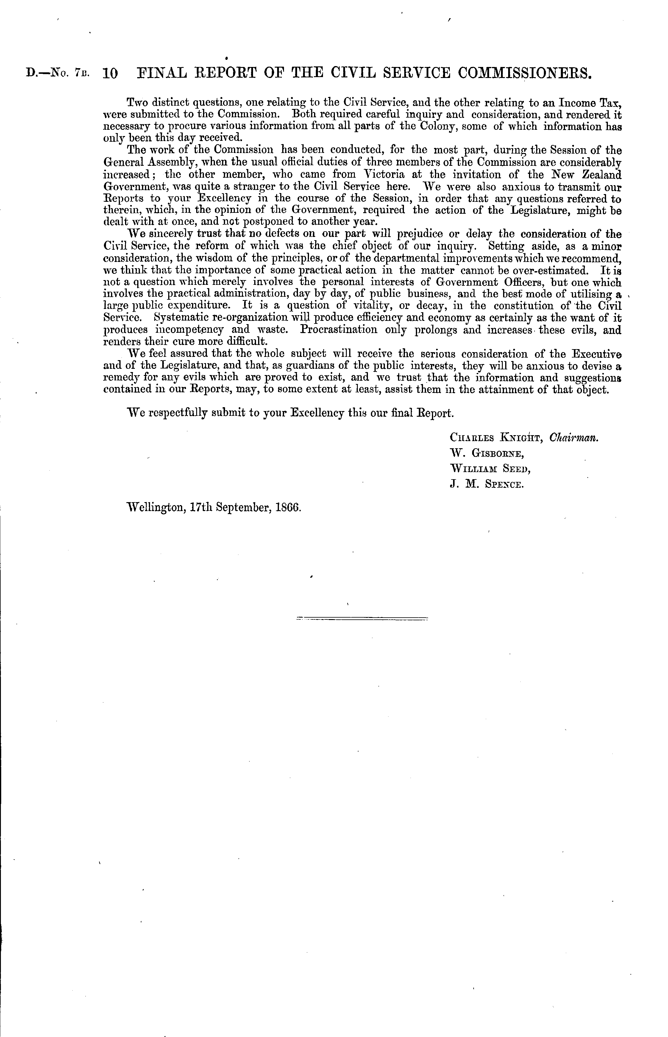 Two distinct questions, one relating to the Civil Service, and the other relating to an Income Tax, were submitted to the Commission. Both required careful inquiry and consideration, and rendered it necessary to procure various information from all parts of the Colony, some of which information has only been this day received. The work of the Commission has been conducted, for the most part, during the Session of the General Assembly, when the usual official duties of three members of the Commission are considerably increased; the other member, who came from Victoria at the invitation of the New Zealand Government, was quite a stranger to the Civil Service here. We were also anxious to transmit our Reports to your Excellency in the course of the Session, in order that any questions referred to therein, which, in the opinion of the Government, required the action of the Legislature, might be dealt with at once, and not postponed to another year. We sincerely trust that no defects on our part will prejudice or delay the consideration of the Civil Service, the reform of which was the chief object of our inquiry. Setting aside, as a minor consideration, the wisdom of the principles, or of the departmental improvements which we recommend, we think that the importance of some j>ractical action in the matter cannot be over-estimated. It is not a question which merely involves the personal interests of Government Officers, but one which involves the practical administration, day by day, of public business, and the best mode of utilising a large public expenditure. It is a question of vitality, or decay, in the constitution of the Civil Service. Systematic re-organization will produce efficiency and economy as certainly as the want of it produces incompetency and waste. Procrastination only prolongs and increases these evils, and renders their cure more difficult. We feel assured that the whole subject will receive the serious consideration of the Executive and of the Legislature, and that, as guardians of the public interests, they will be anxious to devise a remedy for any evils which arc proved to exist, and wo trust that the information and suggestions contained in our Eeports, may, to some extent at least, assist them in the attainment of that object. We respectfully submit to your Excellency this our final Beport. Chaeles Knight, Chairman. W. Gisbobxe, Wtlliam Seed, J. M. Spexce. Wellington, 17tli September, 18GG.