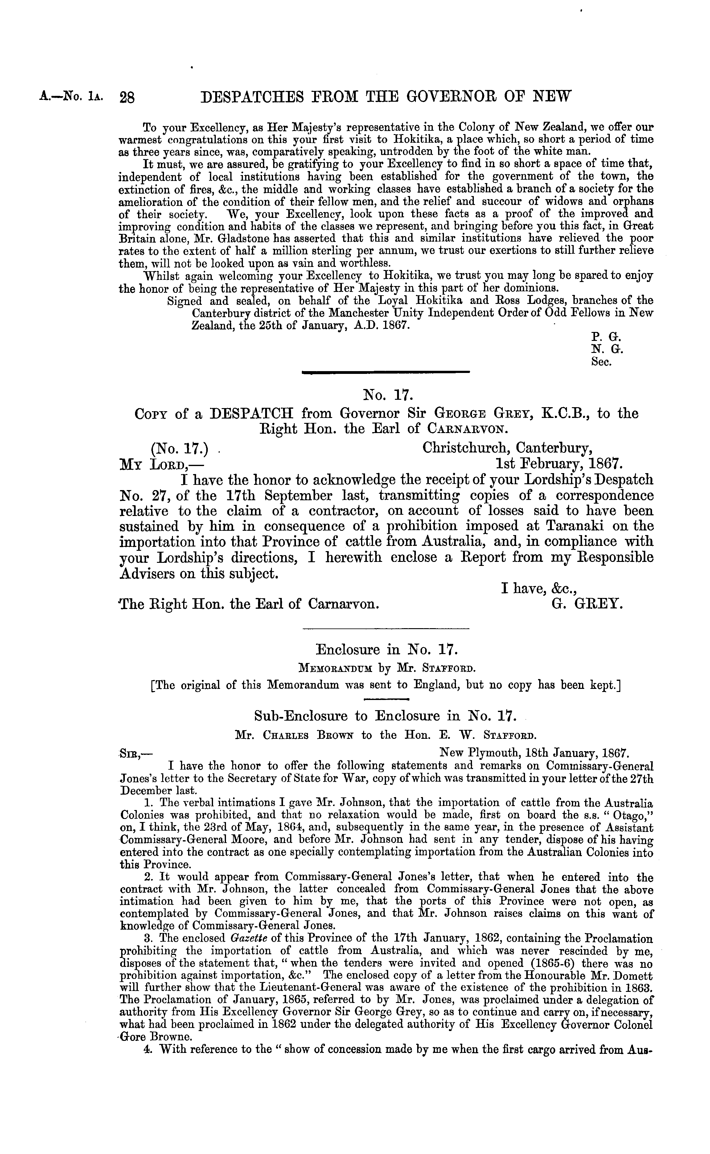 No. 17. Copy of a DESPATCH from Governor Sir George Grey, K.C.8., to the Right Hon. the Earl of Carnarvon. (No. 17.) Christchurch, Canterbury, My Lord, — Ist Eebruary, 1867. I have the honor to acknowledge the receipt of your Lordship's Despatch No. 27, of the 17th September last, transmitting copies of a correspondence relative to the claim of a contractor, on account of losses said to have been sustained by him in consequence of a prohibition imposed at Taranaki on the importation into that Province of cattle from Australia, and, in compliance with your Lordship's directions, I herewith enclose a Report from my Responsible Advisers on this subject. I have, &c, The Right Hon. the Earl of Carnarvon. G. GREY. Enclosure in No. 17. Memorandum by Mr. Stafford. [The original of this Memorandum was sent to England, but no copy has been kept.] Sub-Enclosure to Enclosure in No. 17. Mr. Charles Brown to the Hon. E. W. Stafford. Sir, — New Plymouth, 18th January, 1867. I have the honor to offer the following statements and remarks on Commissary-General Jones's letter to the Secretary of State for War, copy of which was transmitted in your letter of the 27th December last. 1. The verbal intimations I gave Mr. Johnson, that the importation of cattle from the Australia Colonies was prohibited, and that no relaxation would be made, first on board the s.s. " Otago," on, I think, tho 23rd of May, 1864, and, subsequently in the same year, in the presence of Assistant Commissary-General Moore, and before Mr. Johnson had sent in any tender, dispose of his having entered into the contract as one specially contemplating importation from the Australian Colonies into this Province. 2. It would appear from Commissary-General Jones's letter, that when he entered into the contract with Mr. Johnson, the latter concealed from Commissary-General Jones that the above intimation had been given to him by me, that the ports of this Province were not open, as contemplated by Commissary-General Jones, and that Mr. Johnson raises claims on this want of knowledge of Commissary-General Jones. 3. The enclosed Gazette of this Province of the 17th January, 1862, containing the Proclamation prohibiting the importation of cattle from Australia, and which was never rescinded by me, disposes of the statement that, " when the tenders were invited and opened (1865-6) there was no prohibition against importation, &c." The enclosed copy of a letter from the Honourable Mr. Domett will further show that the Lieutenant-General was aware of the existence of the prohibition in 1863. The Proclamation of January, 1865, referred to by Mr. Jones, was proclaimed under a delegation of authority from His Excellency Governor Sir George Grey, so as to continue and carry on, if necessary, what had been proclaimed in 1862 under the delegated authority of His Excellency Governor Colonel Gore Browne. 4. With reference to the " show of concession made by me when the first cargo arrived from Aus-