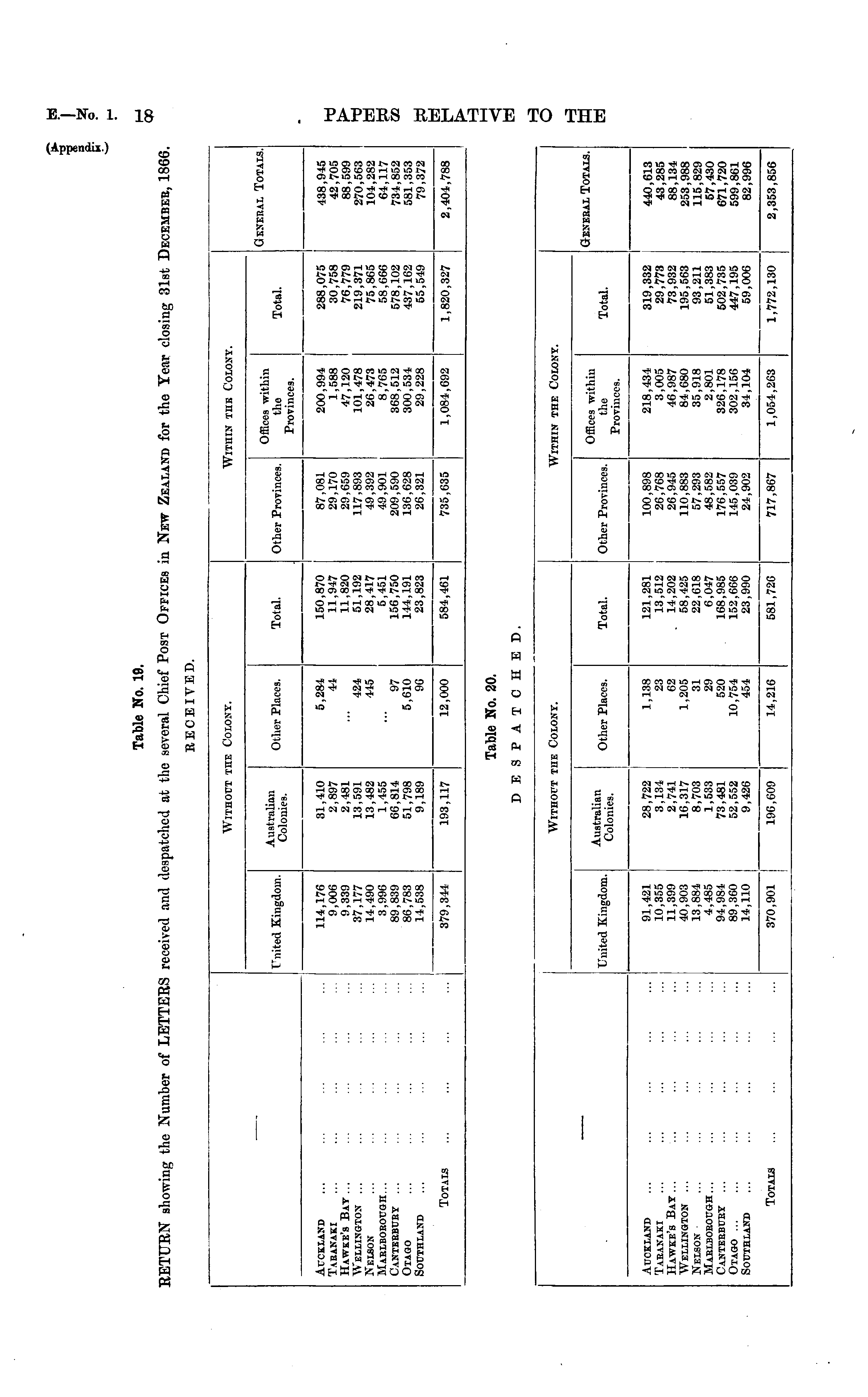 Table No. 19. RETURN showing the Number of LETTERS received and despatched at the several Chief Post Offices in New Zealand for the Tear closing 31st Decembeb, 1866 RECEIVED.