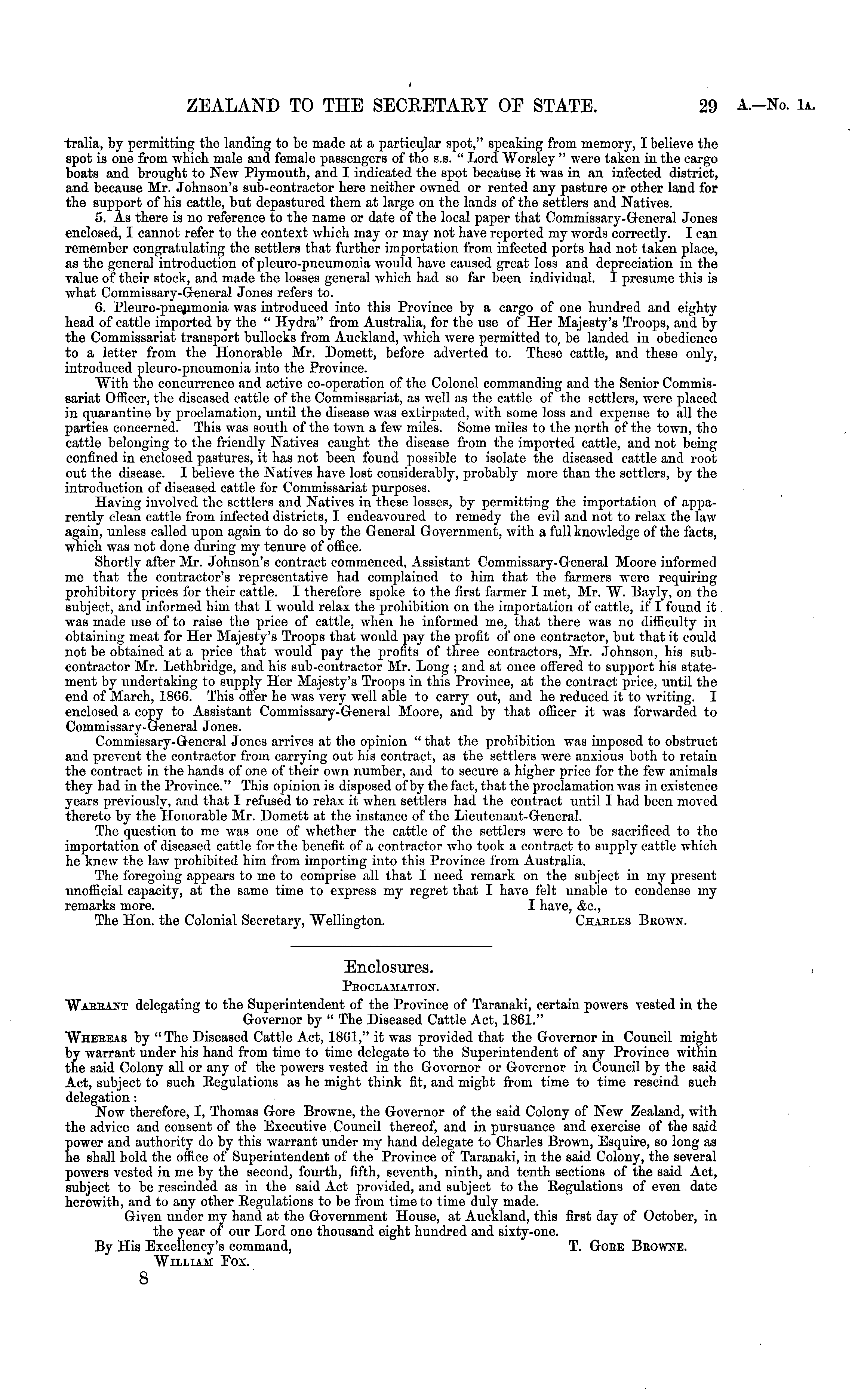 Enclosures. Proclamation. Warrant delegating to tho Superintendent of the Province of Taranaki, certain powers vested in the Governor by " The Diseased Cattle Act, 1861." Whereas by " The Diseased Cattle Act, 1861," it was provided that the Governor in Council might by warrant under his hand from time to time delegate to tho Superintendent of any Province within the said Colony all or any of the powers vested in the Governor or Governor in Council by the said Act, subject to such Begulations as he might think fit, and might from time to time rescind such delegation : Now therefore, I, Thomas Gore Browne, the Governor of the said Colony of New Zealand, with the advice and consent of the Executive Council thereof, and in pursuance and exercise of the said power and authority do by this warrant under my hand delegate to Charles Brown, Esquire, so long as he shall hold the office of Superintendent of the Province of Taranaki, in the said Colony, the several powers vested in me by the second, fourth, fifth, seventh, ninth, and tenth sections of the said Act, subject to be rescinded as in the said Act provided, and subject to the Begulations of even date herewith, and to any other Begulations to be from time to time duly made. Given under my hand at the Government House, at Auckland, this first clay of October, in the year of our Lord ono thousand eight hundred and sixty-one. By His Excellency's command, T. Gore Browne. William Fox. 8
