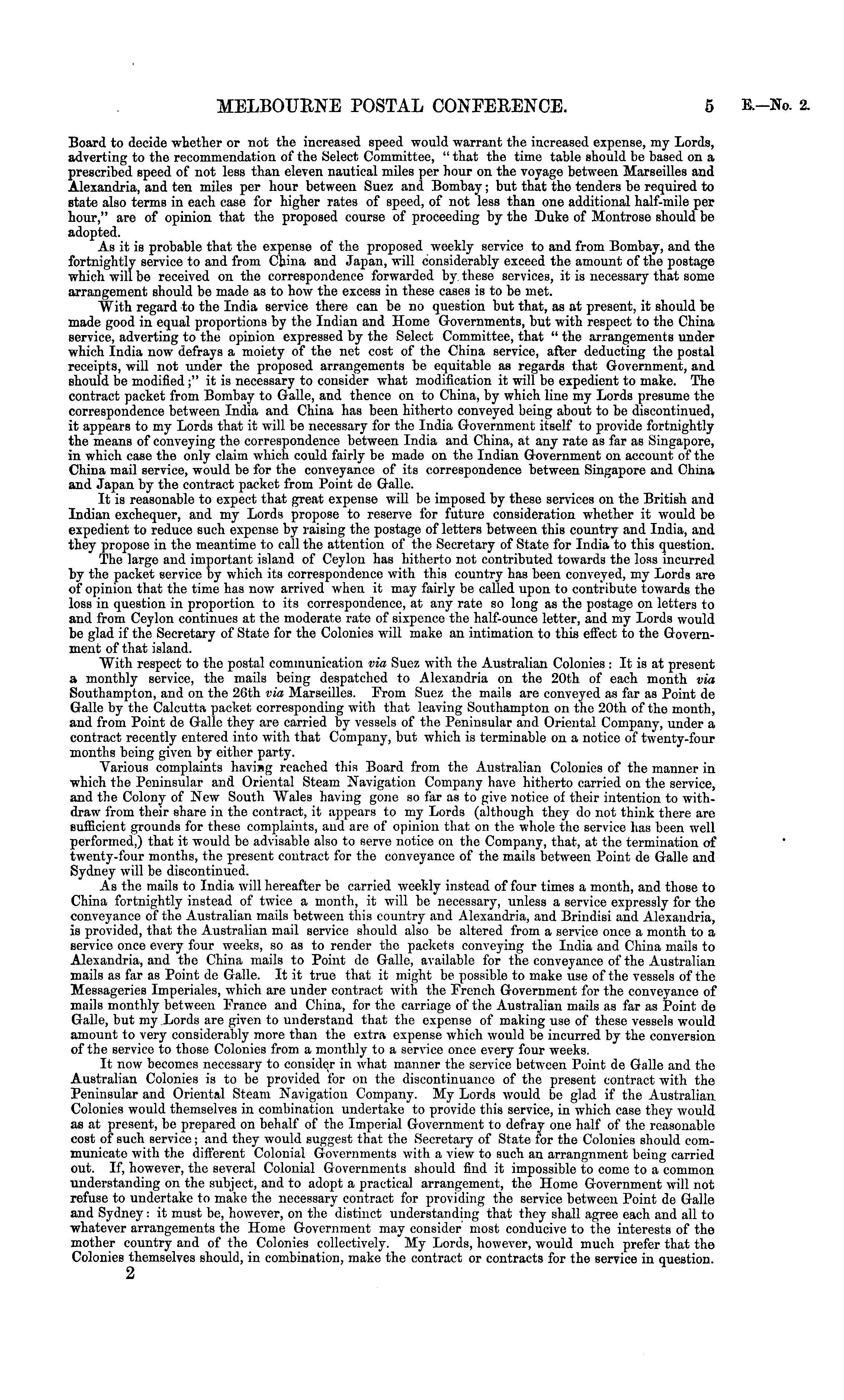 Board to decide whether or not the increased speed would warrant the increased expense, my Lords, adverting to the recommendation of the [Select Committee, " that the time table should be based on a prescribed speed of not less than eleven nautical miles per hour on the voyage between Marseilles and Alexandria, and ten miles per hour between Suez and Bombay; but that the tenders be required to state also terms in each case for higher rates of speed, of not less than one additional half-mile per hour," are of opinion that the proposed course of proceeding by the Duke of Montrose should be adopted. As it is probable that the expense of the proposed weekly service to and from Bombay, and the fortnightly service to and from China and Japan, will considerably exceed the amount of the postage which will bo received on the correspondence forwarded by these services, it is necessary that some arrangement should be made as to how the excess in these cases is to be met. With regard to the India service there can be no question but that, as at present, it should be made good in equal proportions by the Indian and Home Governments, but with respect to the China service, adverting to the opinion expressed by the Select Committee, that " the arrangements under which India now defrays a moiety of the net cost of the China service, after deducting the postal receipts, will not under the proposed arrangements be equitable as regards that Government, and should be modified ;" it is necessary to consider what modification it will be expedient to make. The contract packet from Bombay to Galle, and thence on to China, by which line my Lords presume the correspondence between India and China has been hitherto conveyed being about to be discontinued, it appears to my Lords that it will be necessary for the India Government itself to provide fortnightly the means of conveying the correspondence between India and China, at any rate as far as Singapore, in which case the only claim which could fairly be made on the Indian Government on account of the China mail service, would be for the conveyance of its correspondence between Singapore and China and Japan by the contract packet from Point de Galle. It is reasonable to expect that great expense will be imposed by these services on the British and Indian exchequer, and my Lords propose to reserve for future consideration whether it would be expedient to reduce such expense by raising the postage of letters between this country and India, and they propose in the meantime to call the attention of the Secretary of State for India to this question. The large and important island of Ceylon has hitherto not contributed towards the loss incurred by the packet service by which its correspondence with this country has been conveyed, my Lords are of opinion that the time has now arrived when it may fairly be called upon to contribute towards the loss in question in proportion to its correspondence, at any rate so long as the postage on letters to and from Ceylon continues at the moderate rate of sixpence the half-ounce letter, and my Lords would be glad if the Secretary of State for the Colonies will make an intimation to this effect to the Government of that island. With respect to the postal communication via Suez with the Australian Colonies : It is at present a monthly service, the mails being despatched to Alexandria on the 20th of each month via Southampton, and on the 26th via Marseilles. From Suez the mails are conveyed as far as Point de Galle by the Calcutta packet corresponding with that leaving Sout hampton on the 20th of the month, and from Point de Galle they are carried by vessels of the Peninsular and Oriental Company, under a contract recently entered into with that Company, but which is terminable on a notice of twenty-four months being given by either party. Various complaints having reached this Board from the Australian Colonies of the manner in which the Peninsular and Oriental Steam Navigation Company have hitherto carried on the service, and the Colony of New South Wales haviug gone so far as to give notice of their intention to withdraw from their share in the contract, it appears to my Lords (although they do not think there are sufficient grounds for these complaints, and are of opinion that on the whole the service has been well performed,) that it would be advisable also to serve notice on the Company, that, at the termination of twenty-four months, the present contract for the conveyance of the mails between Point de Galle and Sydney will be discontinued. As the mails to India will hereafter be carried weekly instead of four times a month, and those to China fortnightly instead of twice a month, it will be necessary, unless a service expressly for the conveyance of the Australian mails between this country and Alexandria, and Brindisi and Alexandria, is provided, that the Australian mail service should also be altered from a service once a month to a service once every four weeks, so as to render the packets conveying the India and China mails to Alexandria, and the China mails to Point de Galle, available for the conveyance of the Australian mails as far as Point de Galle. It it true that it might be possible to make use of the vessels of the Messageries Imperiales, which are under contract with the French Government for the conveyance of mails monthly between France and China, for the carriage of the Australian mails as far as Point de Galle, but my Lords are given to understand that the expense of making use of these vessels would amount to very considerably more than the extra expense which would be incurred by the conversion of the service to those Colonies from a monthly to a service once every four weeks. It now becomes necessary to consider in what manner the service between Point de Galle and the Australian Colonies is to be provided for on the discontinuance of the present contract with the Peninsular and Oriental Steam Navigation Com