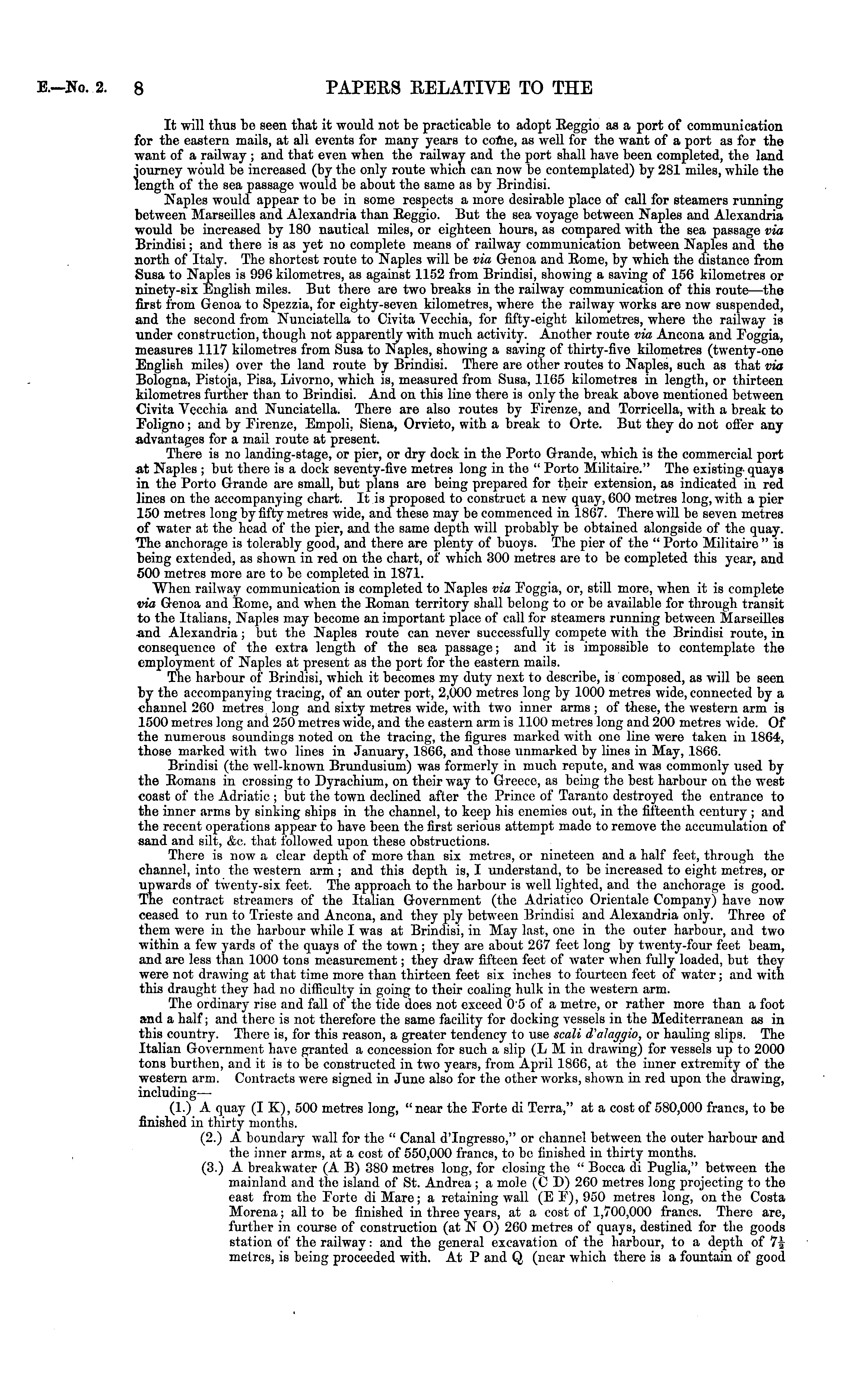 It will thus bo seen that it would not be practicable to adopt Reggio as a port of communication for the eastern mails, at all events for many years to conie, as well for the want of a port as for the want of a railway ; and that even when the railway and the port shall have been completed, the land journey would be increased (by the only route which can now be contemplated) by 281 miles, while the length of the sea passage would be about the same as by Brindisi. Naples would appear to be in some respects a more desirable place of call for steamers running between Marseilles and Alexandria than Reggio. But the sea voyage between Naples and Alexandria would be increased by 180 nautical miles, or eighteen hours, as compared with the sea passage via Brindisi; and there is as yet no complete means of railway communication between Naples and the north of Italy. The shortest route to Naples will be via Genoa and Rome, by which the distance from Susa to Naples is 996 kilometres, as against 1152 from Brindisi, showing a saving of 156 kilometres or ninety-six English miles. But there are two breaks in the railway communication of this route —the first from Genoa to Spezzia, for eighty-seven kilometres, where the railway works are now suspended, and the second from Nunciatella to Civita Vecchia, for fifty-eight kilometres, where the railway is under construction, though not apparently with much activity. Another route via Ancona and Foggia, measures 1117 kilometres from Susa to Naples, showing a saving of thirty-five kilometres (twenty-one English miles) over the land route by Brindisi. There are other routes to Naples, such as that via Bologna, Pistoja, Pisa, Livorno, which is, measured from Susa, 1165 kilometres in length, or thirteen kilometres further than to Brindisi. And on this line there is only the break above mentioned between Civita Vecchia and Nunciatella. There are also routes by Firenze, and Torricella, with a break to Foligno ; and by Firenze, Empoli, Siena, Orvieto, with a break to Orte. But they do not offer any advantages for a mail route at present. There is no landing-stage, or pier, or dry dock in the Porto Grande, which is the commercial port at Naples ; but there is a dock seventy-five metres long in the " Porto Militaire." The existing quays in the Porto Grande are small, but plans are being prepared for their extension, as indicated in red lines on the accompanying chart. It is proposed to construct a new quay, 600 metres long, with a pier 150 metres long by fifty metres wide, and these may be commenced in 1867. There will be seven metres of water at the head of the pier, and the same depth will probably be obtained alongside of the quay. The anchorage is tolerably good, and there are plenty of buoys. The pier of the " Porto Militaire "is being extended, as shown in red on the chart, of which 300 metres are to be completed this year, and 500 metres more are to he completed in 1871. When railway communication is completed to Naples via Foggia, or, still more, when it is complete via Genoa and Rome, and when the Roman territory shall belong to or be available for through transit to the Italians, Naples may become an important place of call for steamers running between Marseilles and Alexandria ; but the Naples route can never successfully compete with the Brindisi route, in consequence of the extra length of the sea passage; and it is impossible to contemplate the employment of Naples at present as the port for the eastern mails. The harbour of Brindisi, which it becomes my duty next to describe, is composed, as will be seen by the accompanying tracing, of an outer port, 2,000 metres long by 1000 metres wide, connected by a channel 260 metres long and sixty metres wide, with two inner arms; of these, the western arm is 1500 metres long and 250 metres wide, and the eastern arm is 1100 metres long and 200 metres wide. Of the numerous soundings noted on the tracing, the figures marked with one line were taken in 1864, those marked with two lines in January, 1866, and those unmarked by lines in May, 1866. Brindisi (the well-known Brundusium) was formerly in much repute, and was commonly used by the Romans in crossing to Dyrachium, on their way to Greece, as being the best harbour on the west coast of the Adriatic ; but the town declined after the Prince of Taranto destroyed the entrance to the inner arms by sinking ships in the channel, to keep his enemies out, in the fifteenth century ; and the recent operations appear to have been the first serious attempt made to remove the accumulation of sand and silt, &c. that followed upon these obstructions. There is now a clear depth of more than six metres, or nineteen and a half feet, through the channel, into the western arm ; and this depth is, I understand, to be increased to eight metres, or upwards of twenty-six feet. The approach to the harbour is well lighted, and the anchorage is good. The contract streamers of the Italian Government (the Adriatico Orientale Company) have now ceased to run to Trieste and Ancona, and they ply between Brindisi and Alexandria only. Three of them were in the harbour while I was at Brindisi, in May last, one in the outer harbour, and two within a few yards of the quays of the town ; they are about 267 feet long by twenty-four feet beam, and are less than 1000 tons measurement; they draw fifteen feet of water when fully loaded, but they were not drawing at that time more than thirteen feet six inches to fourteen feet of water; and with this draught they had no difficulty in going to their coaling hulk in the western arm. The ordinary rise and fall of the tide does not exceed o's of a metre, or rather more than a foot and a half; and there is not therefore the same facility for docking vessels in the Mediterranean as in this country. There is, for this reason, a greater tendency to use scali d'alaggio, or hauling slips. The Italian Government have granted a concession for such a slip (L M in drawin