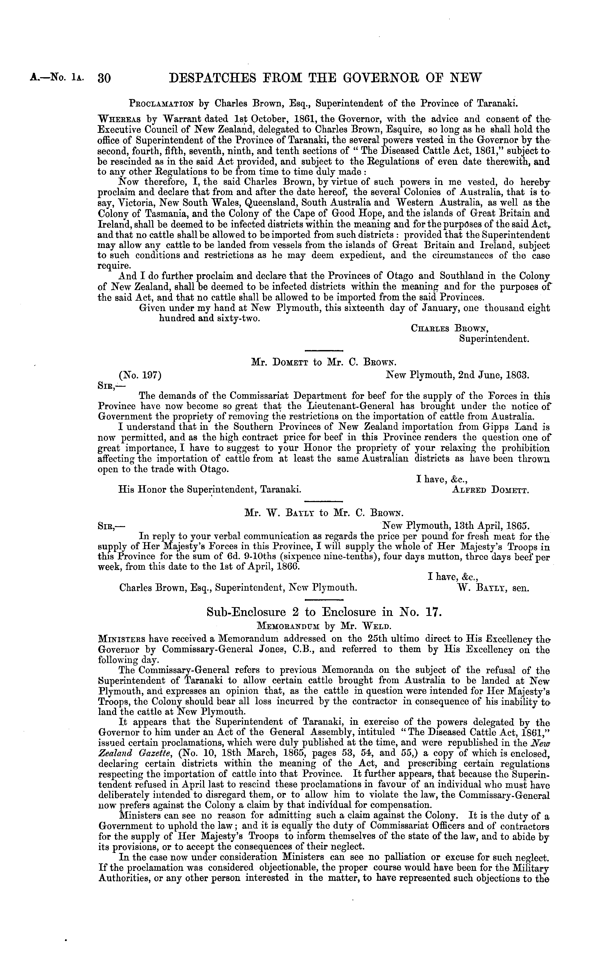 Mr. Domett to Mr. C Brown. (No. 197) New Plymouth, 2nd June, 1863. Sir — The demands of the Commissariat Department for beef for the supply of the Forces in this Province have now become so great that the Lieutenant-General has brought under the notice of Government the propriety of removing the restrictions on the importation of cattle from Australia. I understand that in the Southern Provinces of New Zealand importation from Gipps Land is now permitted, and as the high contract price for beef in this Province renders the question one of great importance, I have to suggest to your Honor the propriety of your relaxing tho prohibition affecting the importation of cattle from at least the same Australian districts as have been thrown open to the trade with Otago. I have, &c, His Honor the Superintendent, Taranaki. Alfred Domett.