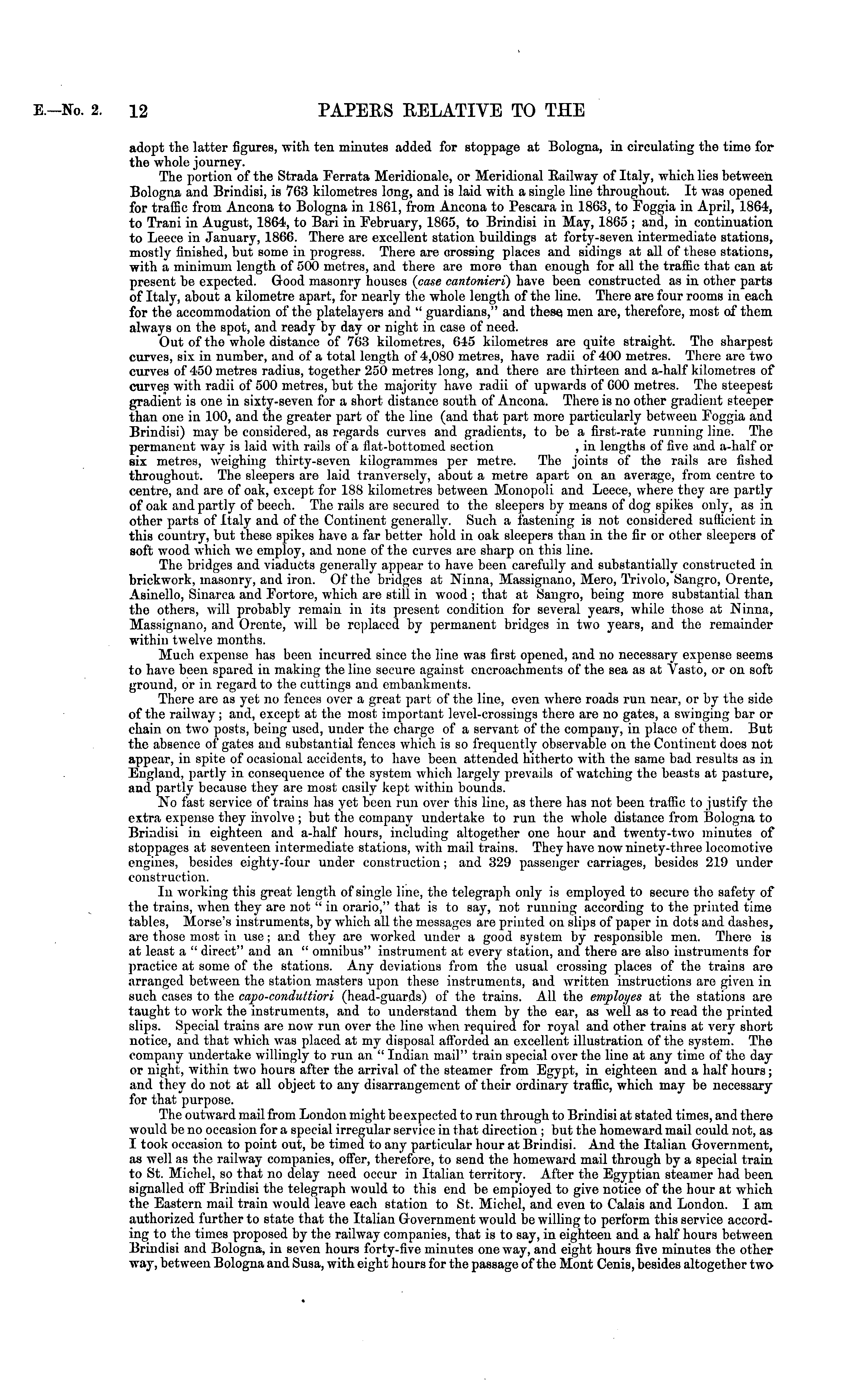 adopt the latter figures, with ten minutes added for stoppage at Bologna, in circulating the time for the whole journey. The portion of the Strada Ferrata Meridionale, or Meridional Railway of Italy, which lies between. Bologna and Brindisi, is 703 kilometres long, and is laid with a single line throughout. It was opened for traffic from Ancona to Bologna in 1861, from Ancona to Pescara in 1863, to Foggia in April, 1864, to Trani in August, 1864, to Bari in February, 1865, to Brindisi in May, 1865 ; and, in continuation to Leece in January, 1866. There are excellent station buildings at forty-seven intermediate stations, mostly finished, but some in progress. There are arossing places and sidings at all of these stations, with a minimum length of 500 metres, and there are more than enough for all the traffic that can at present be expected. Good masonry houses (case cantonieri) have been constructed as in other parts of Italy, about a kilometre apart, for nearly the whole length of the line. There are four rooms in each for the accommodation of the platelayers and " guardians," and these men are, therefore, most of them always on the spot, and ready by day or night in case of need. Out of the whole distance of 763 kilometres, 645 kilometres are quite straight. The sharpest curves, six in number, and of a total length of 4,080 metres, have radii of 400 metres. There are two curves of 450 metres radius, together 250 metres long, and there are thirteen and a-half kilometres of curves with radii of 500 metres, but the majority have radii of upwards of 600 metres. The steepest gradient is one in sixty-seven for a short distance south of Ancona. There is no other gradient steeper than one in 100, and the greater part of the line (and that part more particularly between Foggia and Brindisi) may be considered, as regards curves and gradients, to be a first-rate running line. The permanent way is laid with rails of a flat-bottomed section , in lengths of five and a-half or six metres, weighing thirty-seven kilogrammes per metre. The joints of the rails are fished throughout. The sleepers are laid tranversely, about a metre apart on an average, from centre to centre, and are of oak, except for ISS kilometres between Monopoli and Leece, where they are partly of oak and partly of beech. The rails are secured to the sleepers by means of dog spikes only, as in other parts of Italy and of the Continent generally. Such a fastening is not considered sufficient in this country, but these spikes have a far better hold in oak sleepers than in the fir or other sleepers of soft wood which we employ, and none of the curves are sharp on this line. The bridges and viaducts generally appear to have been carefully and substantiallv constructed in brickwork, masonry, and iron. Of the bridges at Ninna, Massignano, Mero, Trivolo, Sangro, Orente, Asinello, Sinarca and Fortore, which are still in wood ; that at Sangro, being more substantial than the others, will probably remain in its present condition for several years, while those at Ninna, Massignano, and Orente, will bo replaced by permanent bridges in two years, and the remainder within twelve months. Much expense has been incurred since the line was first opened, and no necessary expense seems to have been spared in making the line secure against encroachments of the sea as at Vasto, or on soft ground, or in regard to the cuttings and embankments. There are as yet no fences over a great part of the line, even where roads run near, or by the side of the railway; and, except at the most important level-crossings there are no gates, a swinging bar or chain on two posts, being used, under the charge of a servant of the company, in place of them. But the absence of gates and substantial fences which is so frequently observable on the Continent does not appear, in spite of ocasional accidents, to have been attended hitherto with the same bad results as in. England, partly in consequence of the system whicli largely prevails of watching the beasts at pasture, and partly because they are most easily kept within bounds. No fast service of trains has yet been run over this line, as there has not been traffic to justify the extra expense they involve ; but the company undertake to run the whole distance from Bologna to Brindisi in eighteen and a-half hours, including altogether one hour and twenty-two minutes of stoppages at seventeen intermediate stations, with mail trains. They have now ninety-three locomotive engines, besides eighty-four under construction; and 329 passenger carriages, besides 219 under construction. In working this great length of single line, the telegraph only is employed to secure the safety of the trains, when they are not " in orario," that is to say, not running according to the printed time tables, Morse's instruments, by which all the messages are printed on slips of paper in dots and dashes, arc those most in use; and they are worked under a good system by responsible men. There is at least a " direct" and an " omnibus" instrument at every station, and there are also instruments for practice at some of the stations. Any deviations from the usual crossing places of the trains are arranged between the station masters upon these instruments, and written instructions are given in such cases to the capo-concluttiori (head-guards) of the trains. All the employes at the stations are taught to work the instruments, and to understand them by the ear, as well as to read the printed slips. Special trains are now run over the line when required for royal and other trains at very short notice, and that which was placed at my disposal afforded an excellent illustration of the system. The company undertake willingly to run an " Indian mail" train special over the line at any time of the day or night, within two hours after the arrival of the steamer from Egypt, in eighteen and a half hours; and they do not at all object to any disarrangement of their ordinar