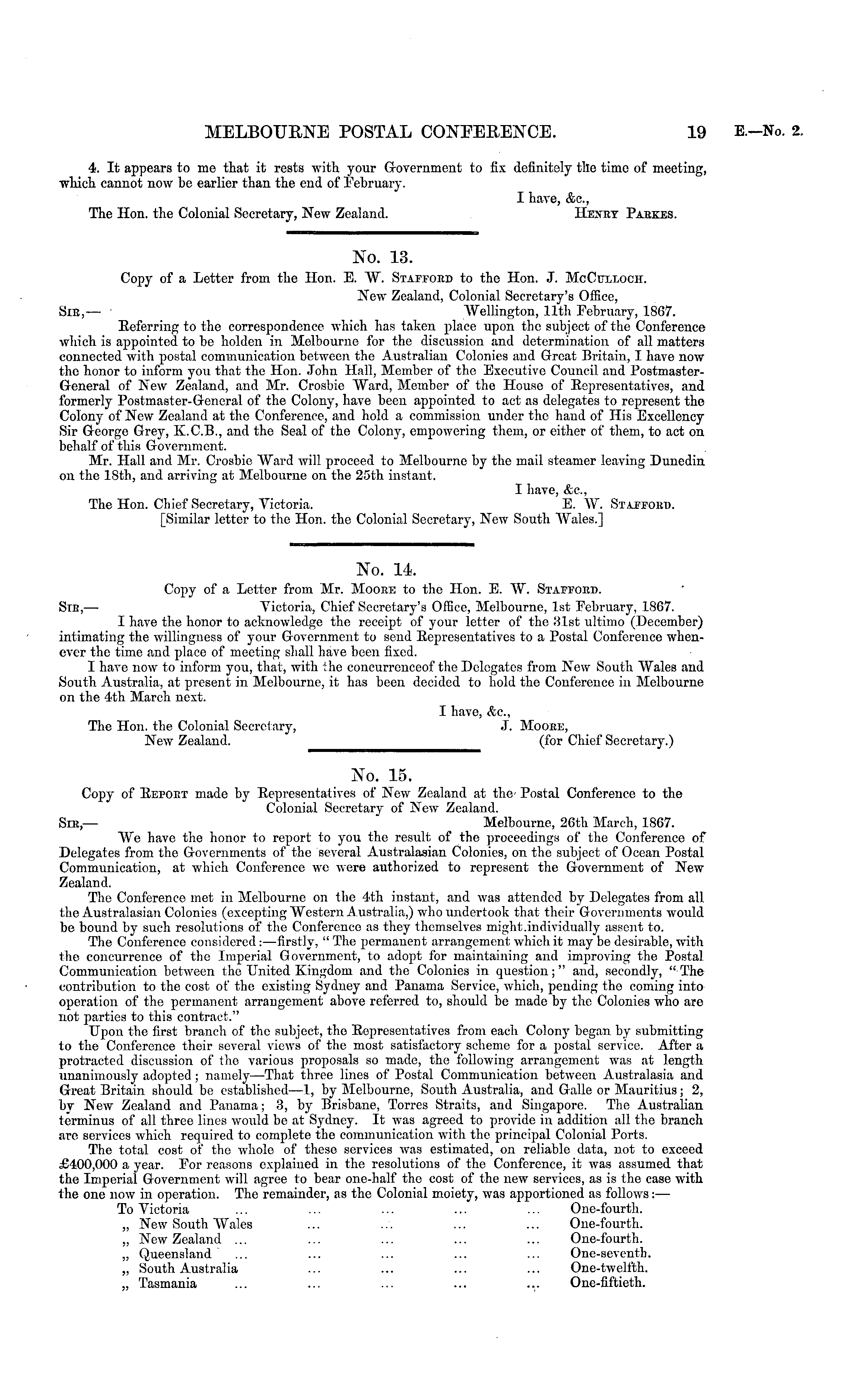No. 15. Copy of Report made by Representatives of New Zealand at the- Postal Conference to the Colonial Secretary of New Zealand. Sie, — Melbourne, 2Gtli March, 1867. "We have the honor to report to you the result of the proceedings of the Conference of Delegates from the Governments of the several Australasian Colonies, on the subject of Ocean Postal Communication, at which Conference we were authorized to represent the Government of New Zealand. The Conference met in Melbourne on the 4th instant, and was attended by Delegates from all the Australasian Colonies (excepting Western Australia,) who undertook that their Governments would be bound by such resolutions of the Conference as they themselves might .individually assent to. The Conference considered: —firstly, " The permanent arrangement which it may be desirable, with the concurrence of the Imperial Government, to adopt for maintaining and improving the Postal Communication between the United Kingdom and the Colonies in question;" and, secondly, "The contribution to the cost of the existing Sydney and Panama Service, which, pending the coming into operation of the permanent arrangement above referred to, should be made by the Colonies who are not parties to this contract." Upon the first branch of the subject, the Representatives from each Colony began by submitting to the Conference their several views of the most satisfactory scheme for a postal service. After a protracted discussion of the various proposals so made, the following arrangement was at length unanimously adopted; namely —That three lines of Postal Communication between Australasia and Great Britain should be established—l, by Melbourne, South Australia, and Galle or Mauritius; 2, by New Zealand and Panama; 3, by Brisbane, Torres Straits, and Singapore. The Australian terminus of all three lines would be at Sydney. It was agreed to provide in addition all the branch are services which required to complete the communication with the principal Colonial Ports. The total cost of the whole of these services was estimated, on reliable data, not to exceed £400,000 a year. For reasons explained in the resolutions of the Conference, it was assumed that the Imperial Government will agree to bear one-half the cost of the new services, as is the case with the one now in operation. The remainder, as the Colonial moiety, was apportioned as follows:— To Victoria ... ... ... ... ... One-fourth. „ New South "Wales ... .:. ... ... One-fourth. „ New Zealand ... ... ... ... ... One-fourth. „ Queensland ... ... ... ... ... One-seventh. „ South Australia ... ... ... ... One-twelfth. „ Tasmania ... ... ... ... . v One-fiftieth.