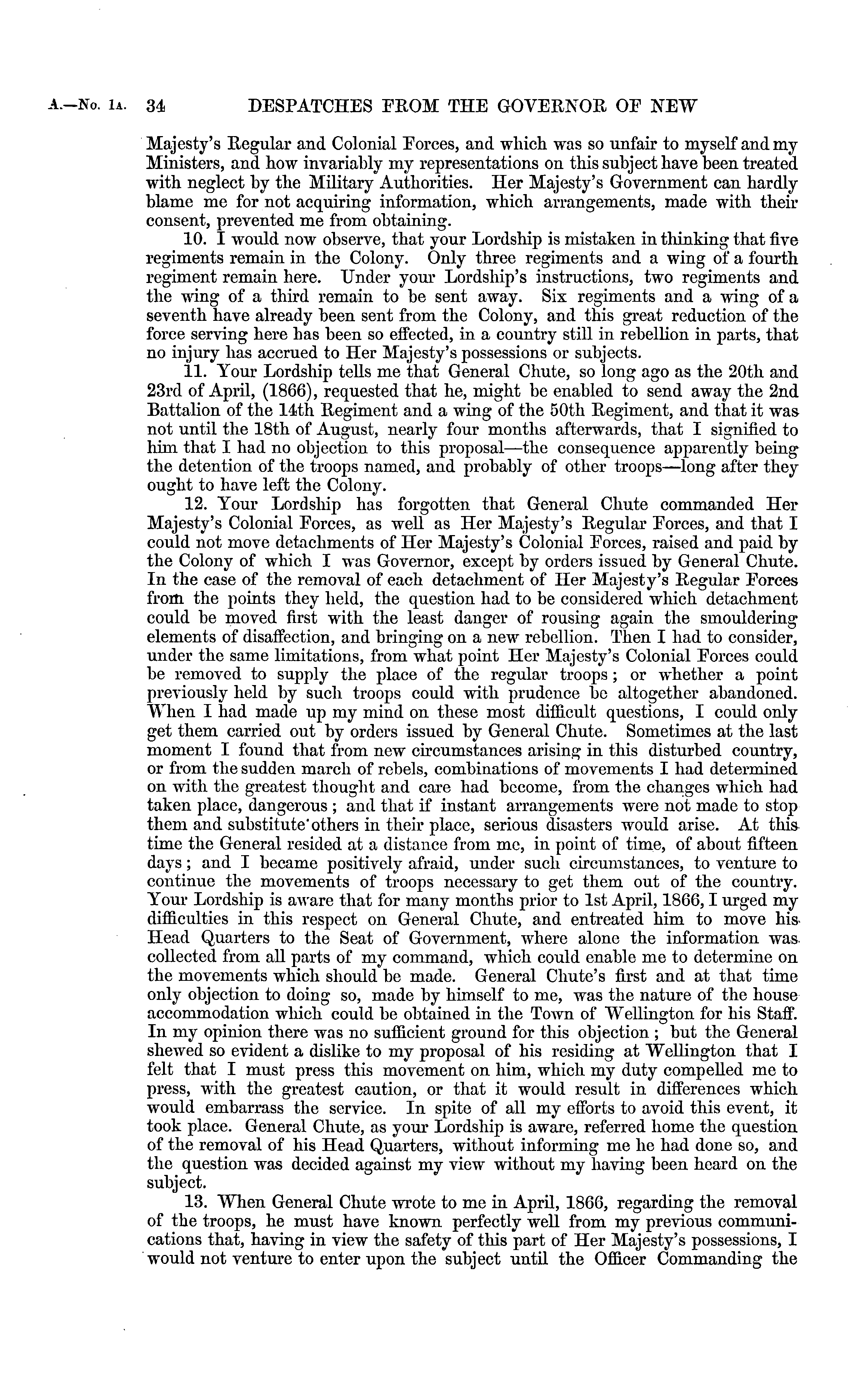 Majesty's Regular and Colonial Eorces, and which was so unfair to myself and my Ministers, and how invariably my representations on this subject have been treated with neglect by the Military Authorities. Her Majesty's Government can hardly blame me for not acquiring information, which arrangements, made with their consent, prevented me from obtaining. 10. I would now observe, that your Lordship is mistaken in thinking that five regiments remain in the Colony. Only three regiments and a wing of a fourth regiment remain here. Under your Lordship's instructions, two regiments and the wing of a third remain to be sent away. Six regiments and a wing of a seventh have already been sent from the Colony, and this great reduction of the force serving here bas been so effected, in a country still in rebelHon in parts, that no injury has accrued to Her Majesty's possessions or subjects. 11. Your Lordship teUs me that General Chute, so long ago as the 20th and 23rd of April, (1866), requested that he, might be enabled to send away the 2nd Battalion of the 14th Regiment and a wing of the 50th Regiment, and that it was not until the 18th of August, nearly four months afterwards, that I signified to him that I had no objection to this proposal—the consequence apparently being the detention of the troops named, and probably of other troops—long after they ought to have left the Colony. 12. Your Lordship has forgotten that General Chute commanded Her Majesty's Colonial Eorces, as weH as Her Majesty's Regular Eorces, and that I could not move detachments of Her Majesty's Colonial Eorces, raised and paid by the Colony of which I was Governor, except by orders issued by General Chute. In the case of the removal of each detachment of Her Majesty's Regular Eorces from the points they held, the question had to be considered which detachment could be moved first with the least danger of rousing again the smouldering elements of disaffection, and bringing on a new rebellion. Then I had to consider, under the same limitations, from what point Her Majesty's Colonial Eorces could be removed to supply the place of the regular troops; or whether a point previously held by such troops could with prudence be altogether abandoned. When I had made up my mind on these most difficult questions, I could only get them carried out by orders issued by General Chute. Sometimes at the last moment I found that from new circumstances arising in this disturbed country, or from the sudden march of rebels, combinations of movements I had determined on with the greatest thought and care had become, from the changes which had taken place, dangerous ; and that if instant arrangements were not made to stop them and substitute'others in their place, serious disasters would arise. At this time the General resided at a distance from me, in point of time, of about fifteen days; and I became positively afraid, under such circumstances, to venture to continue the movements of troops necessary to get them out of the country. Your Lordship is aware that for many months prior to Ist April, 1866,1 urged my difficulties in this respect on General Chute, and entreated him to move hisIlead Quarters to the Seat of Government, where alone the information was collected from all parts of my command, which could enable me to determine on the movements which should be made. General Chute's first and at that time only objection to doing so, made by himself to me, was the nature of the house accommodation which could be obtained in the Town of Wenington for his Staff. In my opinion there was no sufficient ground for this objection ; but the General shewed so evident a dislike to my proposal of his residing at Wellington that I felt that I must press this movement on him, wliich my duty compeUed me to press, with the greatest caution, or that it would result in differences which would embarrass the service. In spite of all my efforts to avoid this event, it took place. General Chute, as your Lordship is aware, referred home the question of the removal of his Head Quarters, without informing me he had done so, and the question Avas decided against my view without my having been heard on the subject. 13. When General Chute wrote to me in April, 1866, regarding the removal of the troops, he must have known perfectly weH from my previous communications that, having in view the safety of this part of Her Majesty's possessions, I would not venture to enter upon the subject until the Officer Commanding the