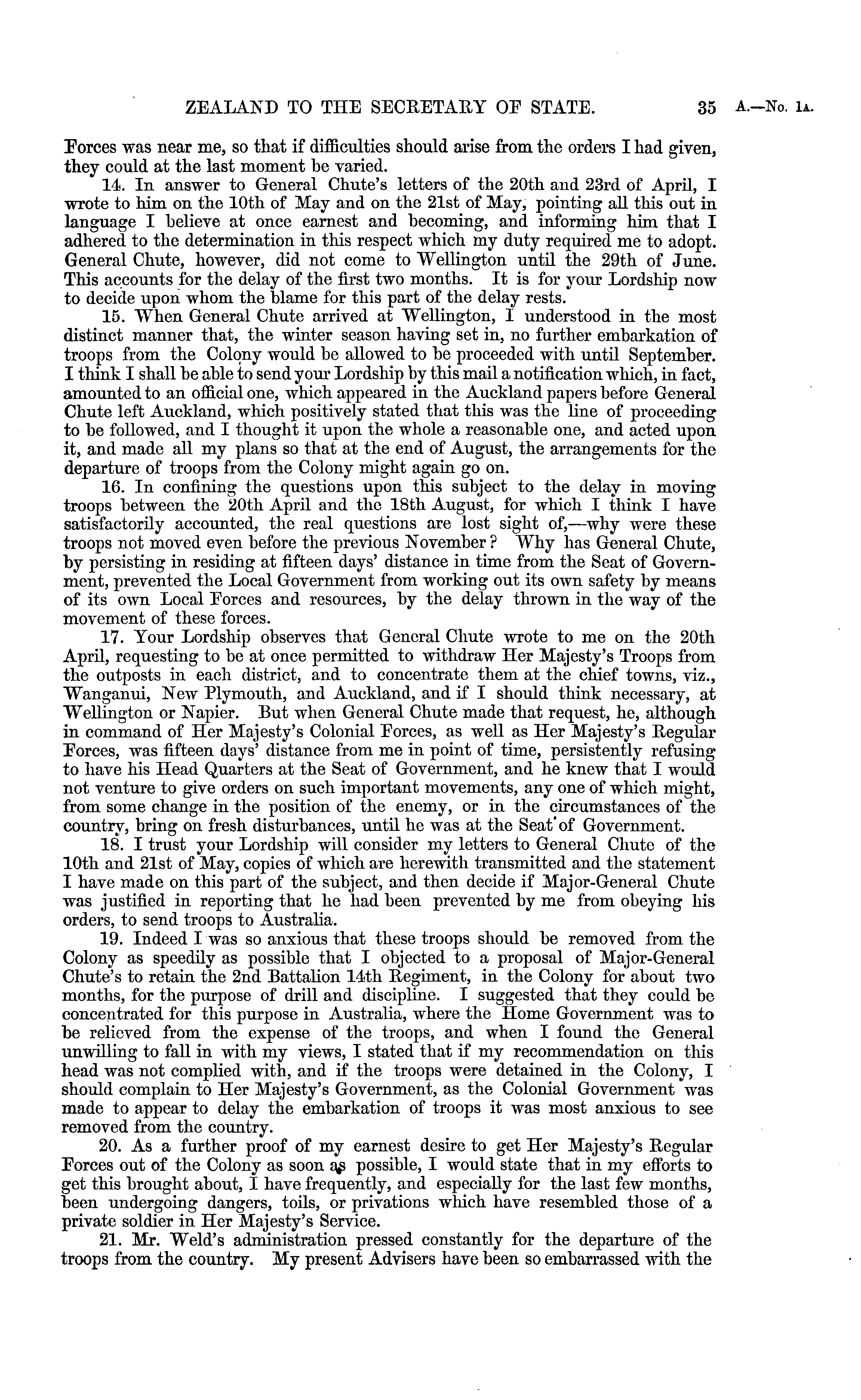 Eorces was near me, so that if difficulties should arise from the orders I had given, they could at the last moment be varied. 14. In answer to General Chute's letters of the 20th and 23rd of April, I wrote to him on the 10th of May and on the 21st of May, pointing aU this out in language I believe at once earnest and becoming, and informing him that I adhered to the determination in this respect which my duty required me to adopt. General Chute, however, did not come to Wellington until the 29th of June. This accounts for the delay of the first two months. It is for your Lordship now to decide upon whom the blame for this part of the delay rests. 15. When General Chute arrived at WeUington, I understood in the most distinct manner that, the winter season having set in, no further embarkation of troops from the Colony would be aUowed to be proceeded with until September. I think I shall be able to send your Lordship by this mail a notification wliich, in fact, amounted to an official one, which appeared in the Auckland papers before General Chute left Auckland, which positively stated that this was the line of proceeding to be followed, and I thought it upon the whole a reasonable one, and acted upon it, and made all my plans so that at the end of August, the arrangements for the departure of troops from the Colony might again go on. 16. In confining the questions upon this subject to the delay in moving troops between the 20th April and the 18th August, for which I think I have satisfactorily accounted, the real questions are lost sight of,—why were these troops not moved even before the previous November ? Why has General Chute, by persisting in residing at fifteen days' distance in time from the Seat of Government, prevented the Local Government from working out its own safety by means of its own Local Eorces and resources, by the delay thrown in the way of the movement of these forces. 17. Your Lordship observes that General Chute wrote to me on the 20th April, requesting to be at once permitted to withdraw Her Majesty's Troops from the outposts in each district, and to concentrate them at the chief towns, viz., Wanganui, New Plymouth, and Auckland, and if I should think necessary, at WeUington or Napier. But when General Chute made that request, he, although in command of Her Majesty's Colonial Eorces, as well as Her Majesty's Regular Eorces, was fifteen days' distance from me in point of time, persistently refusing to have his Head Quarters at the Seat of Government, and he knew that I would not venture to give orders on such important movements, any one of which might, from some change in the position of the enemy, or in the circumstances of the country, bring on fresh disturbances, until he was at the Seat'of Government. 18. I trust your Lordship will consider my letters to General Chute of the 10th and 21st of May, copies of which are herewith transmitted and the statement I have made on this part of the subject, and then decide if Major-General Chute was justified in reporting that he had been prevented by me from obeying his orders, to send troops to Australia. 19. Indeed I was so anxious that these troops should be removed from the Colony as speedily as possible that I objected to a proposal of Major-General Chute's to retain the 2nd BattaHon 14th Regiment, in the Colony for about two months, for the purpose of drill and discipline. I suggested that they could be concentrated for this purpose in Australia, where the Home Government was to be relieved from the expense of the troops, and when I found the General unwilling to fall in with my views, I stated that if my recommendation on this head was not complied with, and if the troops were detained in the Colony, I should complain to Her Majesty's Government, as the Colonial Government was made to appear to delay the embarkation of troops it was most anxious to see removed from the country. 20. As a further proof of my earnest desire to get Her Majesty's Regular Eorces out of the Colony as soon a^ possible, I would state that in my efforts to get this brought about, I have frequently, and especiaUy for the last few months, been undergoing dangers, toils, or privations wliich have resembled those of a private soldier in Her Majesty's Service. 21. Mr. Weld's administration pressed constantly for the departure of the troops from the country. My present Advisers have been so embarrassed with the