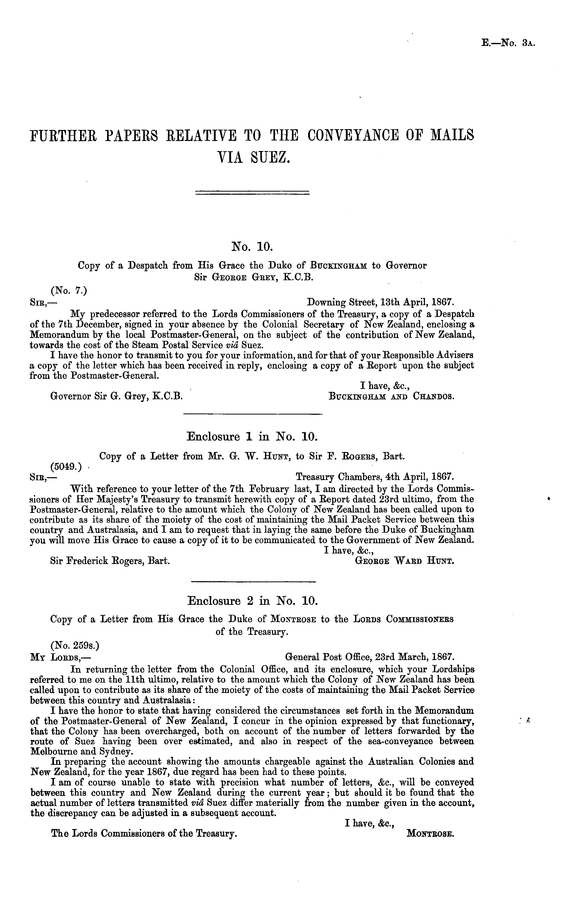 No. 10. Copy of a Despatch from His Grace the Duke of Buckingham to Governor Sir George Geet, K.C.B. (No. 7.) Sie,— Downing Street, 13th April, 1867. My predecessor referred to the Lords Commissioners of the Treasury, a copy of a Despatch of the 7th December, signed in your absence by the Colonial Secretary of New Zealand, enclosing a Memorandum by the local Postmaster-General, on the subject of the contribution of New Zealand, towards the cost of the Steam Postal Service via Suez. I have the honor to transmit to you for your information, and for that of your Responsible Advisers a copy of the letter which has been received in reply, enclosing a copy of a Report upon the subject from the Postmaster-General. I have, &c, Governor Sir G. Grey, K.C.B. Buckingham and Chandos.