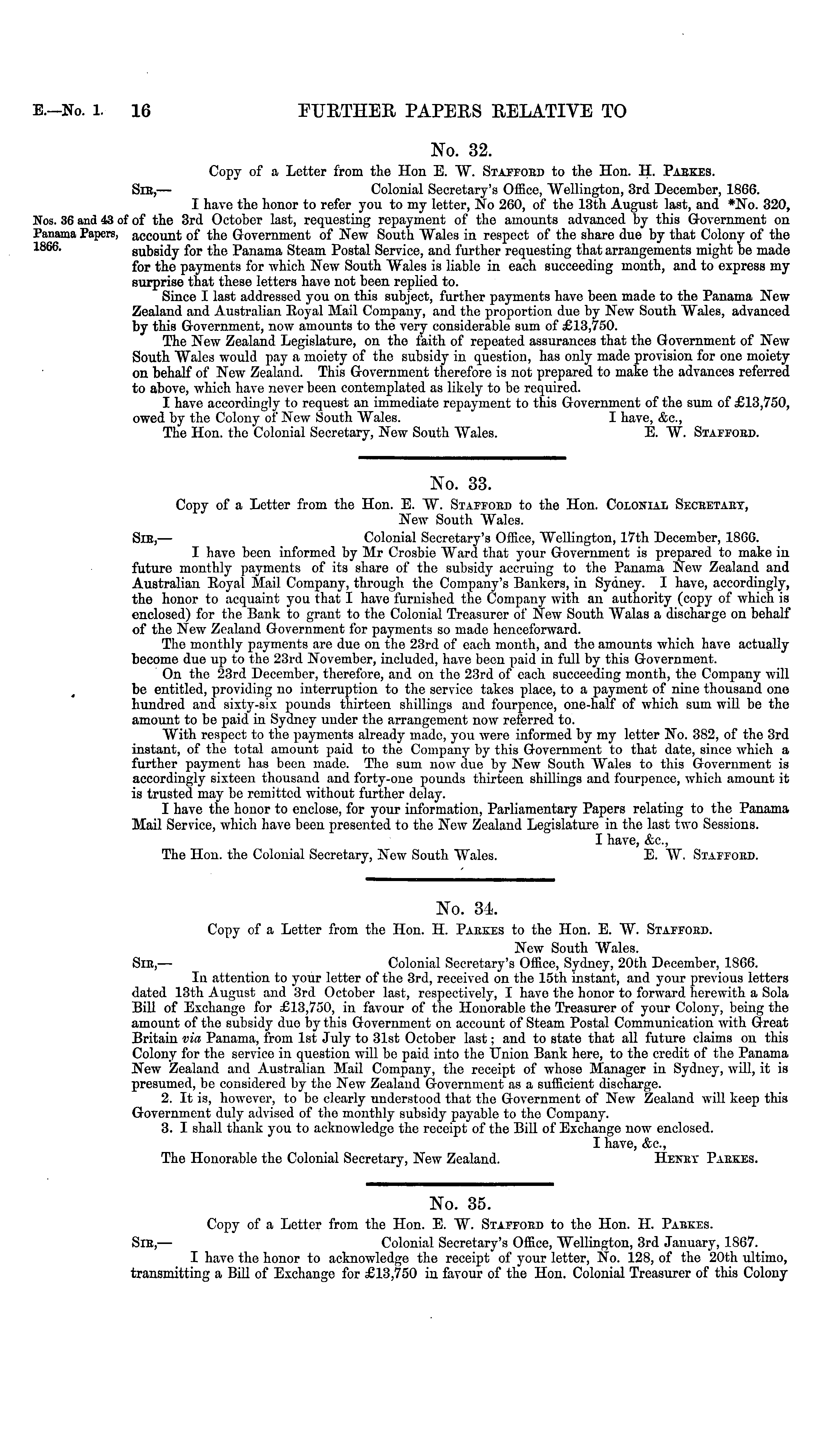 No. 34. Copy of a Letter from the Hon. H. Paekes to the Hon. E. W. Stafford. New South Wales. Sir, — Colonial Secretary's Office, Sydney, 20th December, 1866. In attention to your letter of the 3rd, received on the 15th instant, and your previous letters dated 13th August and 3rd October last, respectively, I have the honor to forward herewith a Sola Bill of Exchange for £13,750, in favour of the Honorable the Treasurer of your Colony, being the amount of the subsidy duo by this Government on account of Steam Postal Communication with Great Britain via Panama, from Ist July to 31st October last; and to state that all future claims on this Colony for the service in question will be paid into the Union Bank here, to the credit of the Panama New Zealand and Australian Mail Company, the receipt of whose Manager in Sydney, will, it is presumed, be considered by the New Zealand Government as a sufficient discharge. 2. It is, however, to be clearly understood that the Government of New Zealand will keep this Government duly advised of the monthly subsidy payable to the Company. 3. I shall thank you to acknowledge the receipt of the Bill of Exchange now enclosed. I have, &c, The Honorable the Colonial Secretary, New Zealand. Hexby Parkes.