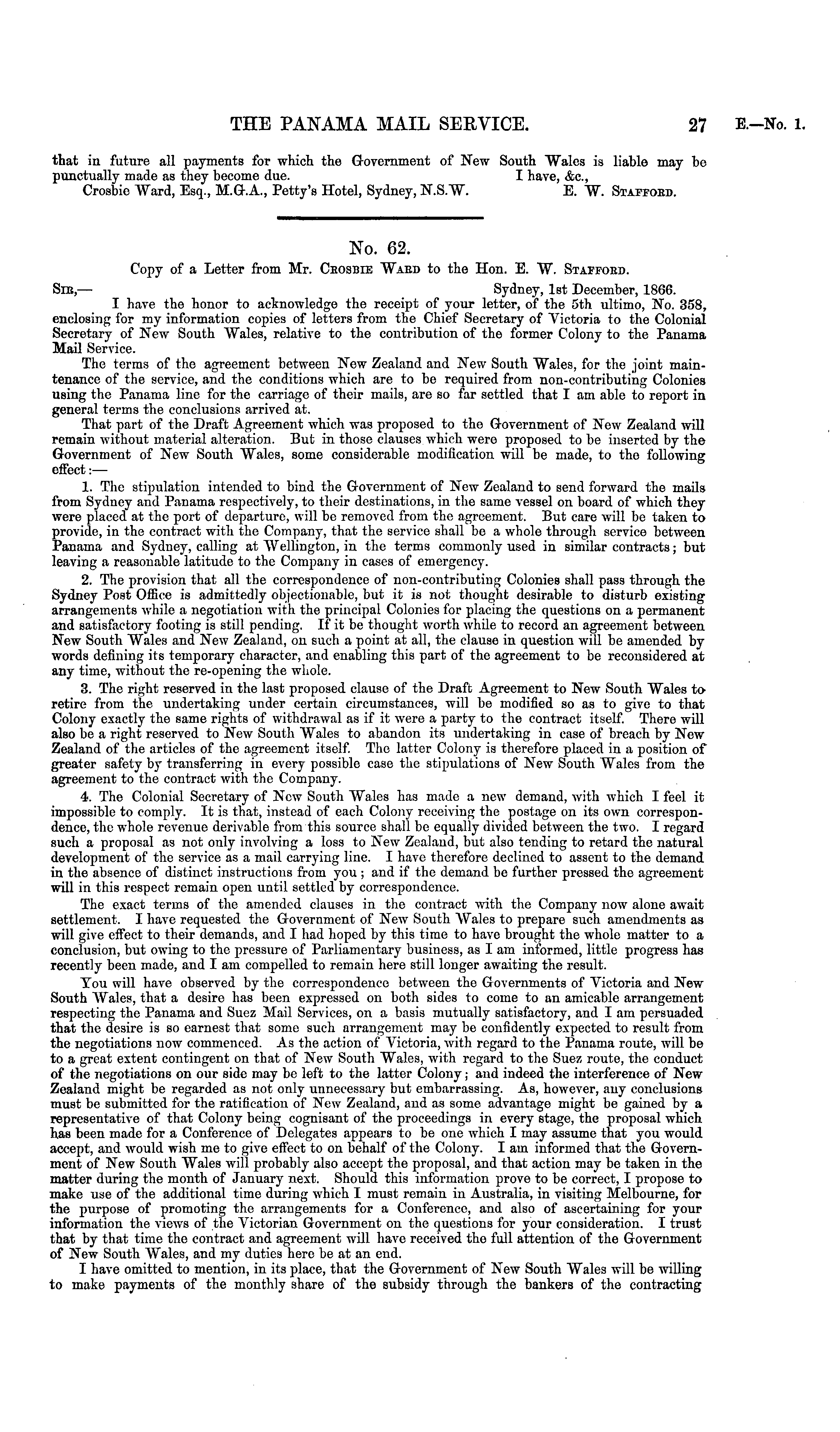 No. 62. Copy of a Letter from Mr. Ceosbie Waed to the Hon. E. W. Staffobd. Sic, — Sydney, Ist December, 1860. I have the honor to acknowledge the receipt of your letter, of the sth ultimo, No. 358, enclosing for my information copies of letters from the Chief Secretary of Victoria to the Colonial Secretary of New South Wales, relative to the contribution of the former Colony to the Panama Mail Service. The terms of the agreement between New Zealand and New South Wales, for the joint maintenance of the service, and the conditions which are to be required from non-contributing Colonies using the Panama line for the carriage of their mails, are so far settled that I am able to report in general terms the conclusions arrived at. That part of the Draft Agreement which was proposed to the Government of New Zealand will remain without material alteration. But in those clauses which were proposed to be inserted by the Government of New South Wales, some considerable modification will bo made, to the following effect: — 1. The stipulation intended to bind the Government of New Zealand to send forward the mails from Sydney and Panama respectively, to their destinations, in the same vessel on board of which they were placed at the port of departure, will be removed from the agreement. But care will be taken to provide, in the contract with the Company, that the service shall be a whole through service between Panama and Sydney, calling at Wellington, in the terms commonly used in similar contracts; but leaving a reasonable latitude to the Company in cases of emergency. 2. The provision that all the correspondence of non-contributing Colonies shall pass through the Sydney Post Office is admittedly objectionable, but it is not thought desirable to disturb existing arrangements while a negotiation with the principal Colonies for placing the questions on a permanent and satisfactory footing is still pending. If it be thought worth while to record an agreement between New South Wales and New Zealand, on such a point at all, the clause in question will be amended by words defining its temporary character, and enabling this part of the agreement to be reconsidered at any time, without the re-opening the whole. 3. The right reserved in the last proposed clause of the Draft Agreement to New South Wales toretire from the undertaking under certain circumstances, will be modified so as to give to that Colony exactly the same rights of withdrawal as if it were a party to the contract itself. There will also be a right reserved to New South Wales to abandon its undertaking in case of breach by New Zealand of the articles of the agreement itself. The latter Colony is therefore placed in a, position of greater safety by transferring in every possible case the stipulations of New South Wales from the agreement to the contract with the Company. 4. The Colonial Secretary of New South Wales has made a new demand, with which I feel it impossible to comply. It is that, instead of each Colony receiving the postage on its own correspondence, the whole revenue derivable from this source shall be equally divided between the two. I regard such a proposal as not only involving a loss to New Zealand, but also tending to retard the natural development of the service as a mail carrying line. I have therefore declined to assent to the demand in the absence of distinct instructions from you ; and if the demand be further pressed the agreement will in this respect remain open until settled by correspondence. The exact terms of the amended clauses in the contract with the Company now alone await settlement. I have requested the Government of New South Wales to prepare such amendments as will give effect to their demands, and I had hoped by this time to have brought the whole matter to a conclusion, but owing to the pressure of Parliamentary business, as I am informed, little progress has recently been made, and I am compelled to remain here still longer awaiting the result. You will have observed by tho correspondence between the Governments of Victoria and New South AVales, that a desire has been expressed on both sides to come to an amicable arrangement respecting the Panama and Suez Mail Services, on a basis mutually satisfactory, and I am persuaded that the desire is so earnest that some such arrangement may be confidently expected to result from the negotiations now commenced. As the action of Victoria, with regard to the Panama route, will be to a great extent contingent on that of New South Wales, with regard to the Suez route, the conduct of the negotiations on our side may bo left to the latter Colony; and indeed the interference of New Zealand might be regarded as not only unnecessary but embarrassing. As, however, any conclusions must be submitted for the ratification of New Zealand, and as some advantage might be gained by a representative of that Colony being cognisant of the proceedings in every stage, the proposal which has been made for a Conference of Delegates appears to be one which I may assume that you would accept, and would wish me to give effect to on behalf of the Colony. lam informed that the Government of New South Wales will probably also accept the proposal, and that action may be taken in the matter during the month of January next. Should this information prove to be correct, I propose to make use of the additional time during which I must remain in Australia, in visiting Melbourne, for the purpose of promoting the arrangements for a Conference, and also of ascertaining for your information the views of the Victorian Government on the questions for your consideration. I trust that by that time the contract and agreement will have received the full attention of the Government of New South Wales, and my duties here be at an end. I have omitted to mention, in its place, that the Government of New South Wales will be willing to make payments of the monthly share of the subsidy through the bankers of th