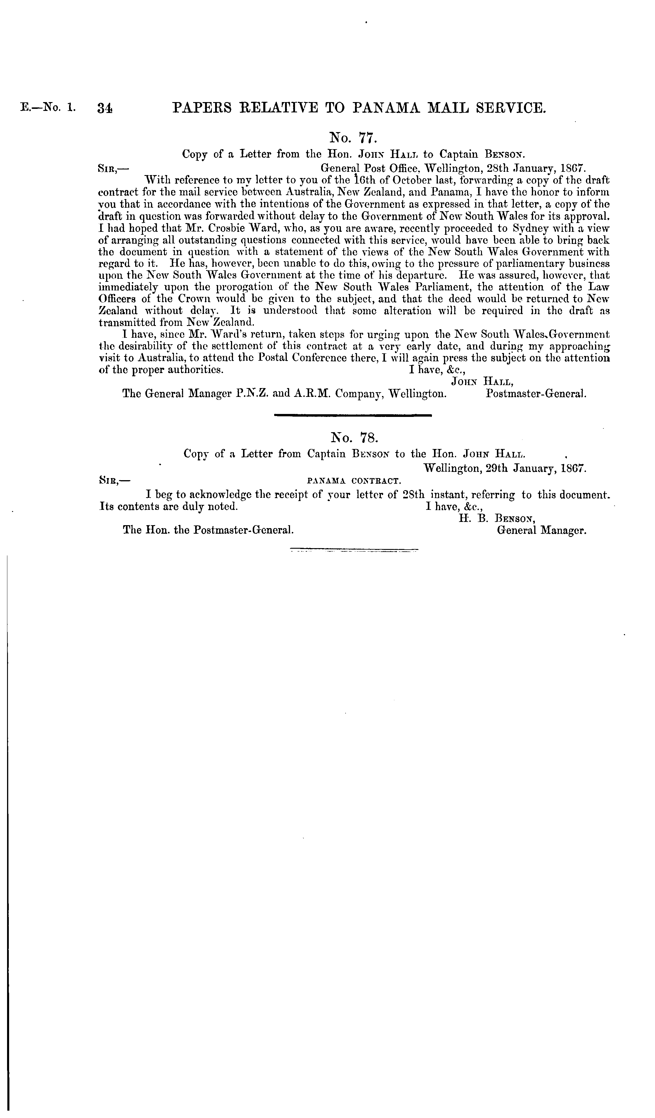 No. 78. Copy of a Letter from Captain Bexsox to the Hon. John Hall. AVellington, 29th January, 18G7. SlB, PANAMA COXTBACT. I beg to acknowledge the receipt of your letter of 28th instant, referring to this document. Its contents are duly noted. I have, &c, H. B. Bensox, The Hon. the Postmaster-General. General Manager.
