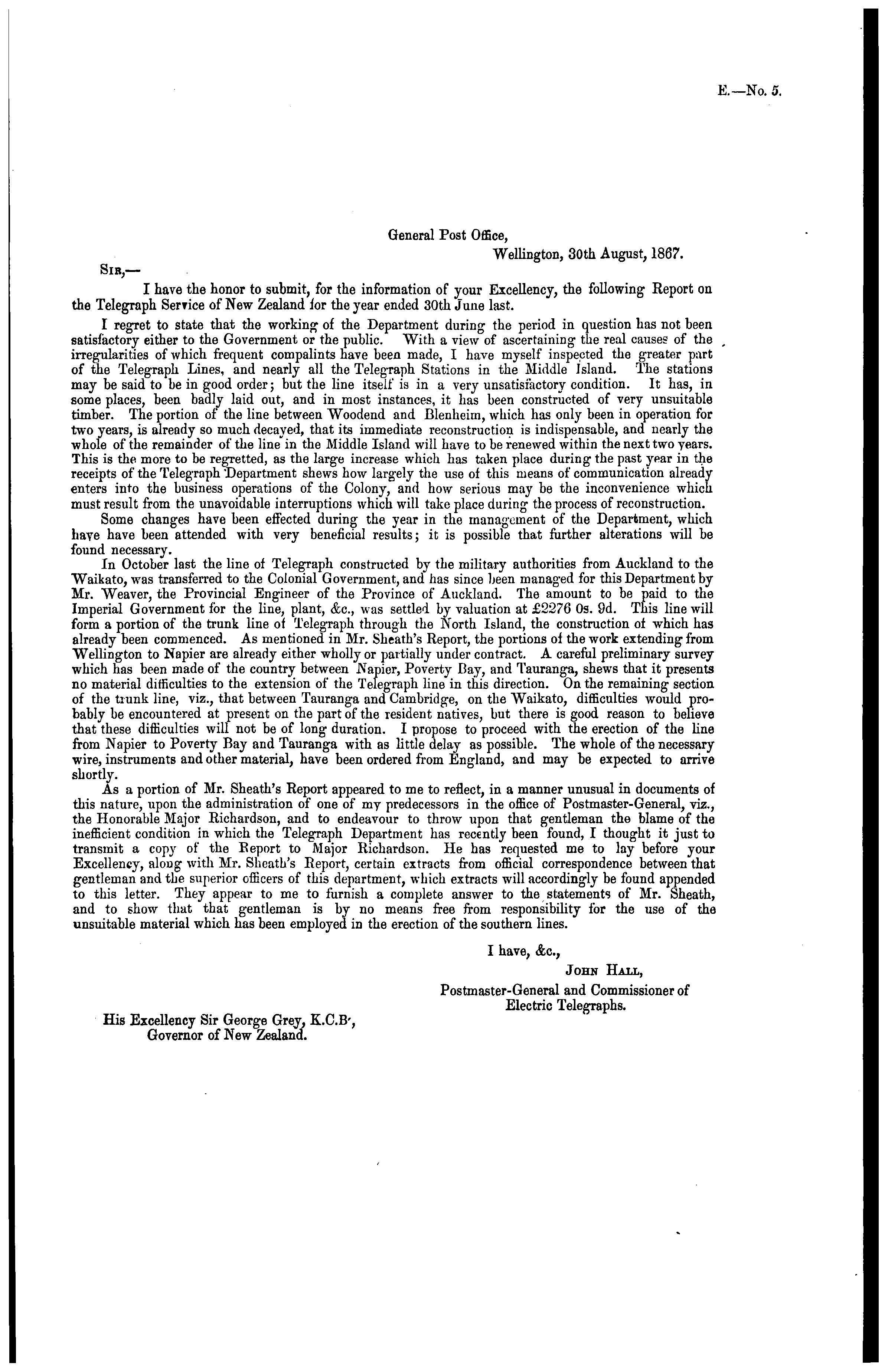 General Post Office, Wellington, 30tli August, 1867. Sib,— I Lave the honor to submit, for the information of your Excellency, the following Report on the Telegraph Serfice of New Zealand ior the year ended 30th June last. I regret to state that the working of the Department during the period in question has not been satisfactory either to the Government or the public. With a view of ascertaining the real causes of the irregularities of which frequent compalints have been made, I have myself inspected the greater part of the Telegraph Lines, and nearly all the Telegraph Stations in the Middle Island. The stations may be said to be in good order; but the line itself is in a very unsatisfactory condition. It has, in some places, been badly laid out, and in most instances, it has been constructed of very unsuitable timber. The portion of the line between Woodend and Blenheim, which has only been in operation for two years, is already so much decayed, that its immediate reconstruction is indispensable, and nearly the whole of the remainder of the line in the Middle Island will have to be renewed within the next two years. This is the more to be regretted, as the large increase which has taken place during the past year in the receipts of the Telegraph "Department shews how largely the use of this means of communication already enters into the business operations of the Colony, and how serious may be the inconvenience which must result from the unavoidable interruptions which will take place during the process of reconstruction. Some changes have been effected during the year in the management of the Department, which have have been attended with very beneficial results; it is possible that further alterations will be found necessary. In October last the line of Telegraph constructed by the military authorities from Auckland to the Waikato, was transferred to the Colonial Government, and lias since been managed for this Department by Mr. Weaver, the Provincial Engineer of the Province of Auckland. The amount to be paid to the Imperial Government for the line, plant, &c, was settled by valuation at £2276 03. Od. This line will form a portion of the trunk line of Telegraph through the North Island, the construction of which has already been commenced. As mentioned in Mr. Sheath's Report, the portions of the work extending from Wellington to Napier are already either wholly or partially under contract. A careful preliminary survey which has been made of the country between .Napier, Poverty Bay, and Taurang-a, shews that it presents no material difficulties to the extension of the Telegraph line in this direction. On the remaining- section of the trunk line, viz., that between Tauranga and Cambridg-e, on the Waikato, difficulties would probably be encountered at present on the part of the resident natives, but there is good reason to believe that these difficulties will not be of long duration. I propose to proceed with the erection of the line from Napier to Poverty Bay and Tauranga with as little delay as possible. The whole of the necessary wire, instruments and other material, have been ordered from England, and may be expected to arrive shortly. As a portion of Mr. Sheath's Report appeared to me to reflect, in a manner unusual in documents of this nature, upon the administration of one of my predecessors in the office of Postmaster-General, viz., the Honorable Major Richardson, and to endeavour to throw upon that gentleman tho blame of the inefficient condition in which the Telegraph Department has recently been found, I thought it just to transmit a copy of the Eeport to Major Richardson. He has requested me to lay before your Excellency, along with Mr. Sheath's Report, certain extracts from official correspondence between that gentleman and the superior officers of this department, which extracts will accordingly be found appended to this letter. They appear to me to furnish a complete answer to the statements of Mr. Sheath, and to show that that gentleman is by no means free from responsibility for the use of the unsuitable material which has been employed in the erection of the southern lines. I have, &c, John Hall, Postmaster-General and Commissioner of Electric Telegraphs. His Excellency Sir George Grey, K.C.B-, Governor of New Zealand.