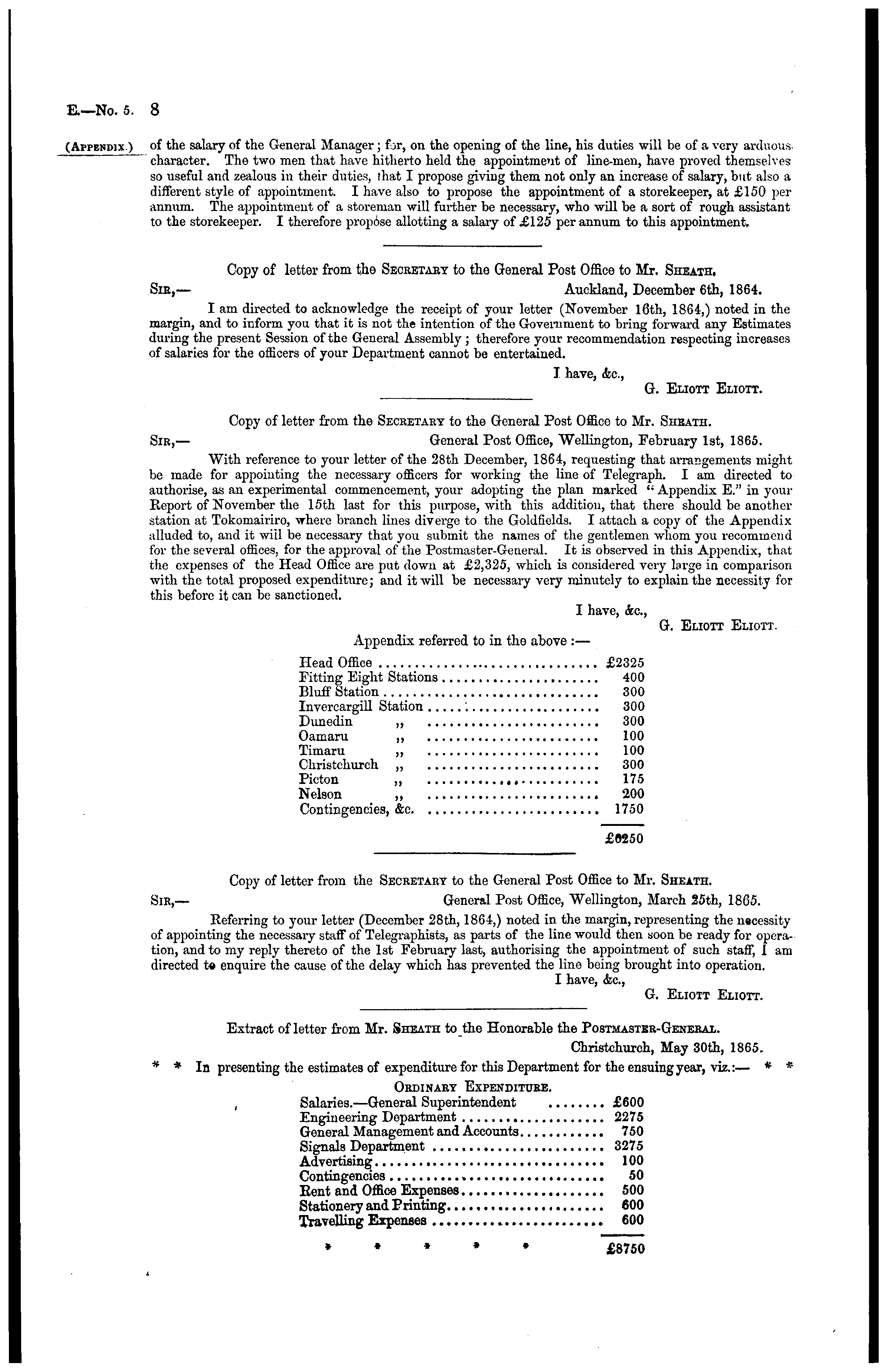 Copy of letter from the Secretary to the General Post Office to Mr. Sheath. Sir,— General Post Office, Wellington, March 25th, 1865. Referring to your letter (December 28th, 1864,) noted in the margin, representing the necessity of appointing the necessary staff of Telegraphists, as parts of the line ■would then soon be ready for operation, and to my reply thereto of the Ist February last, authorising the appointment of such staff, I am directed t» enquire the cause of the delay which has prevented the line being brought into operation. I have, &c, G. Eliott Eliott. Extract of letter from Mr. Sheath to the Honorable the Postmaster-General. Christchurch, May 30th, 1865. * * In presenting the estimates of expenditure for this Department for the ensuing year, viz.: — * * Ordinary Expenditure. , Salaries.—General Superintendent £600 Engineering Department 2275 General Management and Accounts 750 Signals Department 3275 Advertising 100 Contingencies 50 Eent and Office Expenses 500 Stationery and Printing 600 Travelling Expenses 600 » • » • • £8750