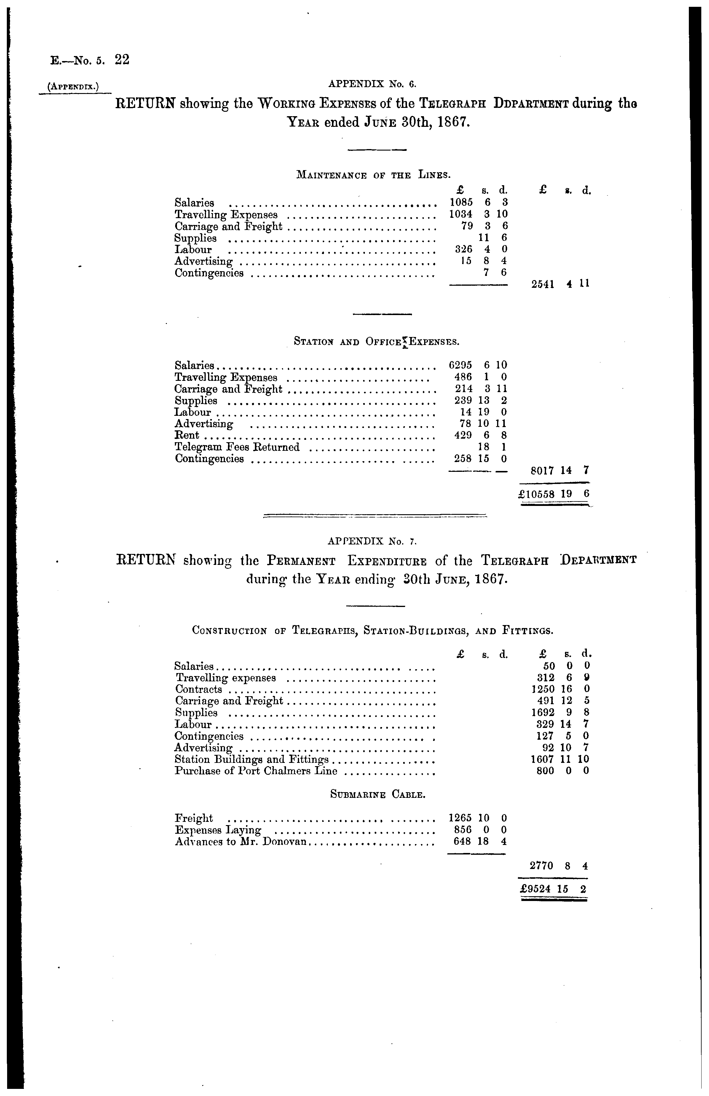 APPENDIX No. 7. EETUEN showing the Permanent Expenditure of the Telegraph Department during1 the Ykar ending 30th June, 1867Construction of Telegraphs, Station-Buildings, and Fittings. £ s. d. £ s. d. Salaries 50 0 0 Travelling expenses 312 6 9 Contracts 1250 16 0 Carriage and Freight 49112 5 Supplies 1692 9 8 Labour 329 14 7 Contingencies 127 5 0 Advertising 92 10 7 Station Buildings and Fittings 1607 11 10 Purchase of Port Chalmers Line 800 0 0 Submarine Cable. Freight 1265 10 0 Expenses Laying 856 0 0 Advances to Air. Donovan 648 18 4 2770 8 4 £9524 15 2