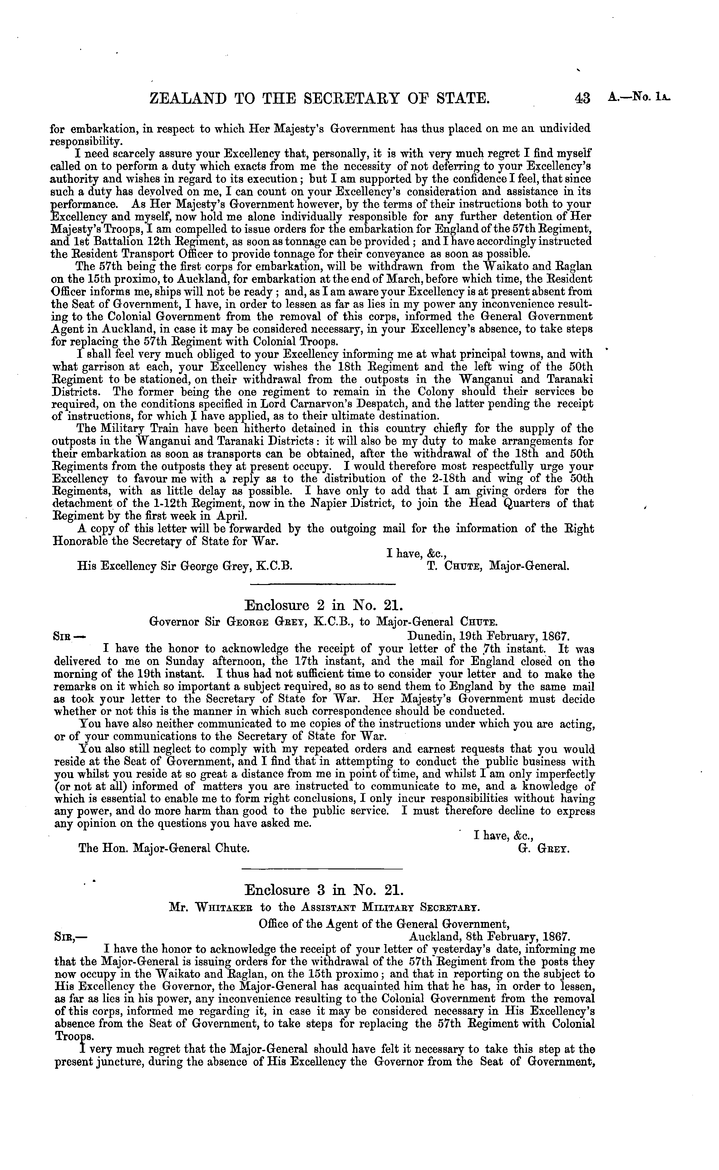 Enclosure 2 in No. 21. Governor Sir George Gret, K.C.8., to Major-General CnuTE. Sir — Dunedin, 19th February, 1867. I have the honor to acknowledge the receipt of your letter of the 7th instant. It was delivered to me on Sunday afternoon, the 17th instant, and the mail for England closed on the morning of the 19th instant. I thus had not sufficient time to consider your letter and to make the remarks on it which so important a subject required, so as to send them to England by the same mail as took your letter to the Secretary of State for War. Her Majesty's Government must decide whether or not this is the manner in which such correspondence should be conducted. You have also neither communicated to me copies of the instructions under which you are acting, or of your communications to the Secretary of State for War. You also still neglect to comply with my repeated orders and earnest requests that you would reside at the Seat of Government, and I find that in attempting to conduct the public business with you whilst you reside at so great a distance from me in point of time, and whilst I am only imperfectly (or not at all) informed of matters you are instructed to communicate to me, and a knowledge of which is essential to enable me to form right conclusions, I only incur responsibilities without having any power, and do more harm than good to the public service. I must therefore decline to express any opinion on the questions you have asked me. I have, &c, The Hon. Major-General Chute. G. Gret.