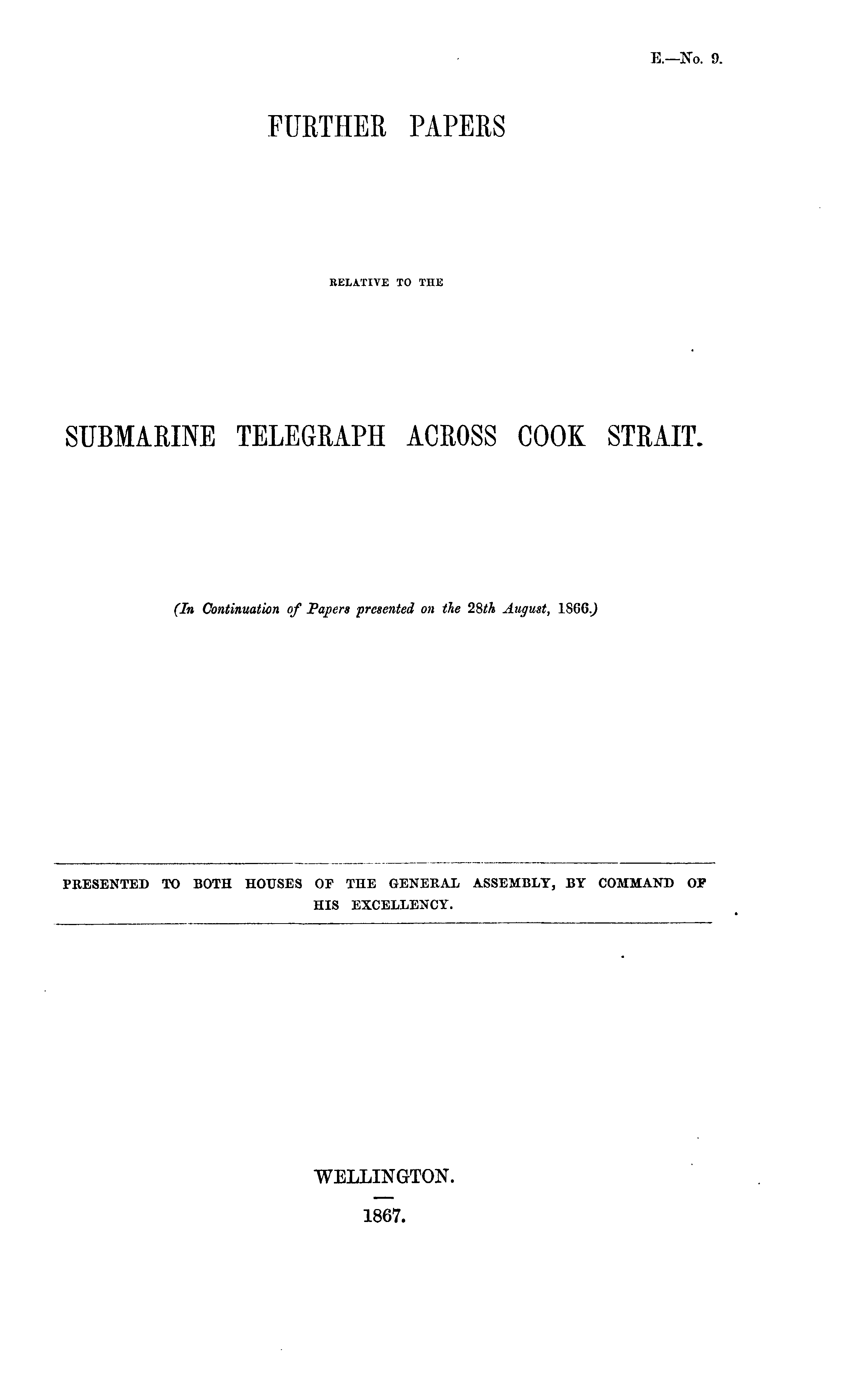 FURTHER PAPERS RELATIVE TO THE SUBMARINE TELEGRAPH ACROSS COOK STRAIT.