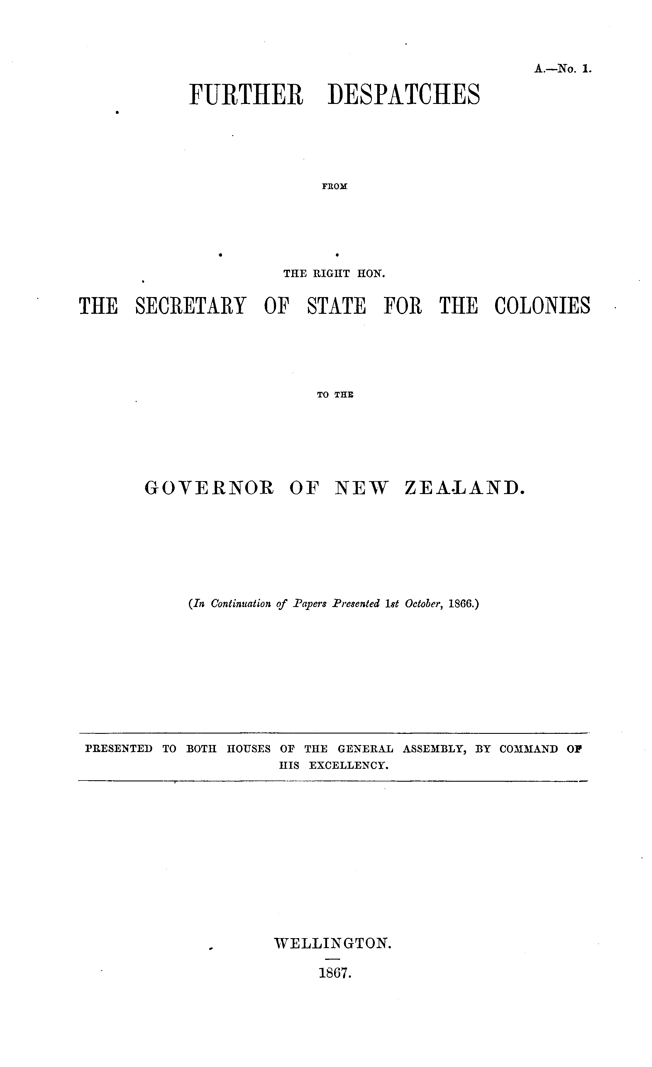FURTHER DESPATCHES FROM THE RIGHT HON. THE SECRETARY OF STATE FOR THE COLONIES TO THE GOVERNOR OF NEW ZEALAND.