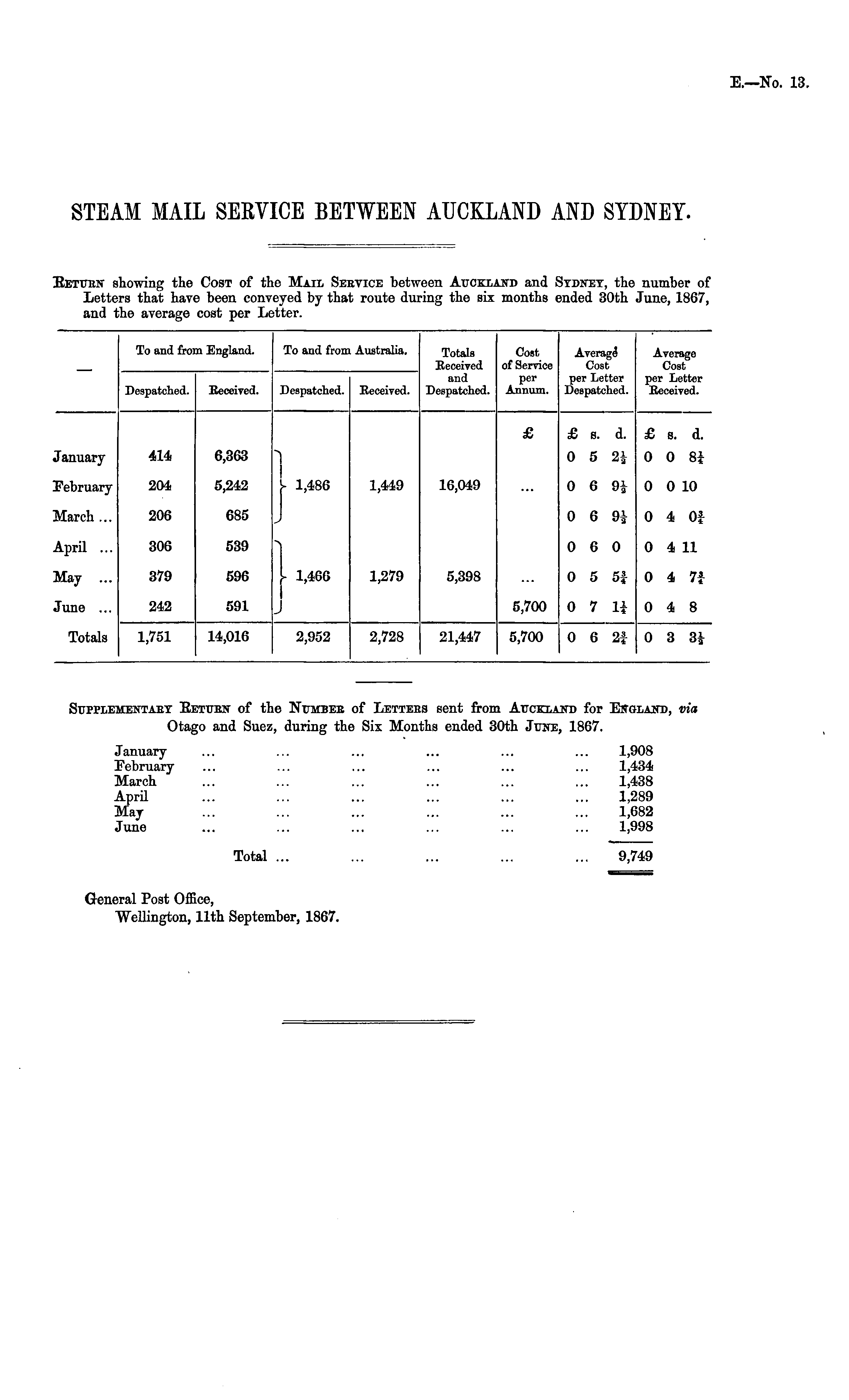 To and from England. To and froi Australia. Totals Received and Despatched. Cost of Service per Annum. Average Cost per Letter Despatched. Average Cost per Letter Received. Despatched. Received. Despatched. Received. £ £ s. d. £ s. d. January 414 6,363 0 5 2| 0 0 8i Eebruary 204 5,242 1,486 1,449 16,049 0 6 9| 0 0 10 March ... 206 685 0 6 9^ 0 4 0| April ... 306 539 0 6 0 0 4 11 May ... 379 596 1,466 1,279 5,398 0 5 5f 0 4 7| June ... 242 591 5,700 0 7 1| 0 4 8 Totals 1,751 14,016 2,952 2,728 21,447 5,700 0 6 2* 0 3 8* Supplementary Retuen of the Ntjmbeb of Lettees sent from Auckland for England, via Otago and Suez, during the Six Months ended 30th June, 1867. January ... ... ... ... ... ... 1,908 February ... ... ... ... ... ... 1,434 March ... ... ... ... ... ... 1,438 April ... ... ... ... ... ... 1,289 May ... ... ... ... ... ... 1,682 June ... ... ... ... ... ... 1,998 Total ... ... ... ... ... 9,749 General Post Office, Wellington, 11th September, 1867.