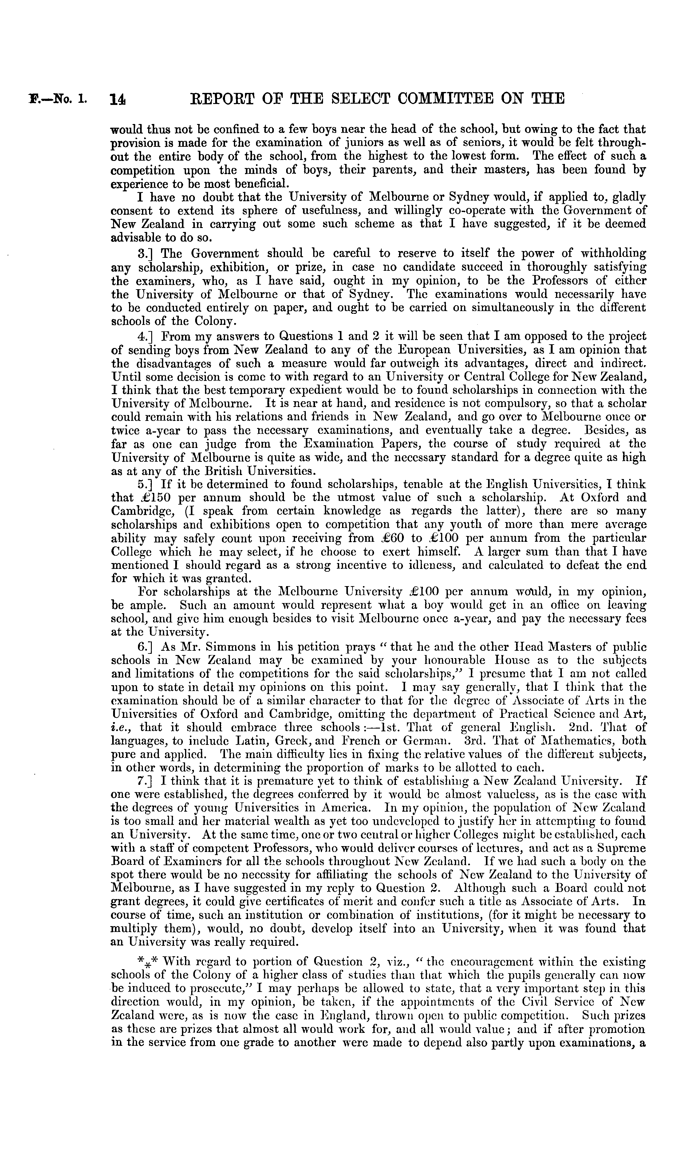would thus not be confined to a few boys near the head of the school, but owing to the fact that provision is made for the examination of juniors as well as of seniors, it would be felt throughout the entire body of the school, from the highest to the lowest form. The effect of such a competition upon the minds of boys, their parents, and their masters, has been found by experience to be most beneficial. I have no doubt that the University of Melbourne or Sydney would, if applied to, gladly consent to extend its sphere of usefulness, and willingly co-operate with the Government of New Zealand in carrying out some such scheme as that I have suggested, if it be deemed advisable to do so. 3.] The Government should be careful to reserve to itself the power of withholding any scholarship, exhibition, or prize, in case no candidate succeed in thoroughly satisfying the examiners, who, as I have said, ought in my opinion, to be the Professors of either the University of Melbourne or that of Sydney. The examinations would necessarily have to be conducted entirely on paper, and ought to be carried on simultaneously in the different schools of the Colony. 4.] From my answers to Questions 1 and 2 it will be seen that I am opposed to the project of sending boys from New Zealand to any of the European Universities, as I am opinion that the disadvantages of such a measure would far outweigh its advantages, direct and indirect. Until some decision is come to with regard to an University or Central College for New Zealand, I think that the best temporary expedient would be to found scholarships in connection with the University of Melbourne. It is near at hand, and residence is not compulsory, so that a scholar could remain with his relations and friends in New Zealand, and go over to Melbourne once or twice a-ycar to pass the necessary examinations, and eventually take a degree. Besides, as far as one can judge from the Examination Papers, the course of study required at the University of Melbourne is quite as wide, and the necessary standard for a degree quite as high as at any of the British Universities. 5.] If it be determined to found scholarships, tenable at the English Universities, I think that £150 per annum should be the utmost value of such a scholarship. At Oxford and Cambridge, (I speak from certain knowledge as regards the latter), there are so many scholarships and exhibitions open to competition that any youth of more than mere average ability may safely count upon receiving from £60 to .£IOO per annum from the particular College which he may select, if he choose to exert himself. A larger sum than that 1 have mentioned I should regard as a strong incentive to idleness, and calculated to defeat the end for which it was granted. Eor scholarships at the Melbourne University .£IOO per annum wotild, in my opinion, be ample. Such an amount would represent what a boy would get in an office on leaving school, and give him enough besides to visit Melbourne once a-year, and pay the necessary fees at the University. 6.] As Mr. Simmons in his petition prays " that he and the other Head Masters of public schools in New Zealand may be examined by your honourable House as to the subjects and limitations of the competitions for the said scholarships," I presume that I am not called upon to state in detail my opinions on this point. I may say generally, that I think that the examination should be of a similar character to that for the degree of Associate of Arts in the Universities of Oxford and Cambridge, omitting the department of Practical Science and Art, i.e., that it should embrace three schools : —lst. That of general English. 2nd. That of languages, to include Latin, Greek, and French or German. 3rd. That of Mathematics, both pure and applied. The main difficulty lies in fixing the relative values of the different subjects, in other words, in determining the proportion of marks to be allotted to each. 7.] I think that it is premature yet to think of establishing a New Zealand University. If one were established, the degrees conferred by it would be almost valueless, as is the case with the degrees of young Universities in America. In my opinion, the population of New Zealand is too small and her material wealth as yet too undeveloped to justify her in attempting to found an University. At the same time, one or two central or higher Colleges might be established, each with a staff' of competent Professors, who would deliver courses of lectures, and act as a Supreme Board of Examiners for all the schools throughout New Zealand. If we had such a body on the spot there would be no necessity for affiliating the schools of New Zealand to the University of Melbourne, as I have suggested in my reply to Question 2. Although such a Board could not grant degrees, it could give certificates of merit and confer such a title as Associate of Arts. In course of time, such an institution or combination of institutions, (for it might be necessary to multiply them), would, no doubt, develop itself into an University, when it was found that an University was really required. *** With regard to portion of Question 2, viz., " the encouragement within the existing schools of the Colony of a higher class of studies than that which the pupils generally can now ■be induced to prosecute," I may perhaps be allowed to state, that a very important step in this direction would, in my opinion, be taken, if the appointments of the Civil Service of New Zealand were, as is now the case in England, thrown open to public competition. Such prizes as these are prizes that almost all would work for, and all would value; and if after promotion in the service from one grade to another were made to depend also partly upon examinations, a