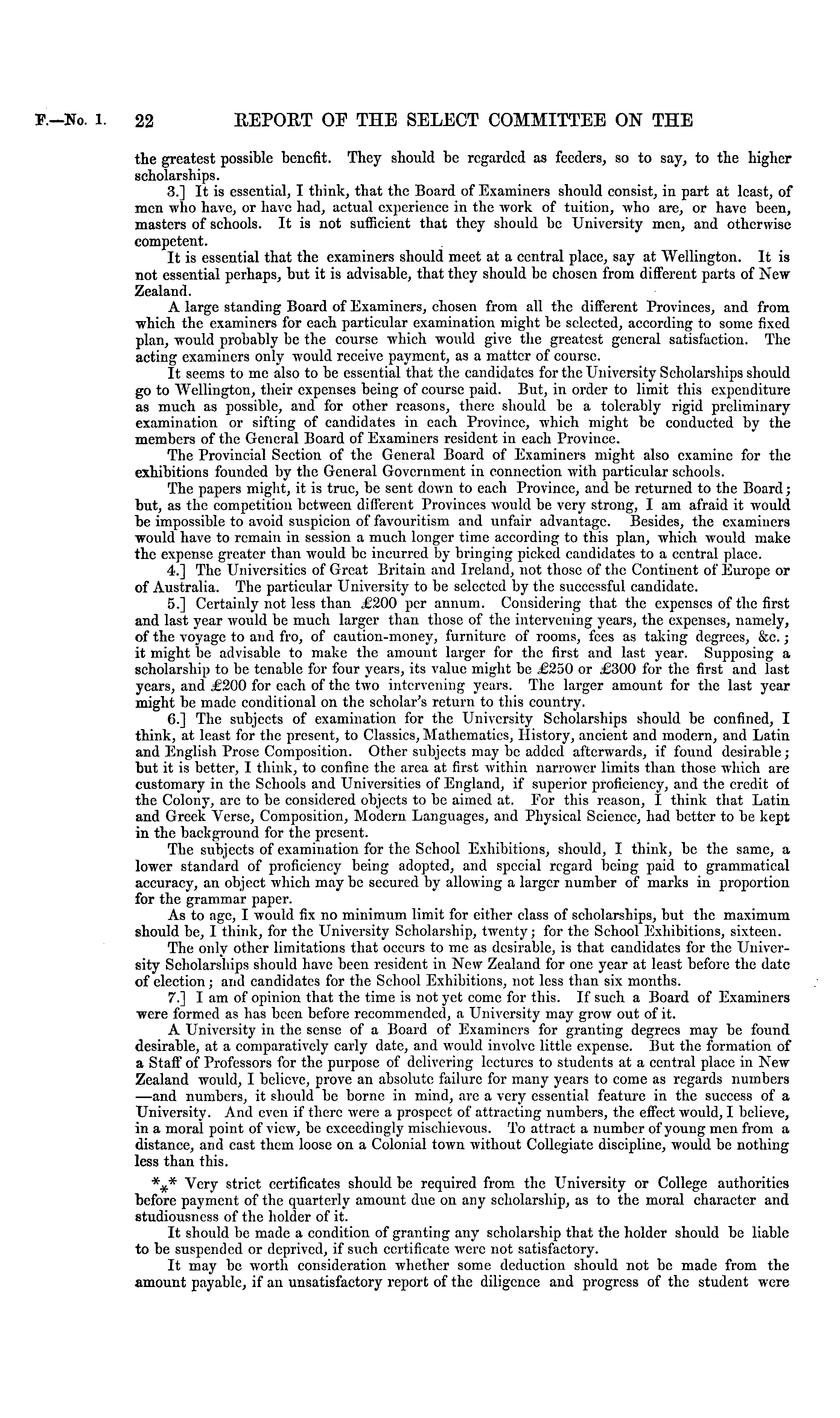 the greatest possible benefit. They should be regarded as feeders, so to say, to the higher scholarships. 3.] It is essential, I think, that the Board of Examiners should consist, in part at least, of men who have, or have had, actual experience in the work of tuition, who are, or have been, masters of schools. It is not sufficient that they should be University men, and otherwise competent. It is essential that the examiners should meet at a central place, say at Wellington. It is not essential perhaps, but it is advisable, that they should be chosen from different parts of New Zealand. A large standing Board of Examiners, chosen from all the different Provinces, and from which the examiners for each particular examination might be selected, according to some fixed plan, would probably be the course which would give the greatest general satisfaction. The acting examiners only would receive payment, as a matter of course. It seems to me also to be essential that the candidates for the University Scholarships should go to Wellington, their expenses being of course paid. But, in order to limit this expenditure as much as possible, and for other reasons, there should be a tolerably rigid preliminary examination or sifting of candidates in each Province, which might be conducted by the members of the General Board of Examiners resident in each Province. The Provincial Section of the General Board of Examiners might also examine for the exhibitions founded by the General Government in connection with particular schools. The papers might, it is true, be sent down to each Province, and be returned to the Board; but, as the competition between different Provinces would be very strong, I am afraid it would be impossible to avoid suspicion of favouritism and unfair advantage. Besides, the examiners would have to remain in session a much longer time according to this plan, which would make the expense greater than would be incurred by bringing picked candidates to a central place. 4.] The Universities of Great Britain and Ireland, not those of the Continent of Europe or of Australia. The particular University to be selected by the successful candidate. 5.] Certainly not less than £200 per annum. Considering that the expenses of the first and last year would be much larger than those of the intervening years, the expenses, namely, of the vovagc to and fro, of caution-money, furniture of rooms, fees as taking degrees, &c.; it might be advisable to make the amount larger for the first and last year. Supposing a scholarship to be tenable for four years, its value might be £250 or £300 for the first and last years, and £200 for each of the two intervening years. The larger amount for the last year might be made conditional on the scholar's return to this country. C] The subjects of examination for the University Scholarships should be confined, I think, at least for the present, to Classics, Mathematics, History, ancient and modern, and Latin and English Prose Composition. Other subjects may be added afterwards, if found desirable; but it is better, I think, to confine the area at first within narrower limits than those which are customary in the Schools and Universities of England, if superior proficiency, and the credit of the Colony, arc to be considered objects to be aimed at. For this reason, I think that Latin and Greek Verse, Composition, Modern Languages, and Physical Science, had better to be kept in the background for the present. The subjects of examination for the School Exhibitions, should, I think, be the same, a lower standard of proficiency being adopted, and special regard being paid to grammatical accuracy, an object which maybe secured by allowing a larger number of marks in proportion for the grammar paper. As to age, I would fix no minimum limit for either class of scholarships, but the maximum should be, I think, for the University Scholarship, twenty; for the School Exhibitions, sixteen. The only other limitations that occurs to me as desirable, is that candidates for the University Scholarships should have been resident in New Zealand for one year at least before the date of election; and candidates for the School Exhibitions, not less than six months. 7.] lam of opinion that the time is not yet come for this. If such a Board of Examiners were formed as has been before recommended, a University may grow out of it. A University in the sense of a Board of Examiners for granting degrees may be found desirable, at a comparatively early date, and would involve little expense. But the formation of a Staff of Professors for the purpose of delivering lectures to students at a central place in New Zealand would, I believe, prove an absolute failure for many years to come as regards numbers —and numbers, it should be borne in mind, are a very essential feature in the success of a University. And even if there were a prospect of attracting numbers, the effect would, I believe, in a moral point of view, be exceedingly mischievous. To attract a number of young men from a distance, and cast them loose on a Colonial town without Collegiate discipline, would be nothing less than this. *#* Very strict certificates should be required from the University or College authorities before payment of the quarterly amount due on any scholarship, as to the moral character and studiousness of the holder of it. It should be made a condition of granting any scholarship that the holder should be liable to be suspended or deprived, if such certificate were not satisfactory. It may be worth consideration whether some deduction should not be made from the amount payable, if an unsatisfactory report of the diligence and progress of the student were