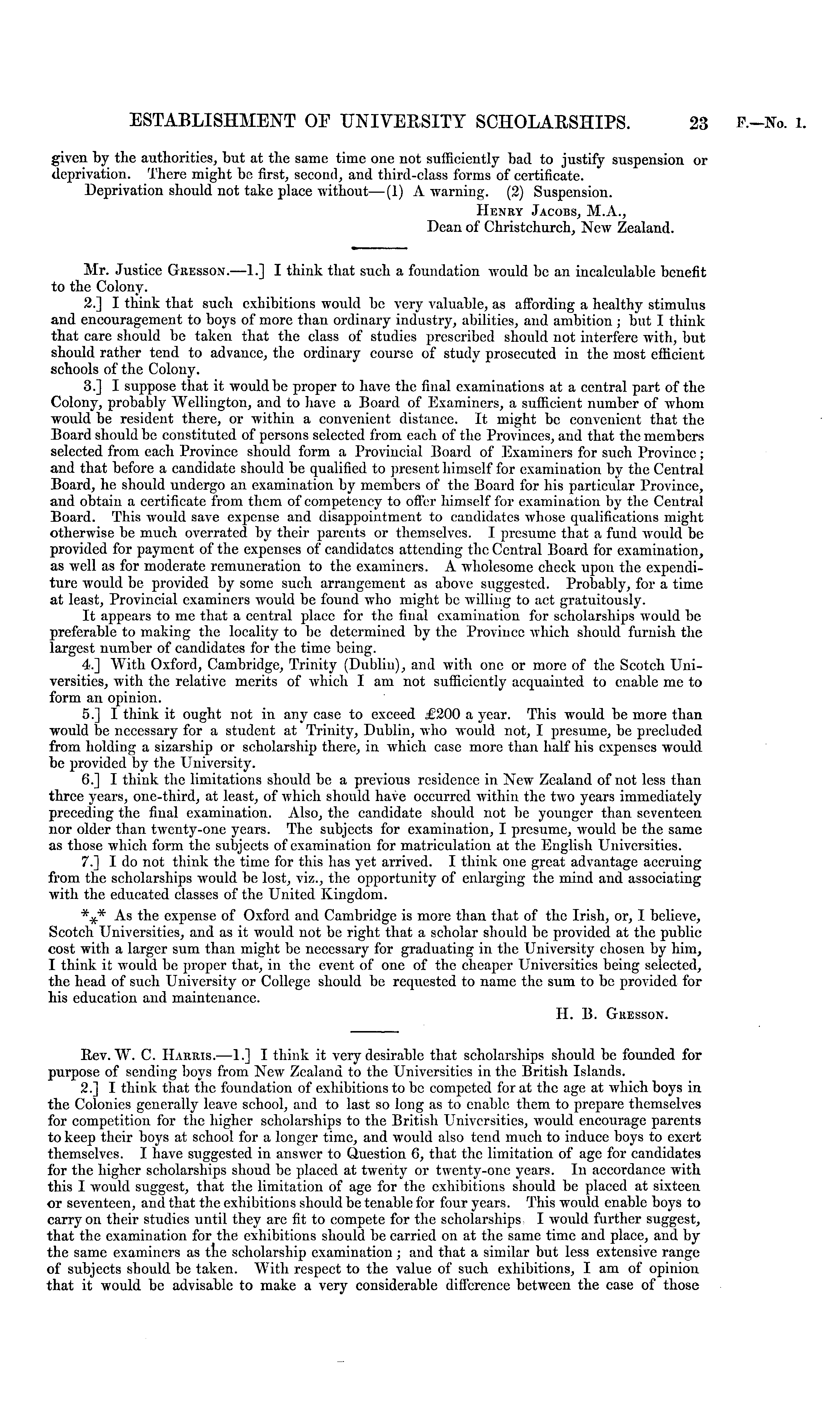 Mr. Justice Gkesson.—l.] I think that such a foundation would be an incalculable benefit to the Colony. 2.] I think that such exhibitions would be very valuable, as affording a healthy stimulus and encouragement to boys of more than ordinary industry, abilities, and ambition ; but I think that care should be taken that the class of studies prescribed should not interfere with, but should rather tend to advance, the ordinary course of study prosecuted in the most efficient schools of the Colony. 3.] I suppose that it would be proper to have the final examinations at a central part of the Colony, probably Wellington, and to have a Board of Examiners, a sufficient number of whom would be resident there, or within a convenient distance. It might be convenient that the Board should be constituted of persons selected from each of the Provinces, and that the members selected from each Province should form a Provincial Board of Examiners for such Province ; and that before a candidate should be qualified to present himself for examination by the Central Board, he should undergo an examination by members of the Board for his particular Province, and obtain a certificate from them of competency to offer himself for examination by the Central Board. This would save expense and disappointment to candidates whose qualifications might otherwise be much overrated by their parents or themselves. I presume that a fund would be provided for payment of the expenses of candidates attending the Central Board for examination, as well as for moderate remuneration to the examiners. A wholesome check upon the expenditure would be provided by some such arrangement as above suggested. Probably, for a time at least, Provincial examiners would be found who might be willing to act gratuitously. It appears to me that a central place for the final examination for scholarships would be preferable to making the locality to be determined by the Province which should furnish the largest number of candidates for the time being. 4.] With Oxford, Cambridge, Trinity (Dublin), and with one or more of the Scotch Universities, with the relative merits of which I am not sufficiently acquainted to enable me to form an opinion. 5.] I think it ought not in any case to exceed £'200 a year. This would be more than would be necessary for a student at Trinity, Dublin, who would not, I presume, be precluded from holding a sizarship or scholarship there, in which case more than half his expenses would be provided by the University. C] I think the limitations should be a previous residence in New Zealand of not less than three years, one-third, at least, of which should have occurred within the two years immediately preceding the final examination. Also, the candidate should not be younger than seventeen nor older than twenty-one years. The subjects for examination, I presume, would be the same as those which form the subjects of examination for matriculation at the English Universities. 7.] Ido not think the time for this has yet arrived. I think one great advantage accruing from the scholarships would be lost, viz., the opportunity of enlarging the mind and associating with the educated classes of the United Kingdom. *.£* As the expense of Oxford and Cambridge is more than that of the Irish, or, I believe, Scotch Universities, and as it would not be right that a scholar should be provided at the public cost with a larger sum than might be necessary for graduating in the University chosen by him, I think it would be proper that, in the event of one of the cheaper Universities being selected, the head of such University or College should be requested to name the sum to be provided for his education and maintenance. 11. B. Gresson.
