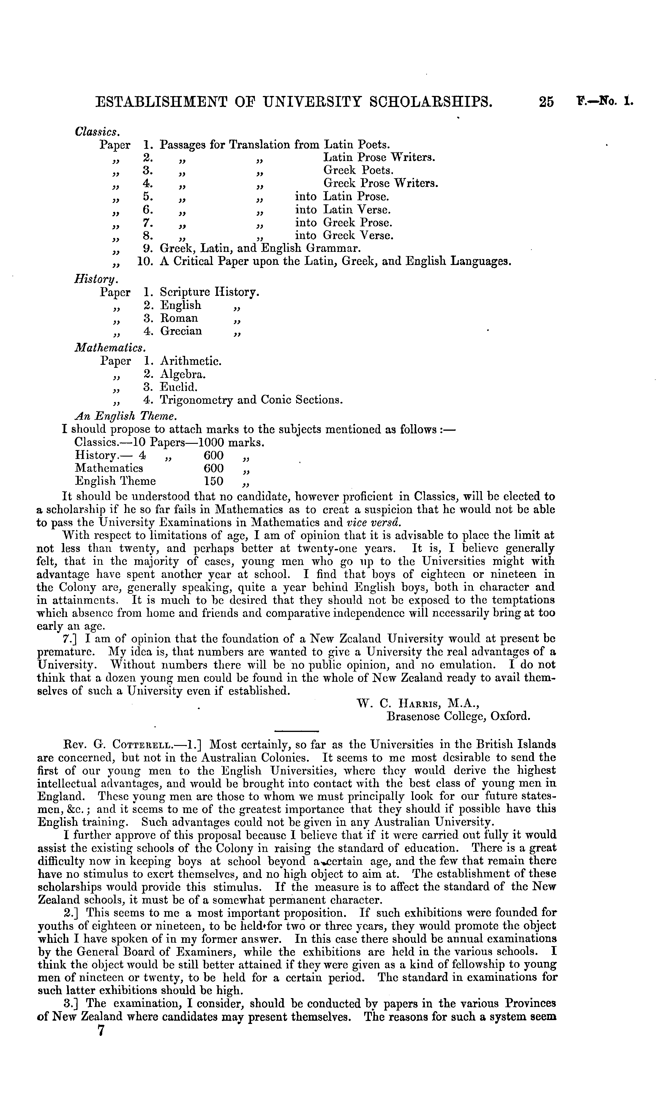 Classics. Paper 1. Passages for Translation from Latin Poets. „ 2. „ „ Latin Prose Writers. „ 3. „ „ Greek Poets. „ 4. „ „ Greek Prose Writers. „ 5. „ „ into Latin Prose. „ 6. „ „ into Latin Verse. „ 7. „ „ into Greek Prose. „ 8. „ „ into Greek Verse. „ 9. Greek, Latin, and English Grammar. „ 10. A Critical Paper upon the Latin, Greek, and English Languages. History. Paper 1. Scripture History. 2. English „ 3. Roman „ „ 4. Grecian „ Mathematics. Paper 1. Arithmetic. „ 2. Algebra. „ 3. Euclid. ~ 4. Trigonometry and Conic Sections. An English Theme. I should propose to attach marks to the subjects mentioned as follows : — Classics. —10 Papers—looo marks. History.— 4 „ 600 „ Mathematics 600 „ English Theme 150 „ It should be understood that no candidate, however proficient in Classics, will be elected to a scholarship if he so far fails in Mathematics as to creat a suspicion that he would not be able to pass the University Examinations in Mathematics and vice versa. With respect to limitations of age, I am of opinion that it is advisable to place the limit at not less than twenty, and perhaps better at twenty-one years. It is, I believe generally felt, that in the majority of cases, young men who go up to the Universities might with advantage have spent another year at school. I find that boys of eighteen or nineteen in the Colony are, generally speaking, quite a year behind English boys, both in character and in attainments. It is much to be desired that they should not be exposed to the temptations which absence from home and friends and comparative independence will necessarily bring at too early an age. 7.] I am of opinion that the foundation of a New Zealand University would at present be premature. My idea is, that numbers are wanted to give a University the real advantages of a University. Without numbers there will be no public opinion, and no emulation. Ido not think that a dozen young men could be found in the whole of New Zealand ready to avail themselves of such a University even if established. W. C. Harris, M.A., Brasenose College, Oxford.