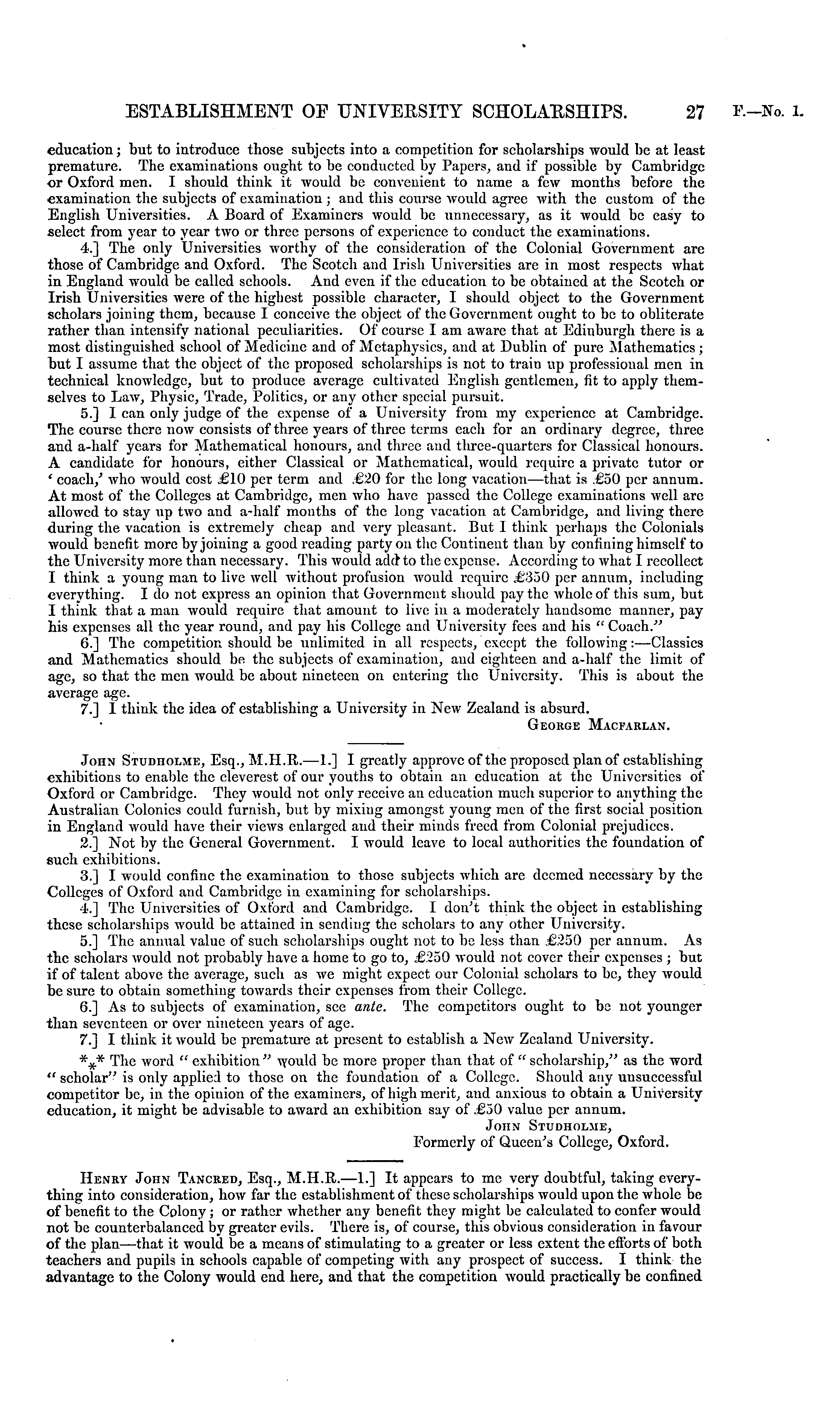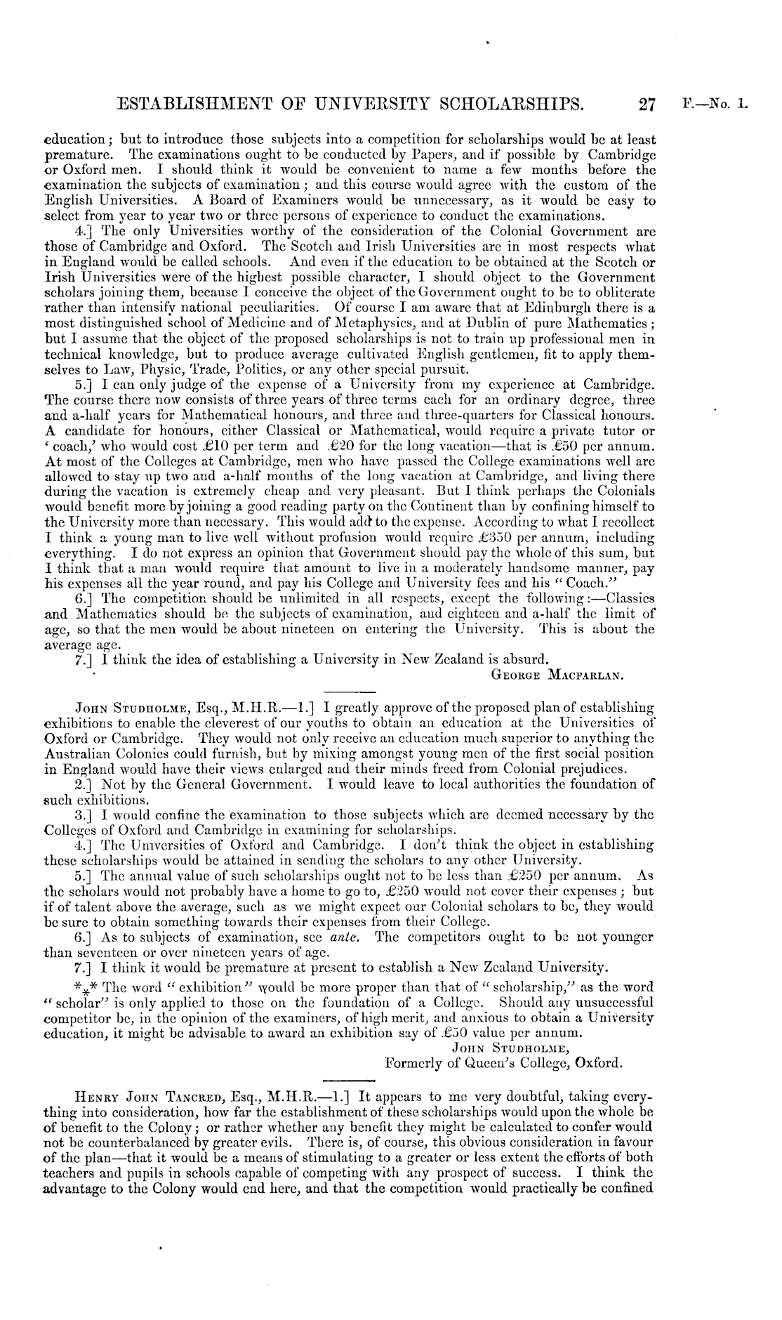 John Studhomie, Esq., M.H.R. —I.] I greatly approve of the proposed plan of establishing exhibitions to enable the cleverest of our youths to obtain an education at the Universities of Oxford or Cambridge. They would not only receive an education much superior to anything the Australian Colonies could furnish, but by mixing amongst young men of the first social position in England would have their views enlarged and their minds freed from Colonial prejudices. 2.] Not by the General Government. I would leave to local authorities the foundation of such exhibitions. 3.] I would confine the examination to those subjects which are deemed necessary by the Colleges of Oxford and Cambridge in examining for scholarships. •A.] The Universities of Oxford and Cambridge. I don't think the object in establishing these scholarships would be attained in sending the scholars to any other University. 5.] The annual value of such scholarships ought not to be less than £.250 per annum. As the scholars would not probably have a home to go to, £.250 would not cover their expenses ; but if of talent above the average, such as we might expect our Colonial scholars to be, they would be sure to obtain something towards their expenses from their College. G.] As to subjects of examination, sec ante. The competitors ought to bs not younger than seventeen or over nineteen years of age. 7.] I think it would be premature at present to establish a New Zealand University. *a* The word " exhibition" would be more proper than that of "scholarship," as the word " scholar" is only applied to those on the foundation of a College. Should any unsuccessful competitor be, in the opinion of the examiners, of high merit, and anxious to obtain a University education, it might be advisable to award an exhibition say of £50 value per annum. John Studholjie, Formerly of Queen's College, Oxford.