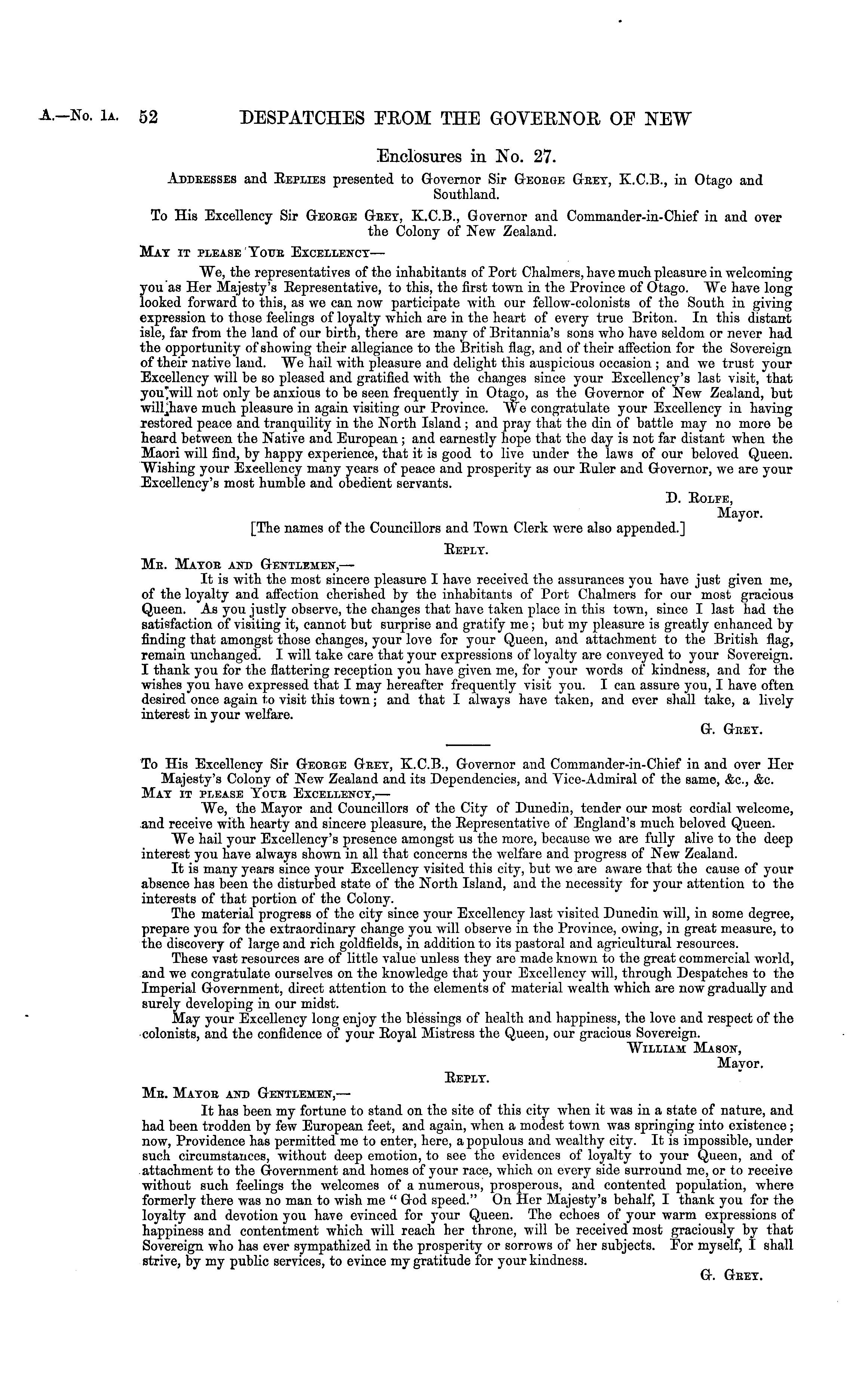 To His Excellency Sir George Gret, K.C.8., Governor and Commander-in-Chief in and over Her Majesty's Colony of New Zealand and its Dependencies, and Vice-Adiniral of the same, &c, &c. Mat it please Your Excellenct, — We, the Mayor and Councillors of the City of Dunedin, tender our most cordial welcome, and receive with hearty and sincere pleasure, tho Bepresentative of England's much beloved Queen. We hail your Excellency's presence amongst us the more, because we are fully alive to the deep interest you have always shown in all that concerns the welfare and progress of New Zealand. It is many years since your Excellency visited this city, but we are aware that the cause of your absence has been the disturbed state of the North Island, and the necessity for your attention to the interests of that portion of the Colony. The material progress of the city since your Excellency last visited Dunedin will, in some degree, prepare you for the extraordinary change you will observe in the Province, owing, in great measure, to the discovery of large and rich goldfields, in addition to its pastoral and agricultural resources. These vast resources are of little value unless they are made known to the great commercial world, and we congratulate ourselves on the knowledge that your Excellency will, through Despatches to the Imperial Government, direct attention to the elements of material wealth which are now gradually and surely developing in our midst. May your Excellency long enjoy the blessings of health and happiness, the love and respect of the colonists, and the confidence of your Boyal Mistress the Queen, our gracious Sovereign. William Mason, Mayor. Beplt. Mr. Mator and Gentlemen, — It has been my fortune to stand on the site of this city when it was in a state of nature, and had been trodden by few European feet, and again, when a modest town was springing into existence; now, Providence has permitted me to enter, here, a populous and wealthy city. It is impossible, under such circumstances, without deep emotion, to see the evidences of loyalty to your Queen, and of attachment to the Government and homes of your race, which on every side surround me, or to receive without such feelings the welcomes of a numerous, prosperous, and contented population, where formerly there was no man to wish me " God speed." On Her Majesty's behalf, I thank you for tho loyalty and devotion you have evinced for your Queen. The echoes of your warm expressions of happiness and contentment which will reach her throne, will be received most graciously by that Sovereign who has ever sympathized in the prosperity or sorrows of her subjects. For myself, I shall strive, by my public services, to evince my gratitude for your kindness. G. Gret.