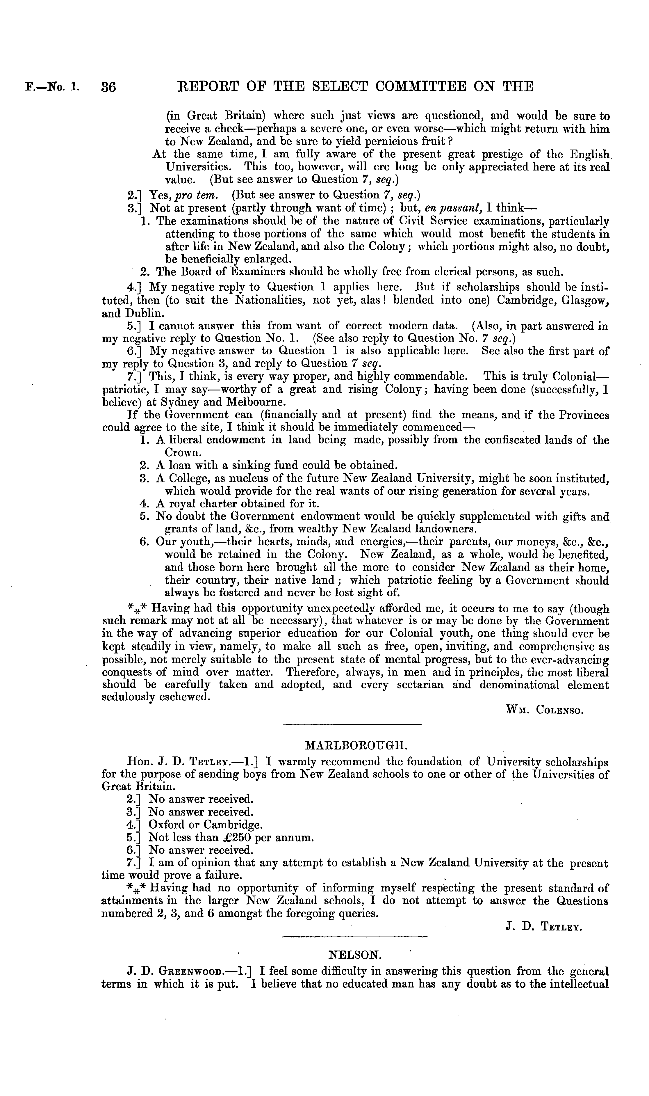 MAKLBOEOTTG-H. Hon. J. D. Tetley.—l.] I warmly recommend the foundation of University scholarships for the purpose of sending boys from New Zealand schools to one or other of the Universities of Great Britain. 2.] No answer received. 3. No answer received. 4. Oxford or Cambridge. 5. Not less than £250 per annum. 6.] No answer received. 7.] I am of opinion that any attempt to establish a New Zealand University at the present time would prove a failure. *.£* Having had no opportunity of informing myself respecting the present standard of attainments in the larger New Zealand schools, I do not attempt to answer the Questions numbered 2, 3, and 6 amongst the foregoing queries. J. D. Tetley.