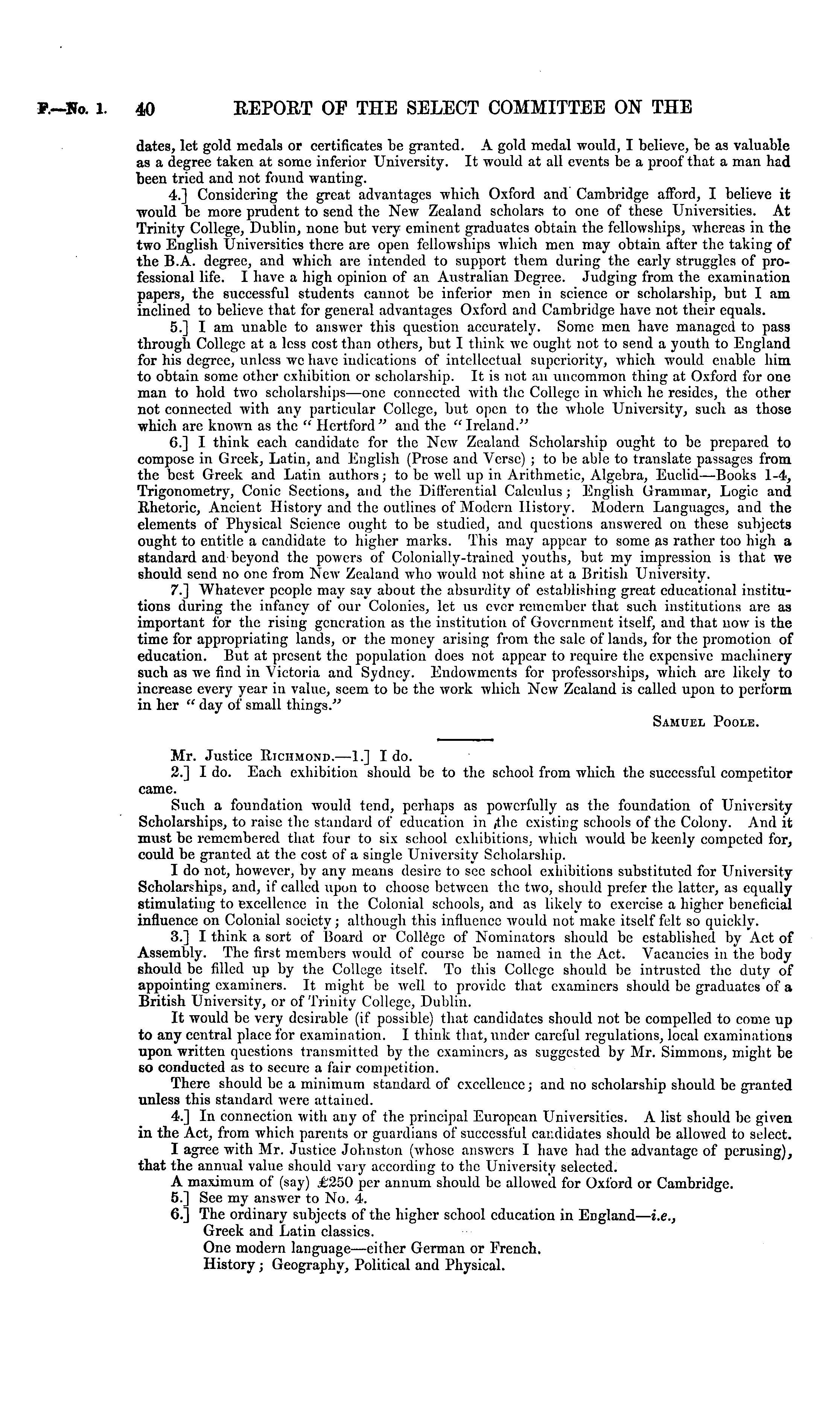 Mr. Justice Uiciimond.—l.] I do. 2.] I do. Each exhibition should be to the school from which the successful competitor came. Such a foundation would tend, perhaps as powerfully as the foundation of University Scholarships, to raise the standard of education in ,the existing schools of the Colony. And it must be remembered that four to six school exhibitions, which would be keenly competed for, could be granted at the cost of a single University Scholarship. I do not, however, by any means desire to see school exhibitions substituted for University Scholarships, and, if called upon to choose between the two, should prefer the latter, as equally stimulating to excellence in the Colonial schools, and as likely to exercise a higher beneficial influence on Colonial society; although this influence would not make itself felt so quickly. 3.] I think a sort of Board or College of Nominators should be established by Act of Assembly. The first members would of course be named in the Act. Vacancies in the body should be filled up by the College itself. To this College should be intrusted the duty of appointing examiners. It might be well to provide that examiners should be graduates of a British University, or of Trinity College, Dublin. It would be very desirable (if possible) that candidates should not be compelled to come up to any central place for examination. I think that, under careful regulations, local examinations upon written questions transmitted by the examiners, as suggested by Mr. Simmons, might be so conducted as to secure a fair competition. There should be a minimum standard of excellence; and no scholarship should be granted unless this standard were attained. 4.] In connection with any of the principal European Universities. A list should he given in the Act, from which parents or guardians of successful car.didates should be allowed to select. I agree with Mr. Justice Johnston (whose answers I have had the advantage of perusing), that the annual value should vary according to the University selected. A maximum of (say) £250 per annum should be allowed for Oxford or Cambridge. 5.] See my answer to No. 4. 6.] The ordinary subjects of the higher school education in England— i.e., Greek and Latin classics. One modern language —cither German or French. History ; Geography, Political and Physical.